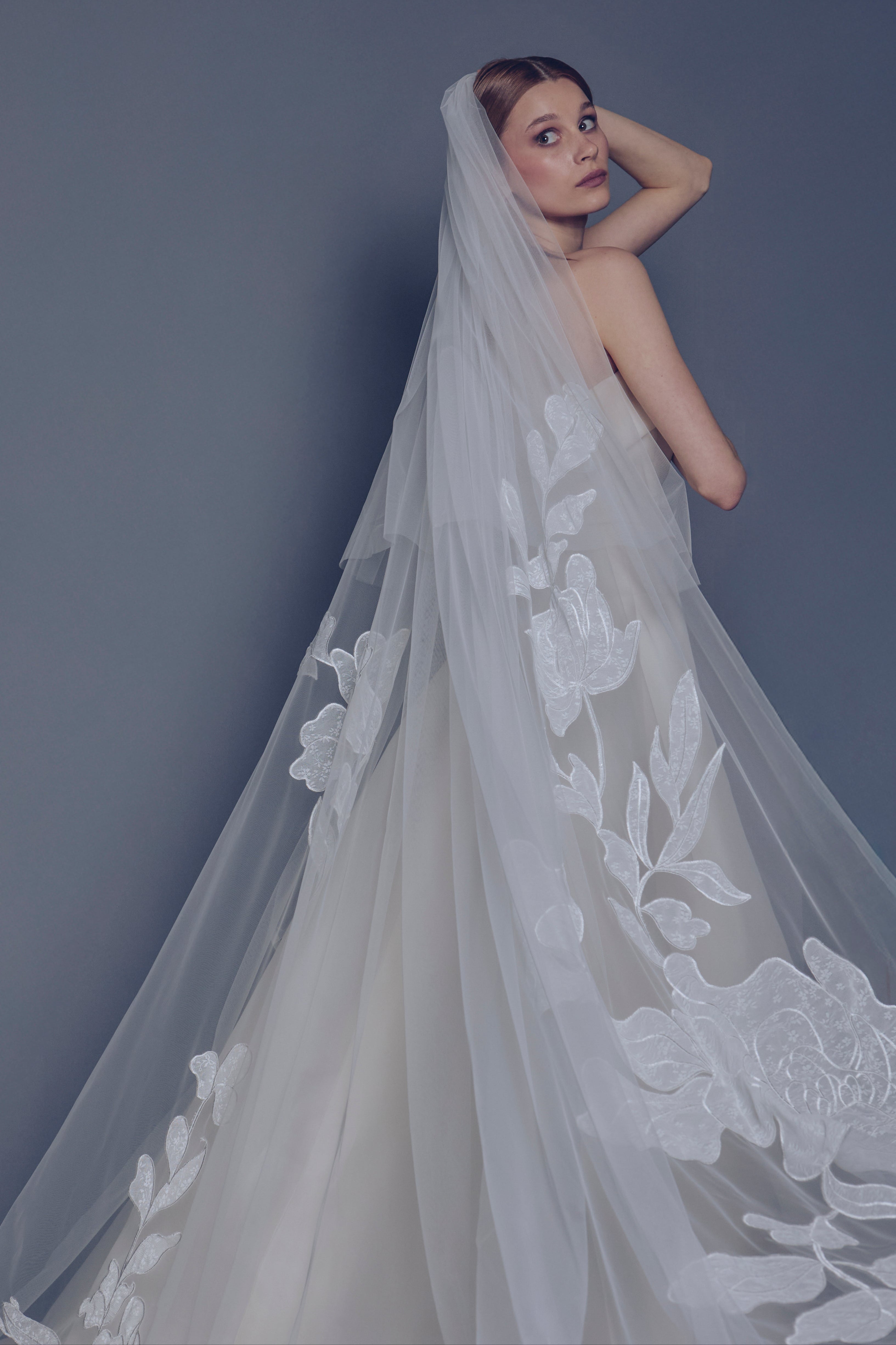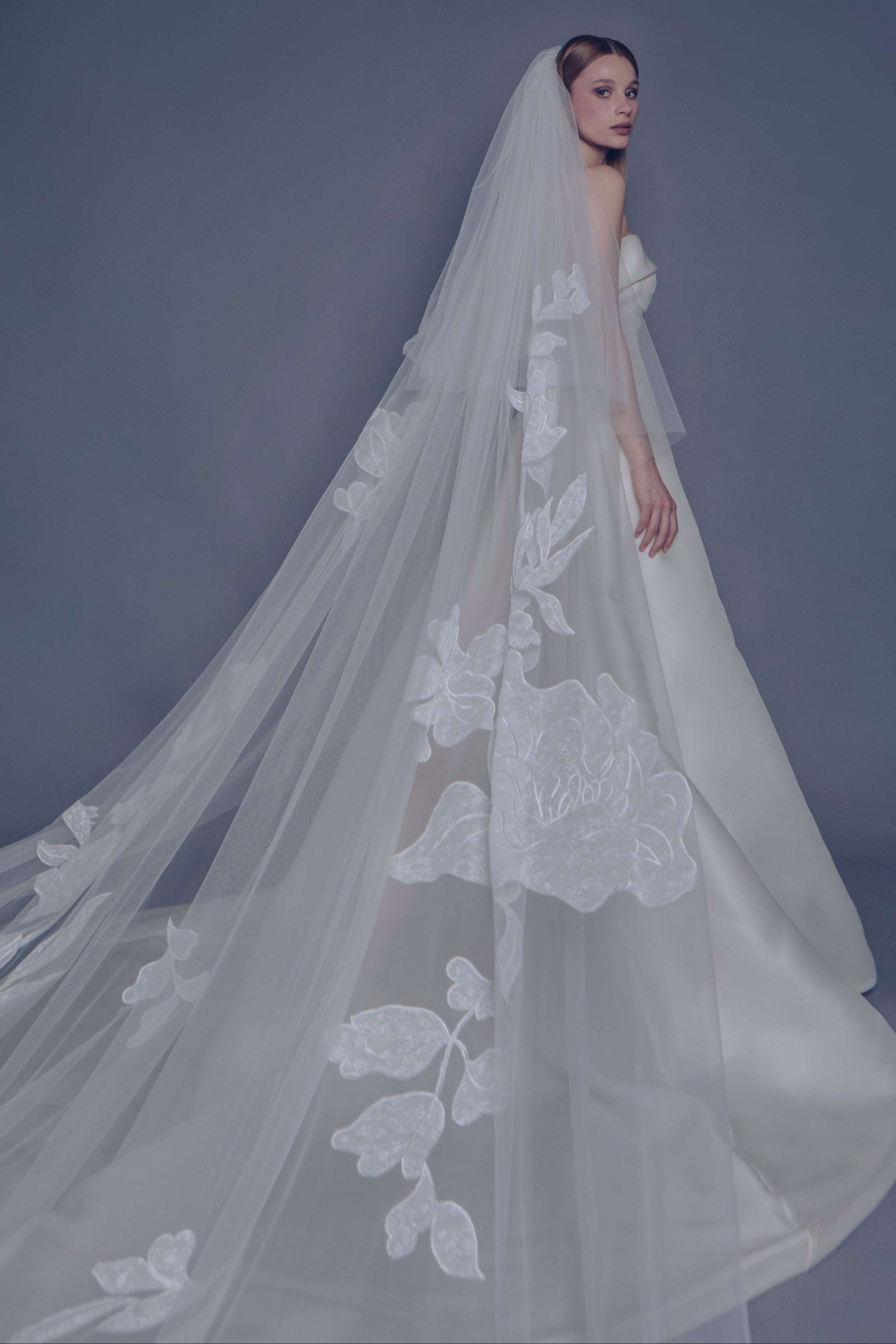 Velo lungo 3 metri in tulle con calata e maxi applicazioni floreali. Scenografico, leggero e poetico: il velo perfetto per valorizzare silhouette moderne con un tocco sognante.