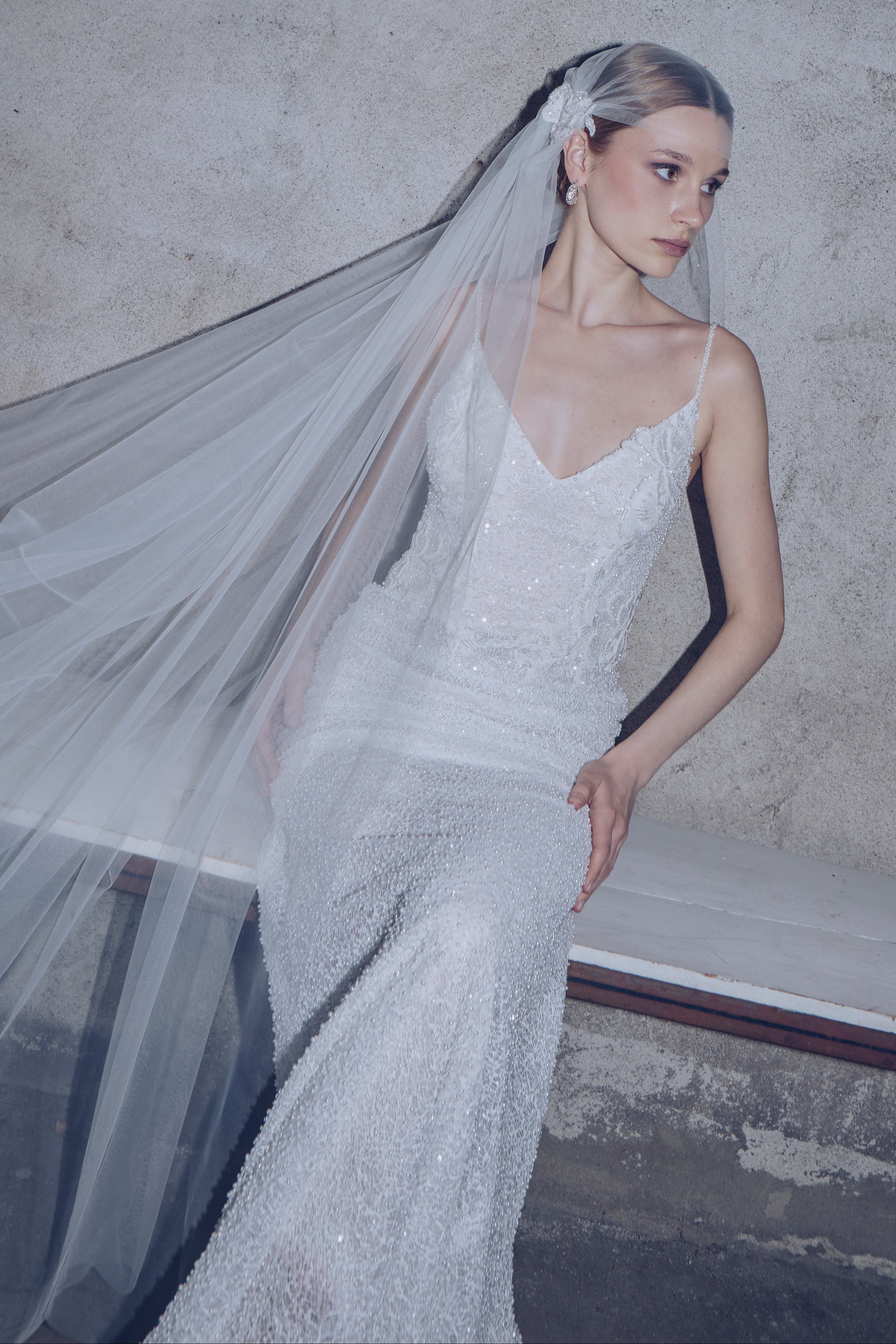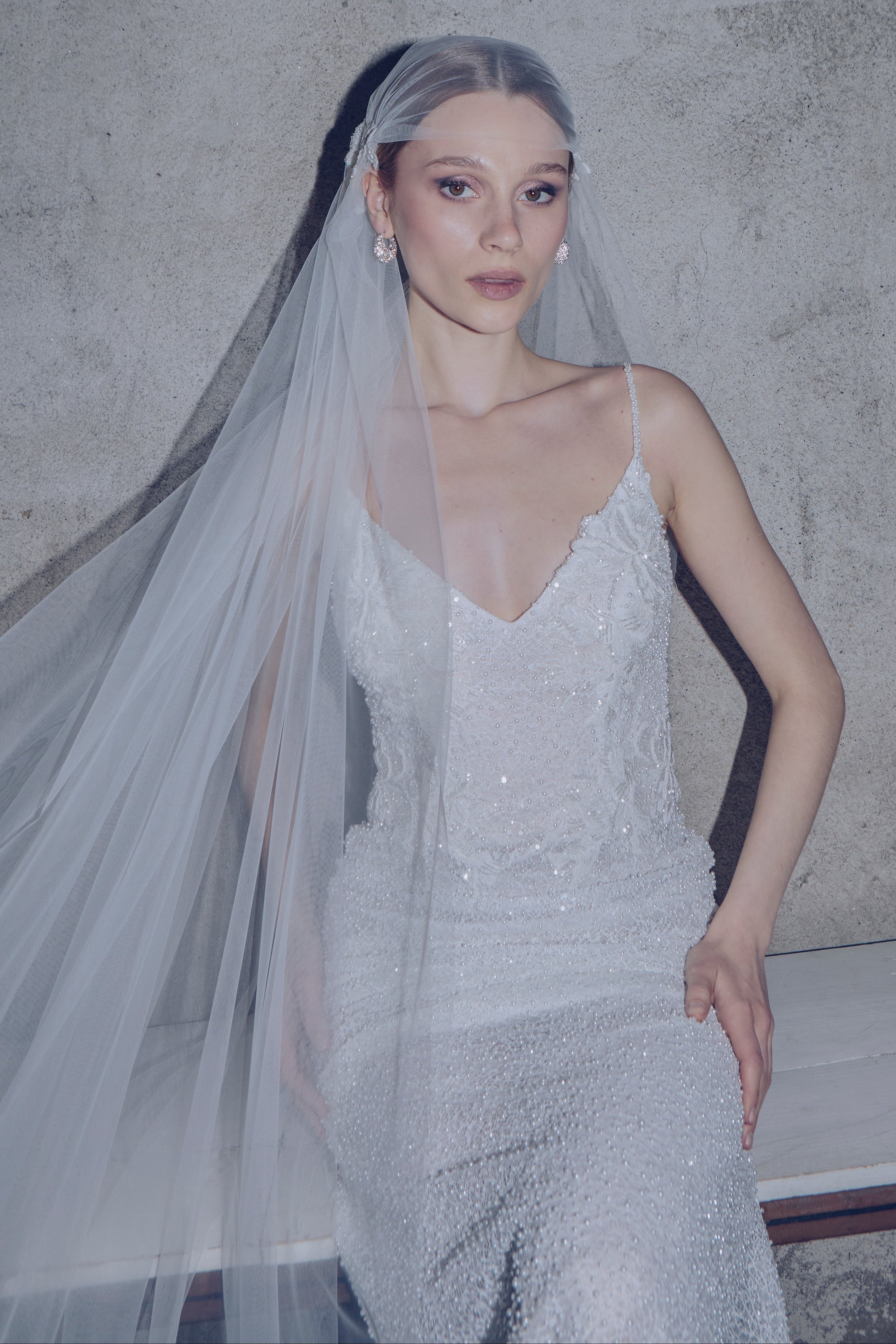 Velo lungo 3 metri in tulle con arriccio e applicazioni in pizzo ricamato. Perfetto per completare il look dell’abito con una proposta ricca di luce e romanticismo.