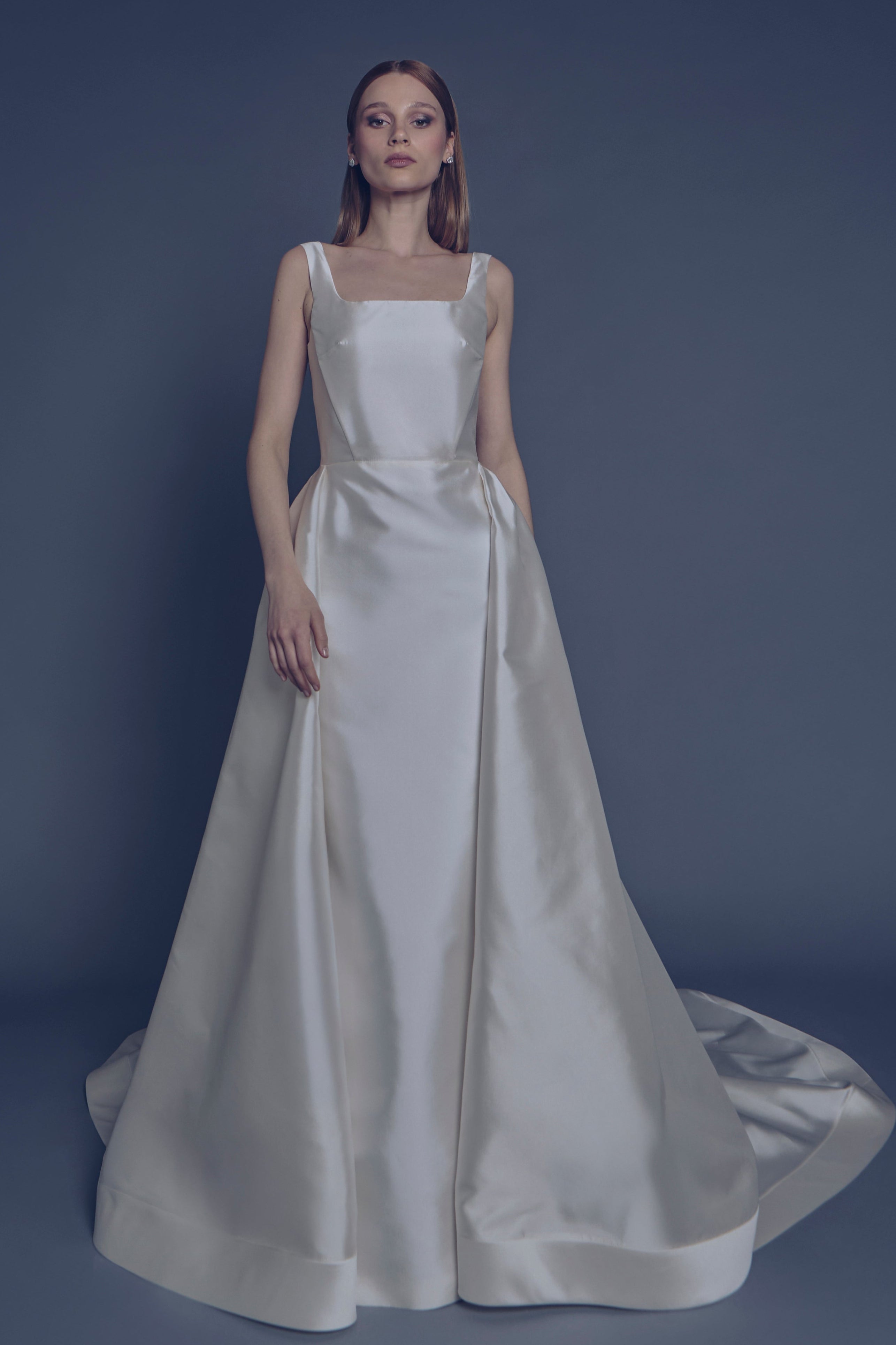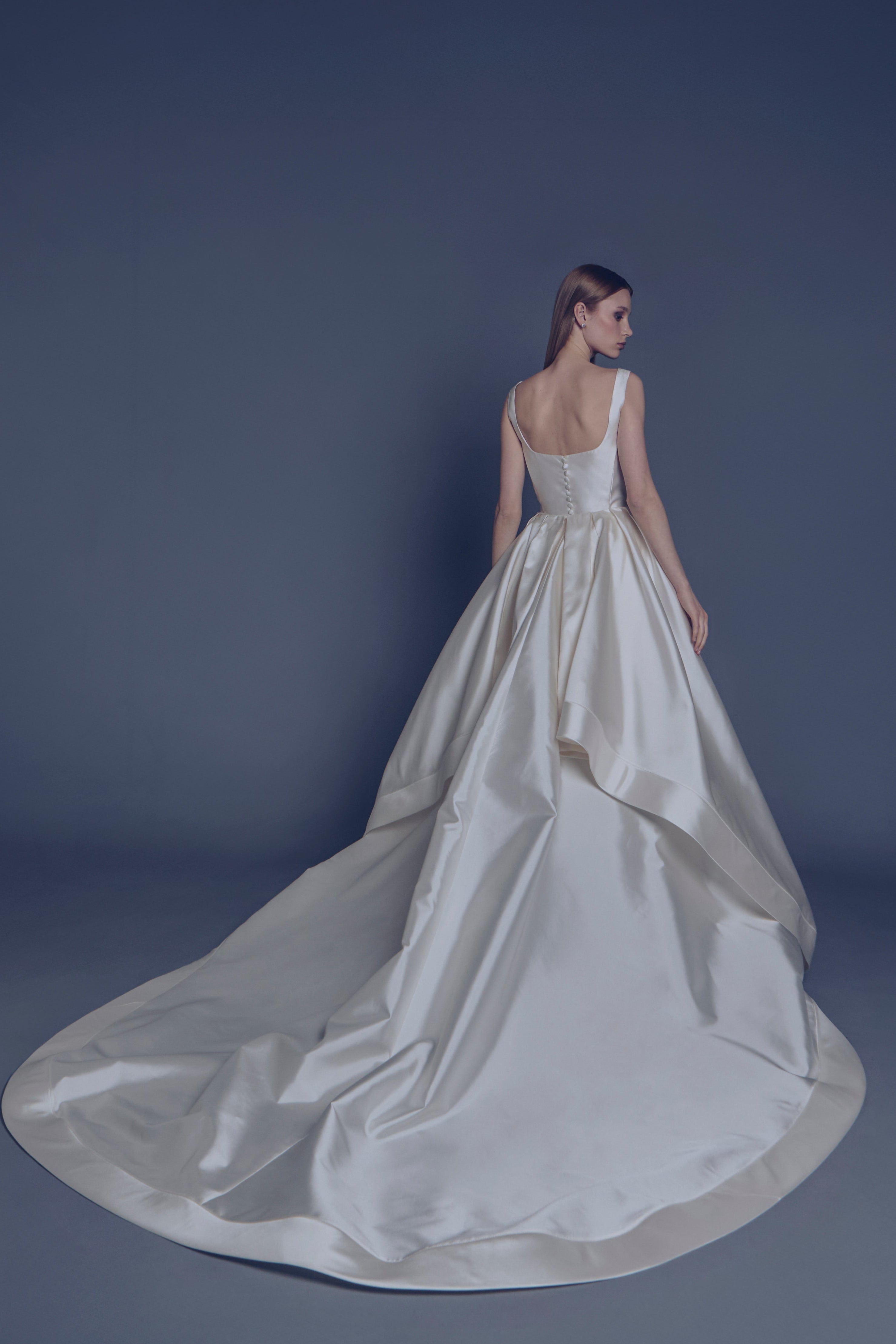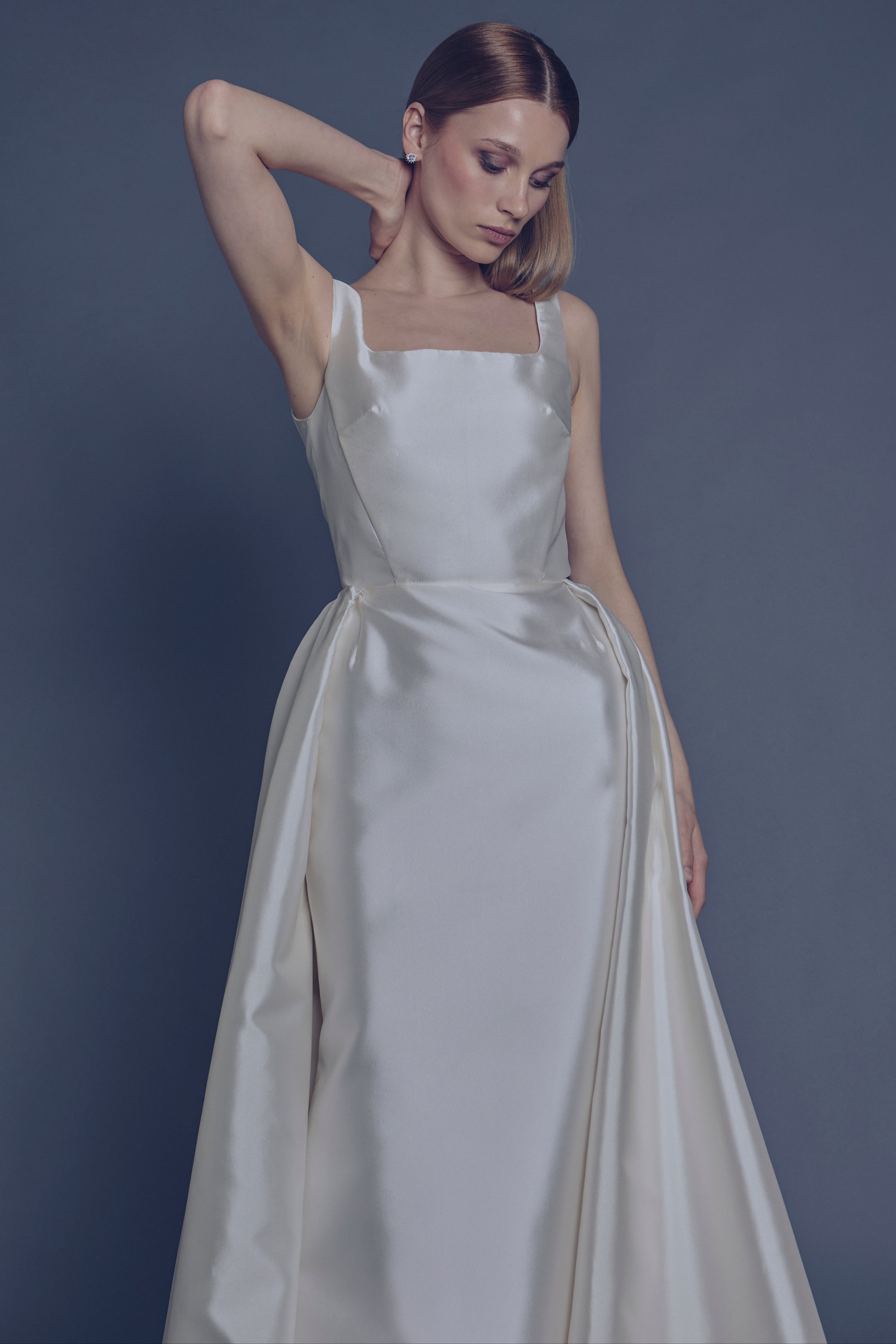 Silk blend mikado mermaid dress with softly structured bodice with a slit at center back. The elegance of the slim silhouette is transformed with a doubled-panel overskirt. A transformable model that combines purity and theatricality, with a 200 cm train length.