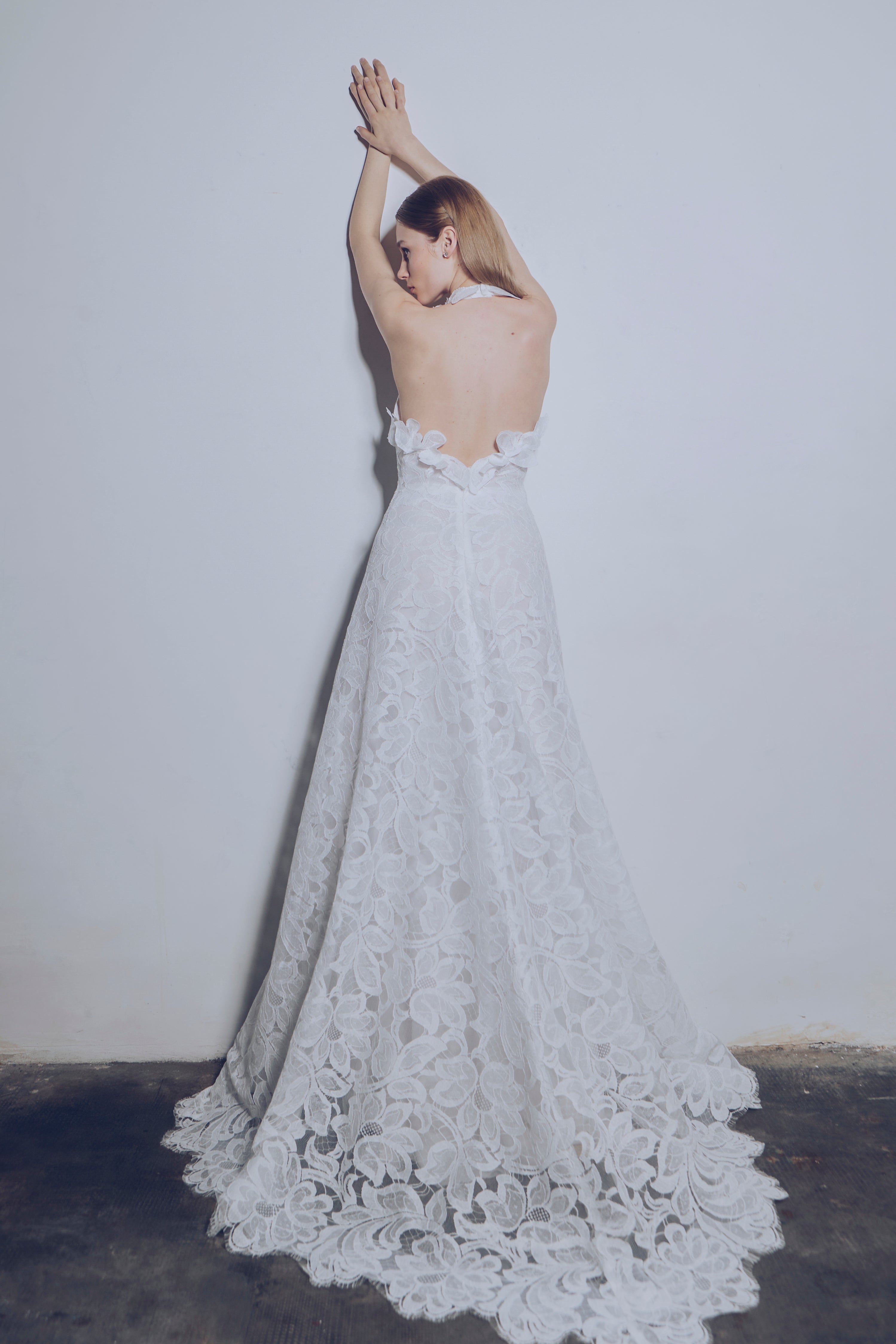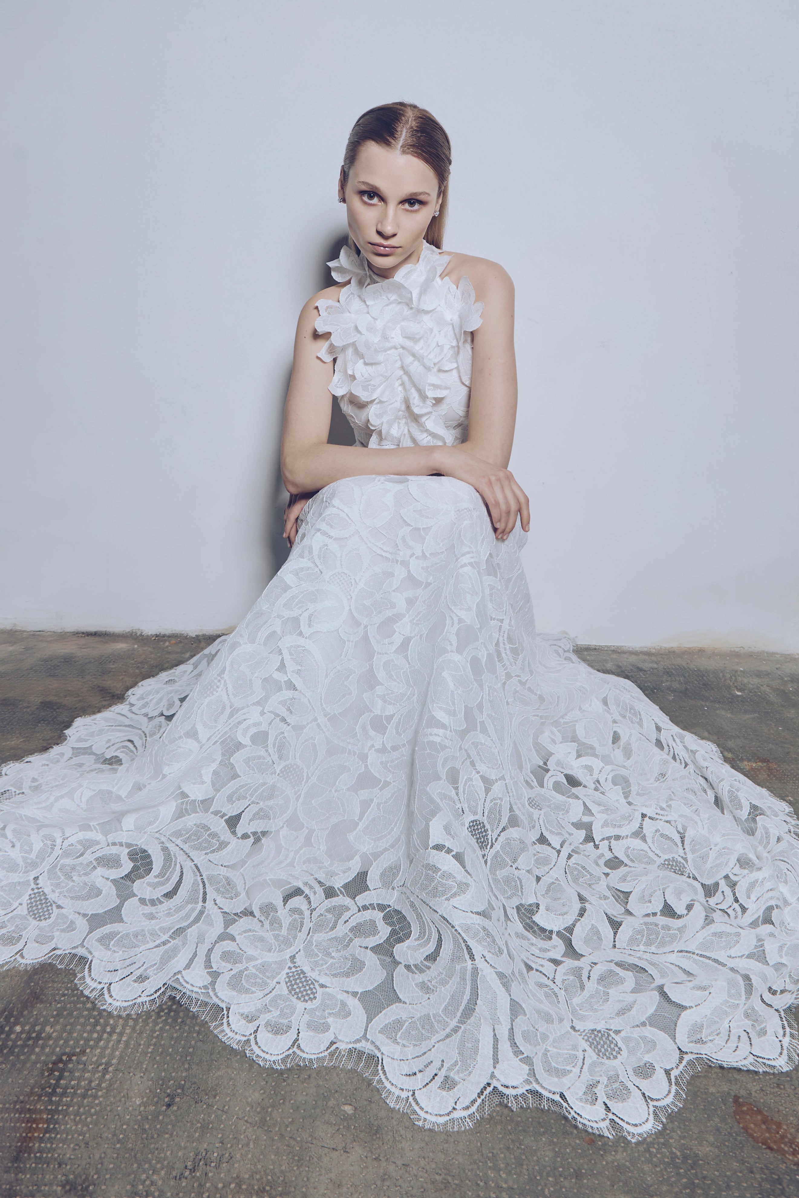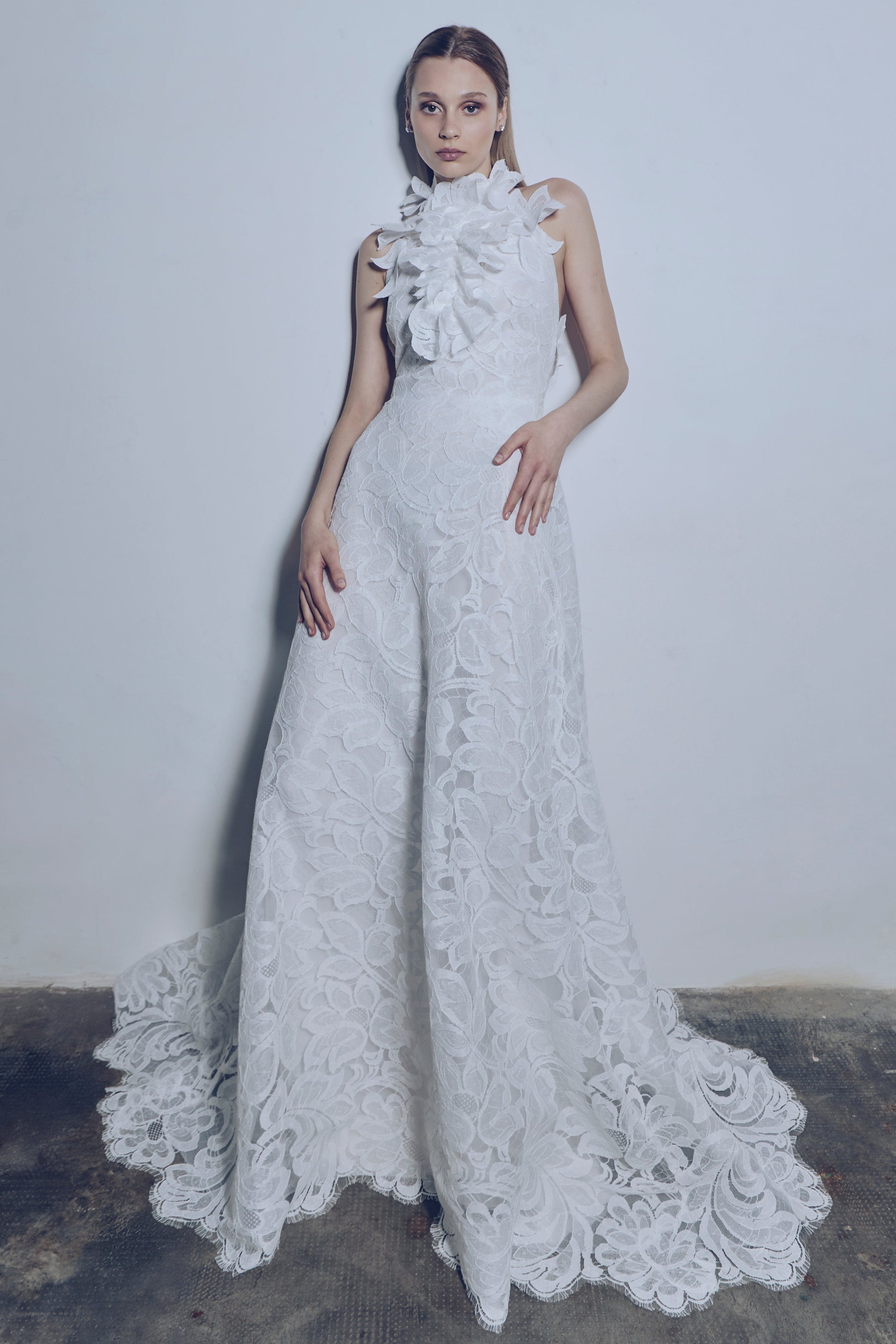 French cotton lace flow dress with neckline embellished with flounce and 3D flowers. The scalloped lace enhances the lightness of the model, completed with a 150 cm train length. Sought-after balance between romanticism and sensuality, with hand-executed appliqués.