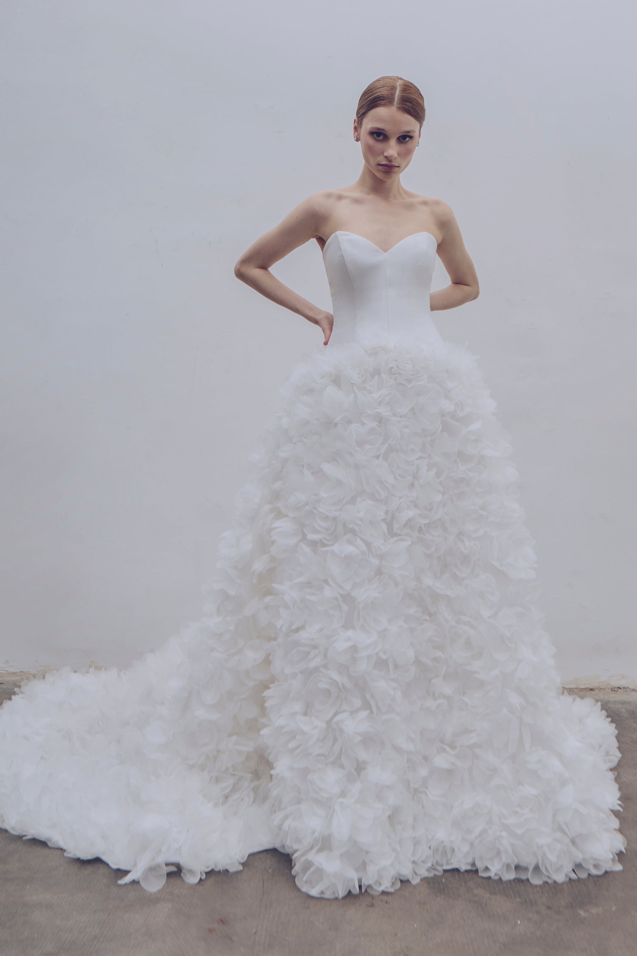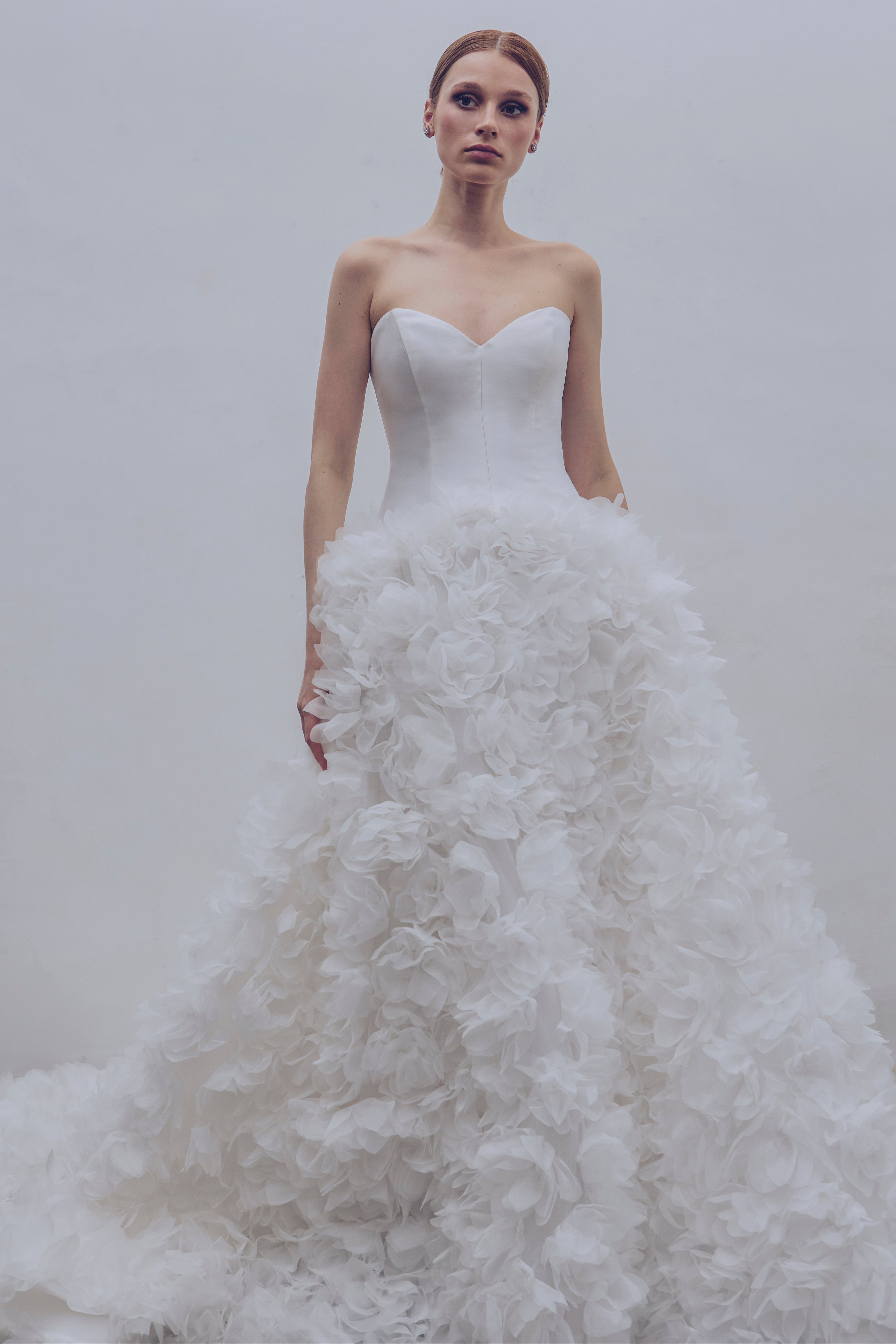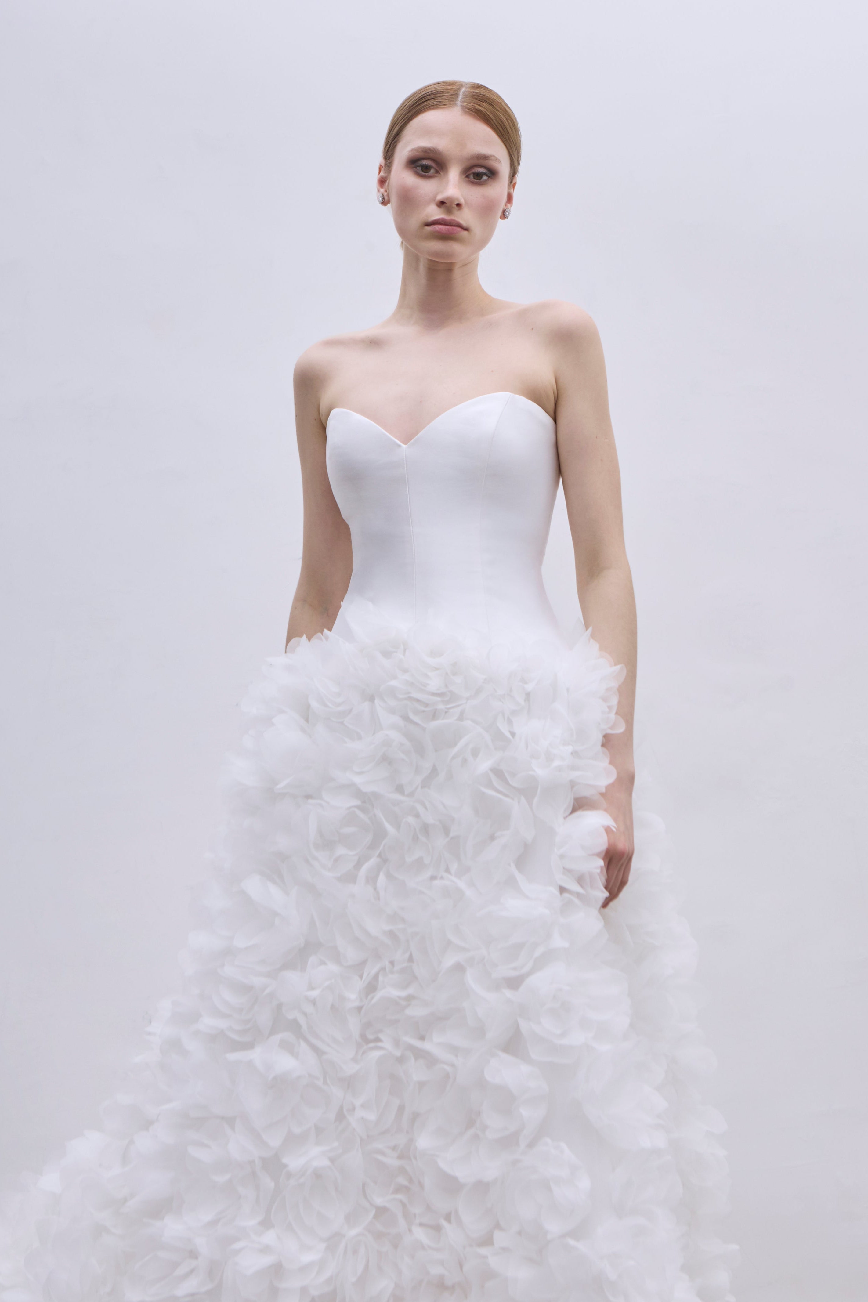 A-line romantic dress with drop waist structured corset in silk-blend mikado and tulle skirt embellished with 3D organza flowers. The low waist emphasizes the hip, slimming the figure, while the ethereal volume of the flowers creates a poetic contrast. 180 cm train length.