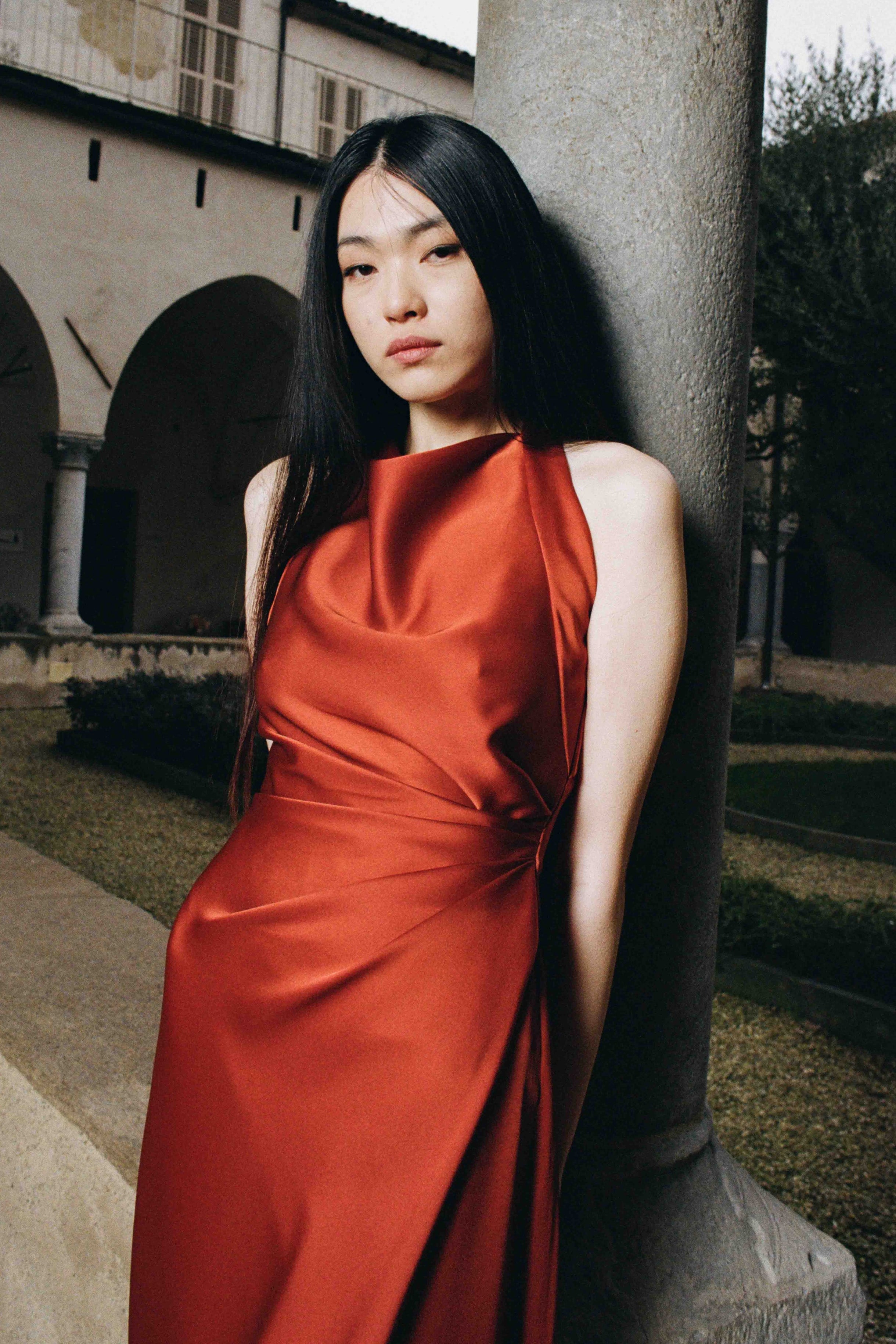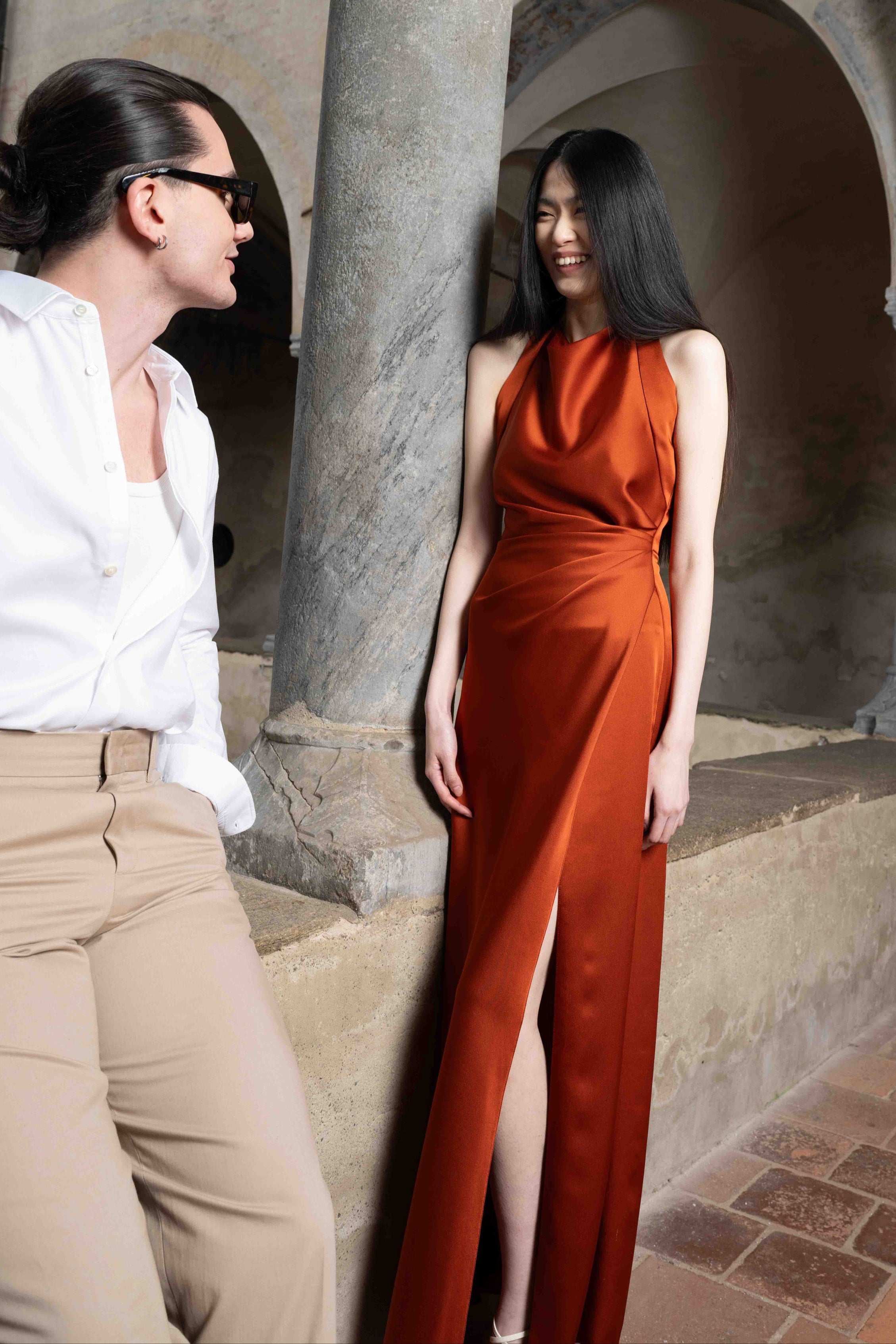 Camelia features a contemporary silhouette. The bodice gently envelops the figure with a soft plunging plunging neckline, while the back features a play of geometric bands in a sophisticated design. A delicate drape at the side enhances the waist, while the wrap-around slit gives movement and lightness to the skirt.