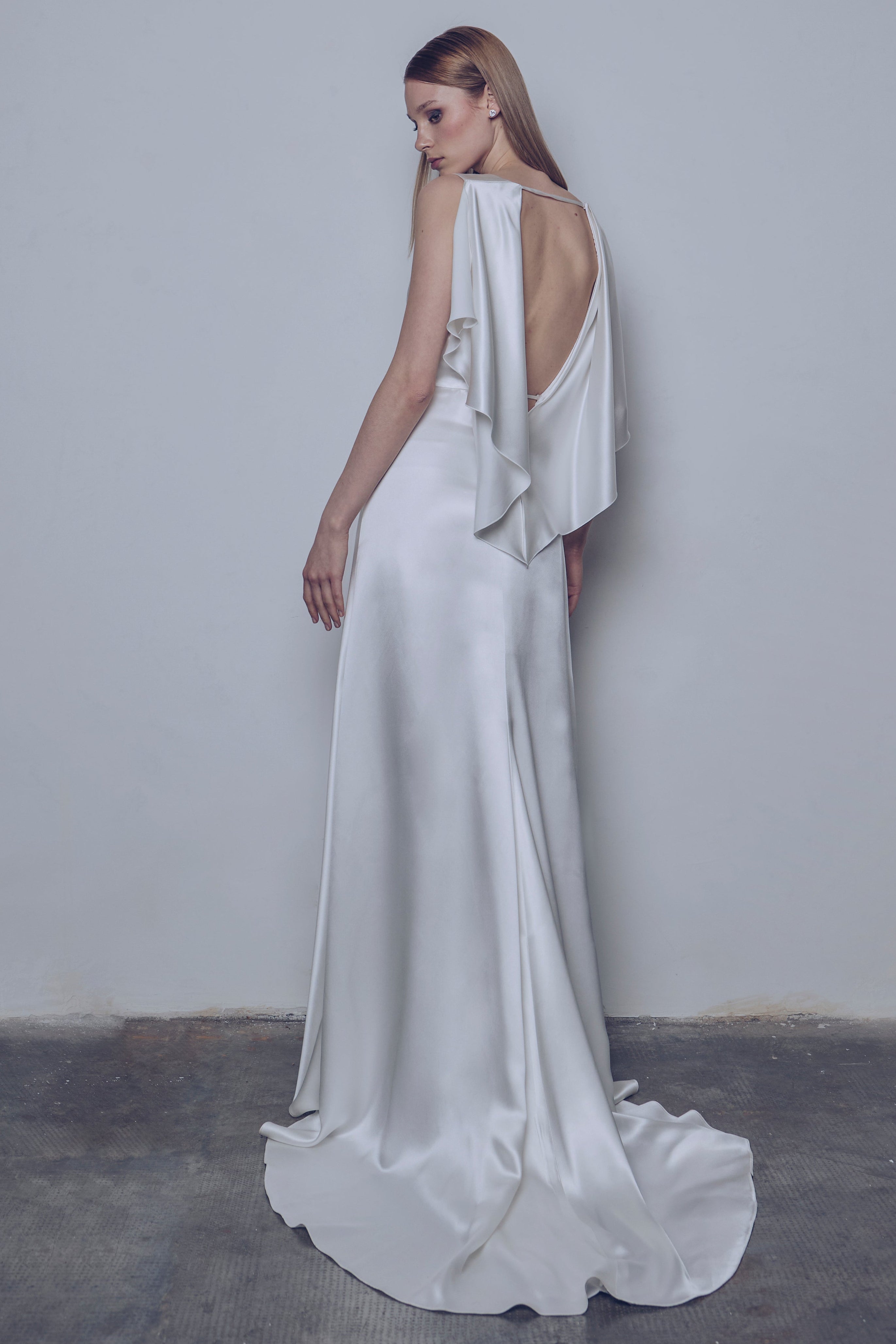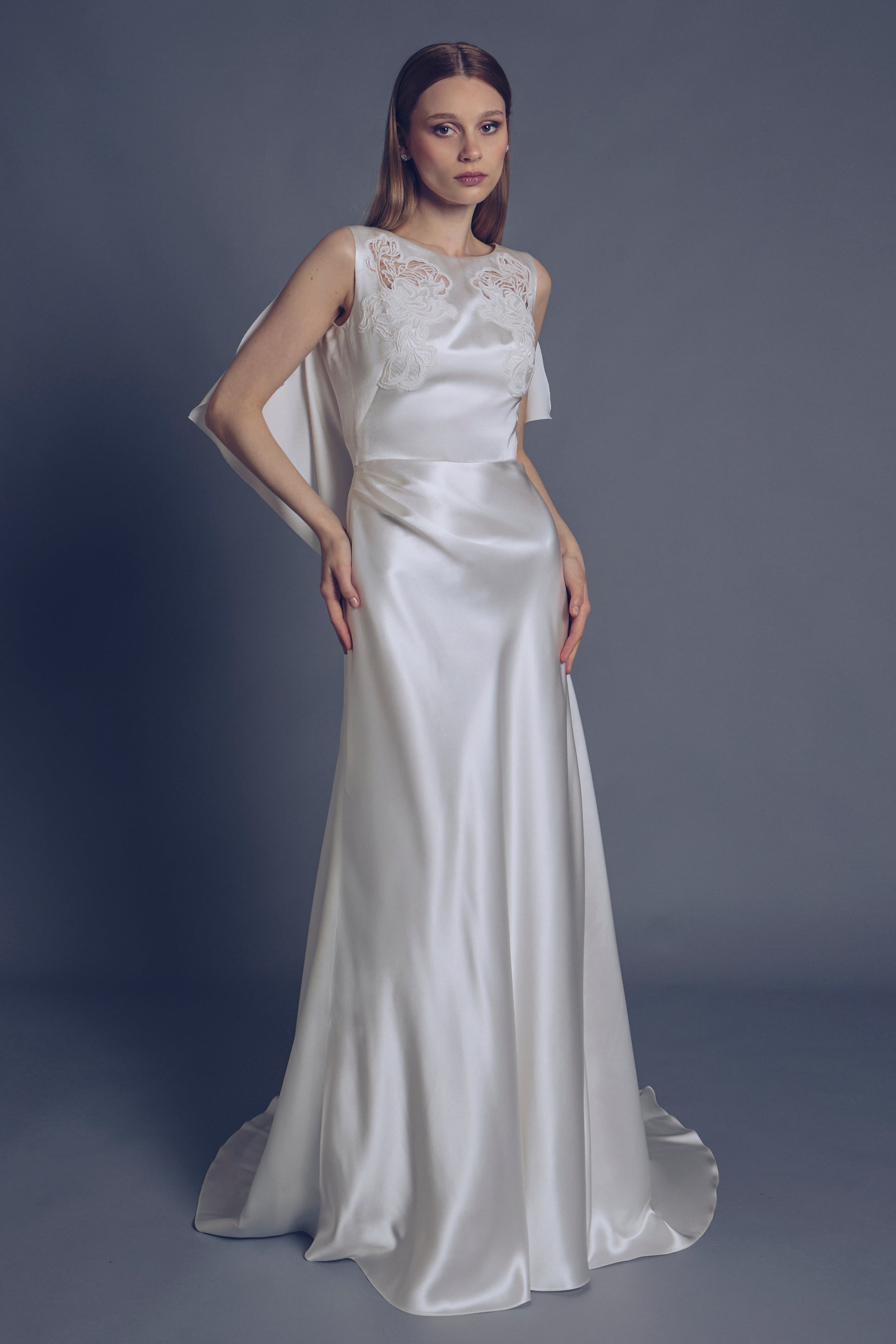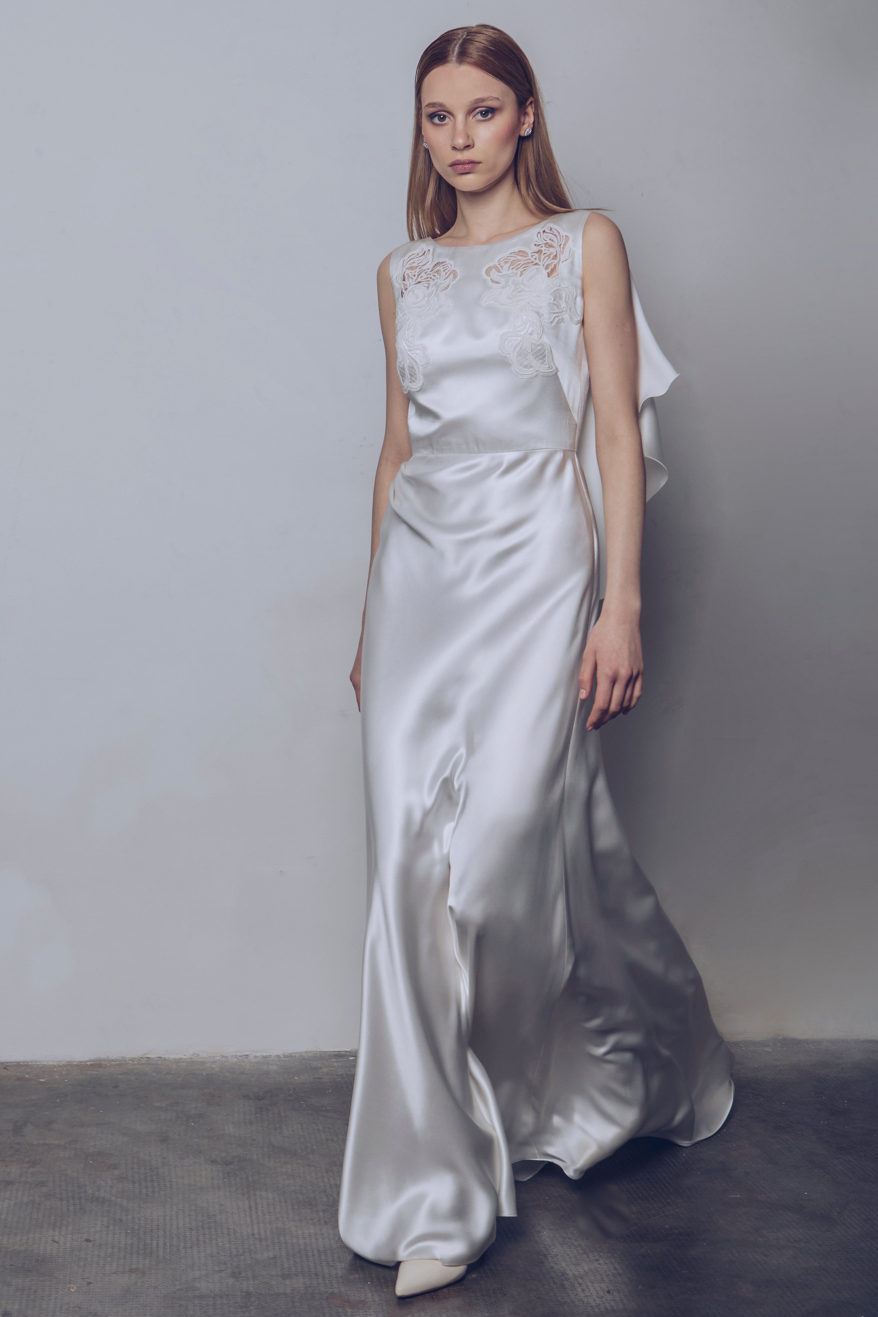 Flow dress in silk and viscose satin, with lace motif applied whit inlay technique. The essential cut is made dynamic by the deep neckline at the back, cape effect. A fluid and sophisticated silhouette with a 150 cm train length.