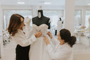 You don’t need to bring anything special: everything you need will already be provided at the atelier. Don’t worry about shoes—we’ll provide what you need to try on your dress. If you want to be prepared, we recommend wearing nude-colored underwear and bringing a simple hair tie for when you try on veils.