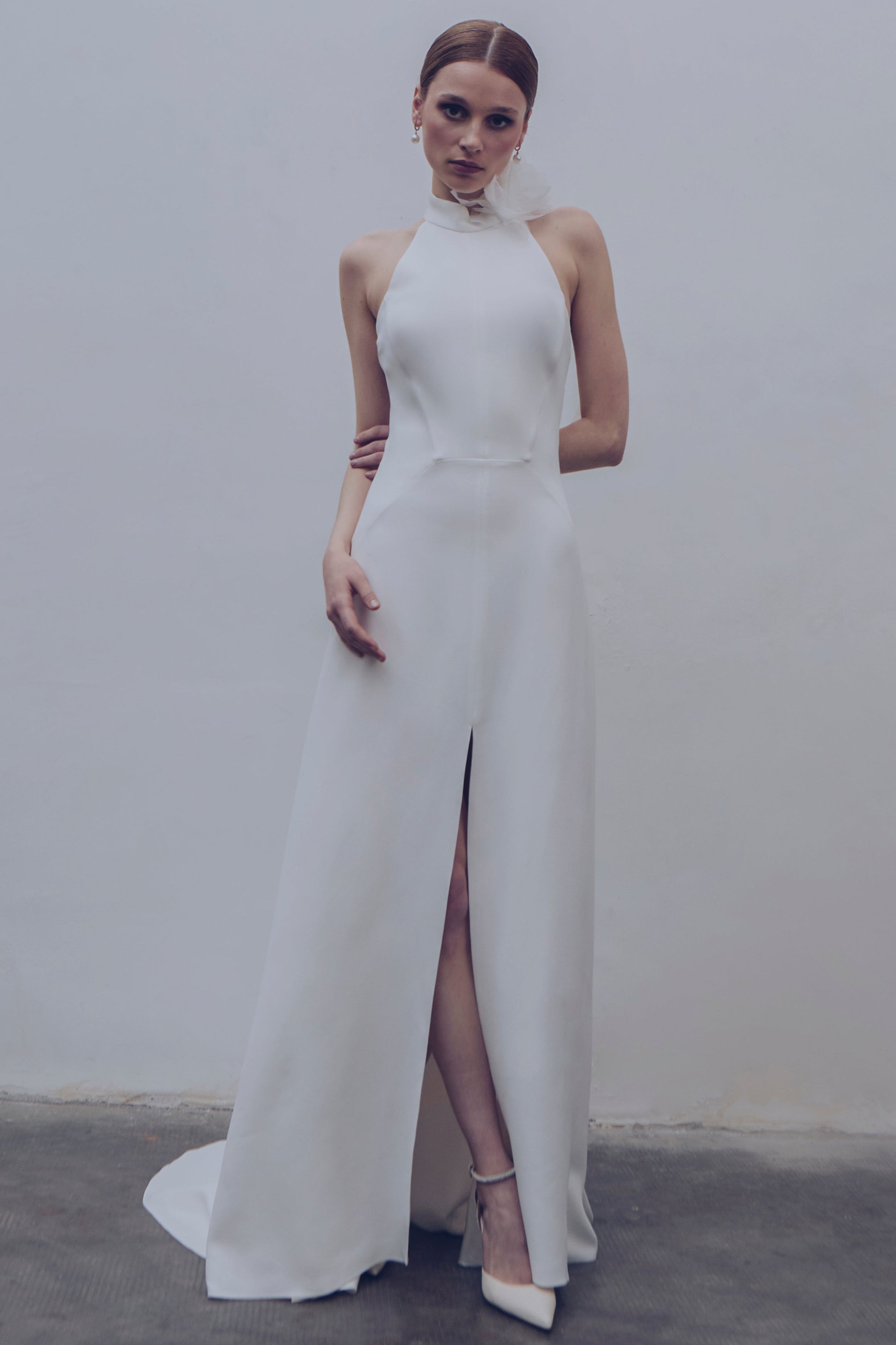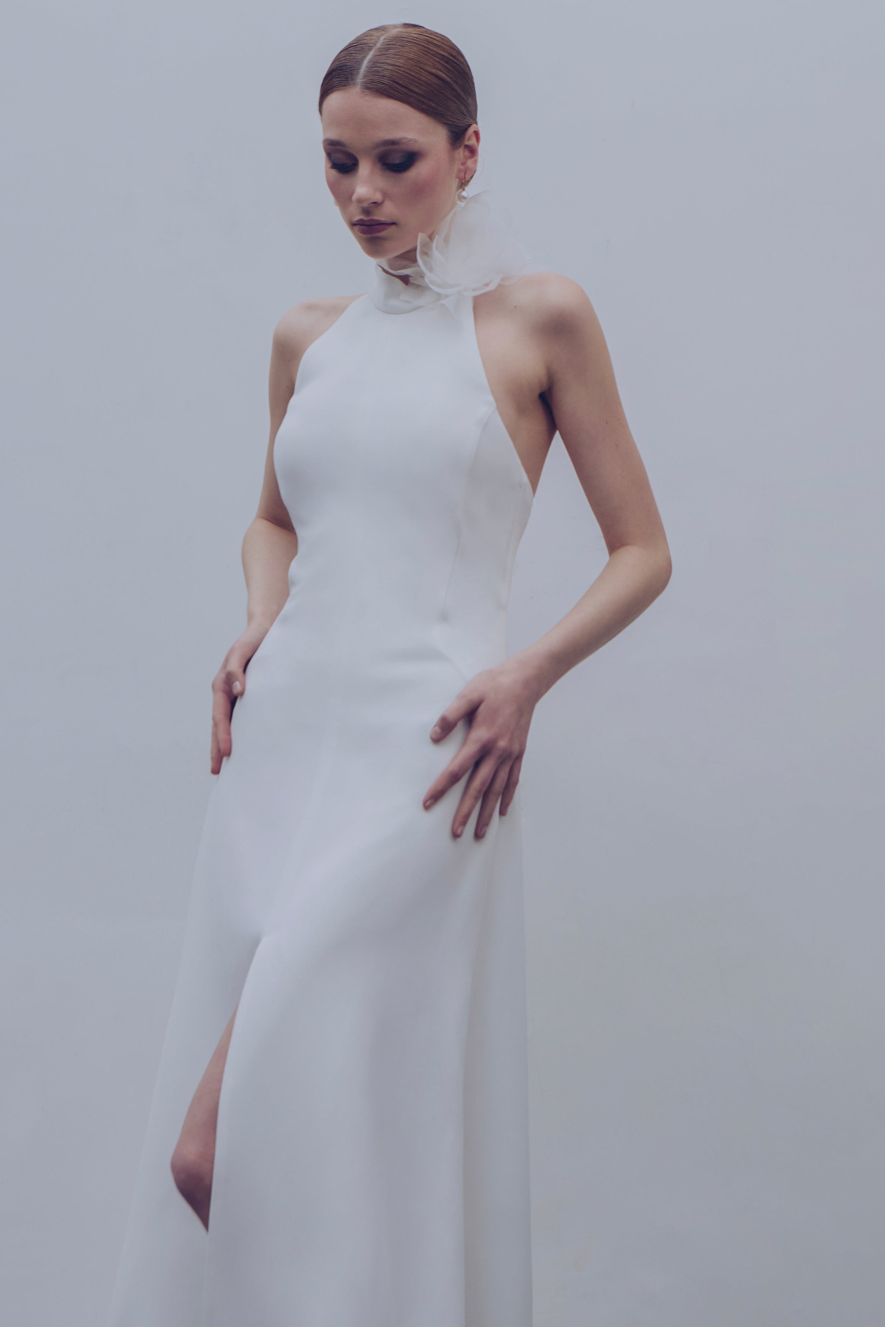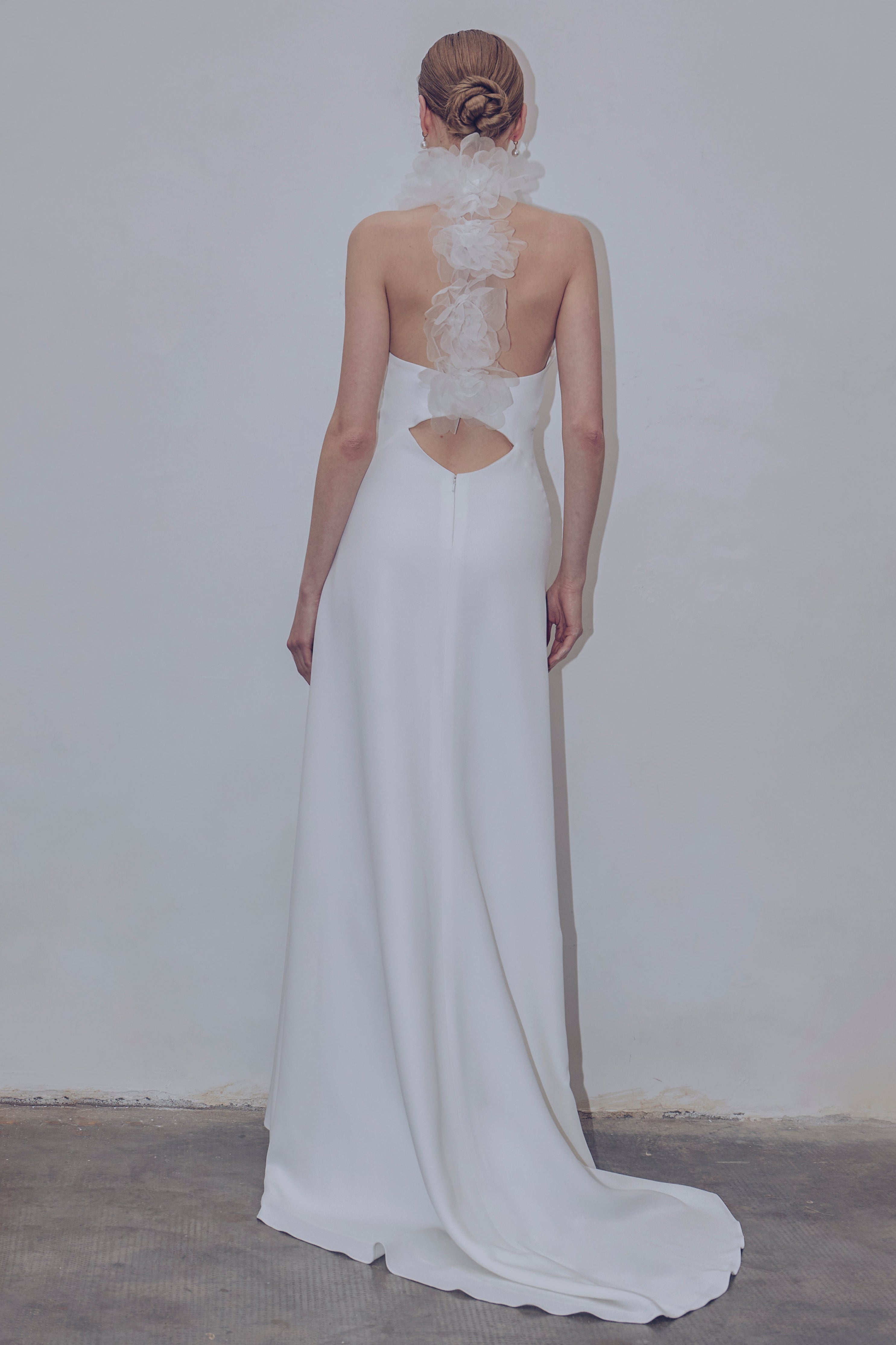 Viscose blend cady crepe flow dress with slit and softly structured bodice. An American-style collar frames the neckline, while the geometric porthole back is embellished with a line of 3D organza flowers. Sophisticated and sensual, with a 150 cm train length.