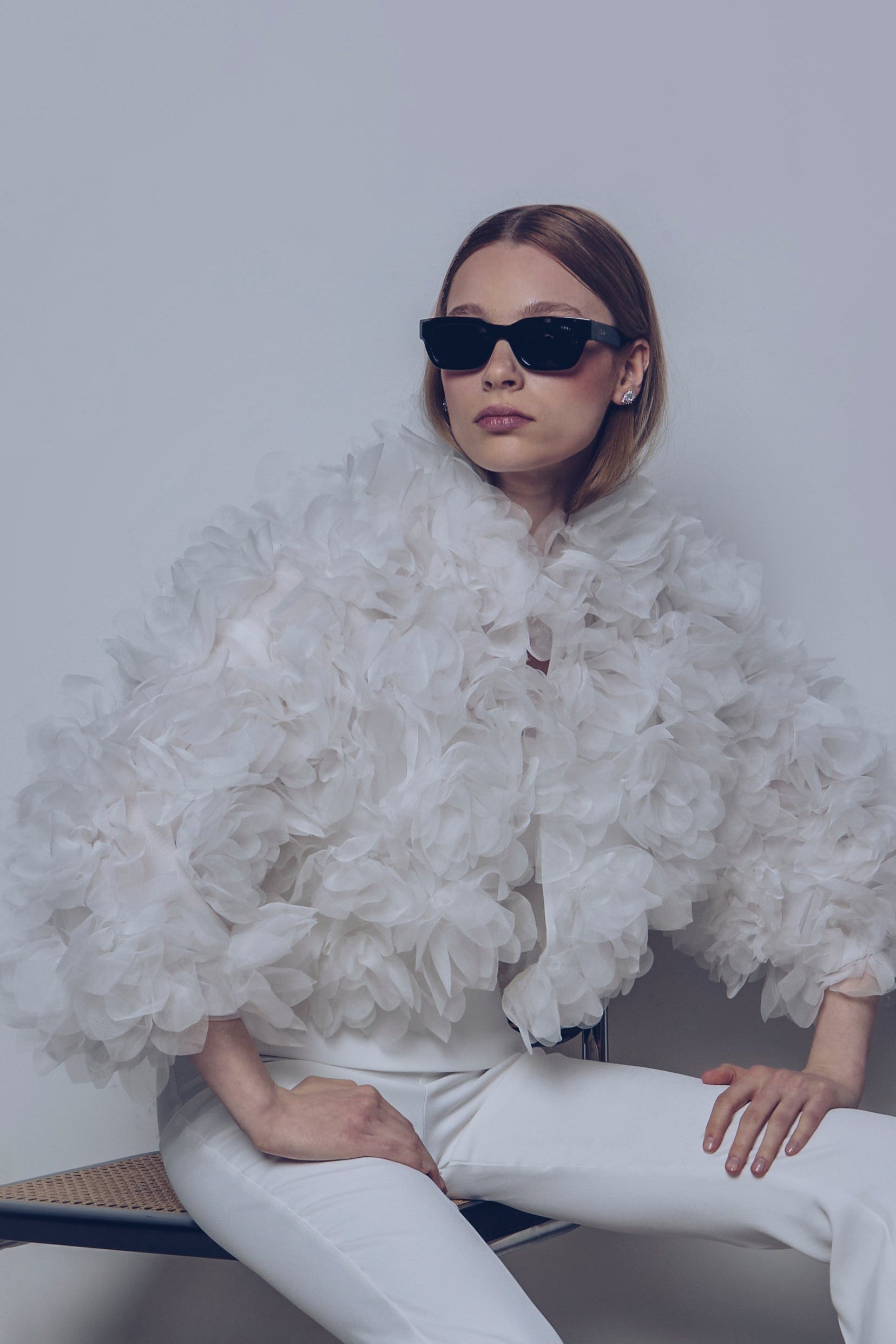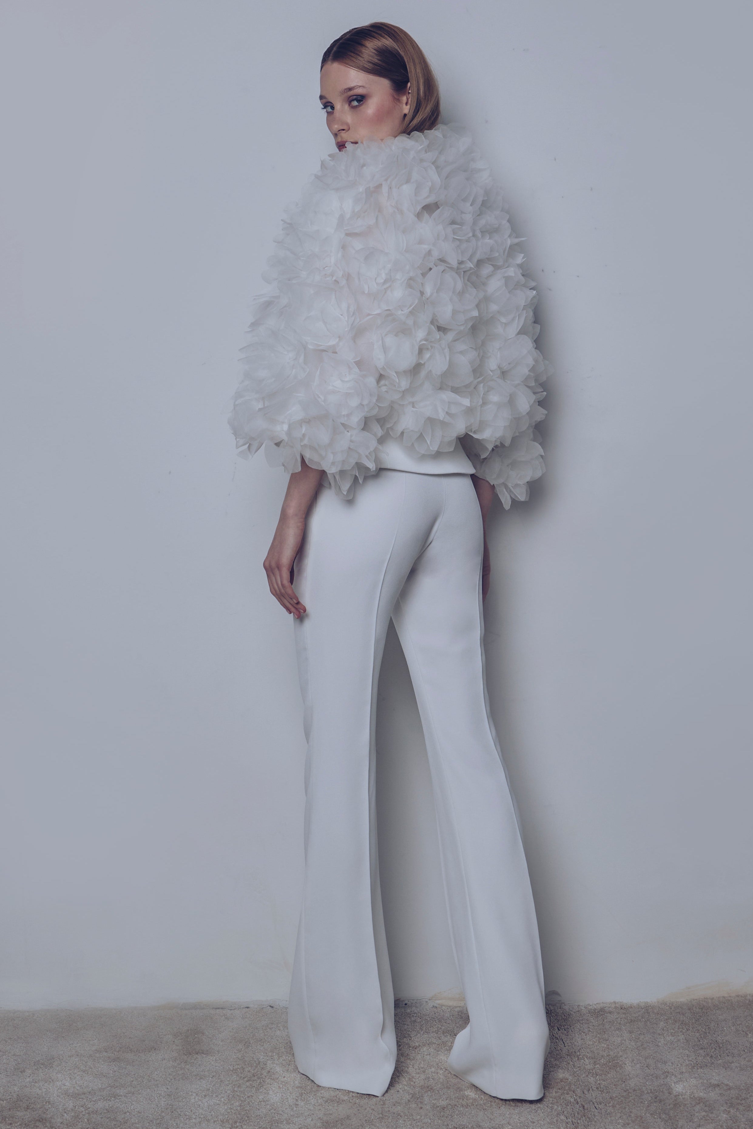 Viscose blend cady crepe corset with bones and side split zipper paired with tulle bomber jacket with 3D organza flowers and three-quarter length sleeves. High-waisted flared pants complete the look. Metropolitan outfit between bridal and ready-to-wear, for a protagonist and out of the box bride.