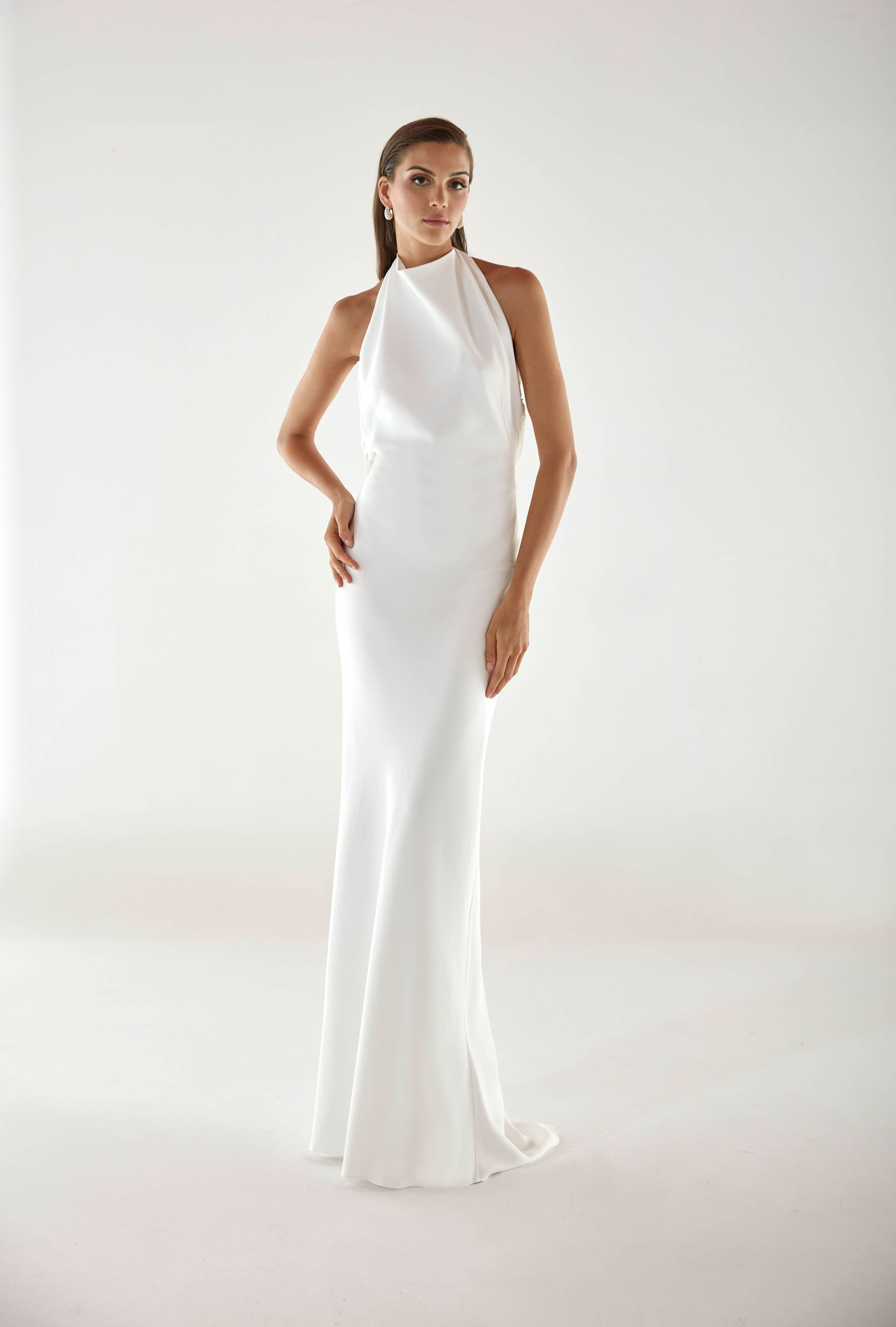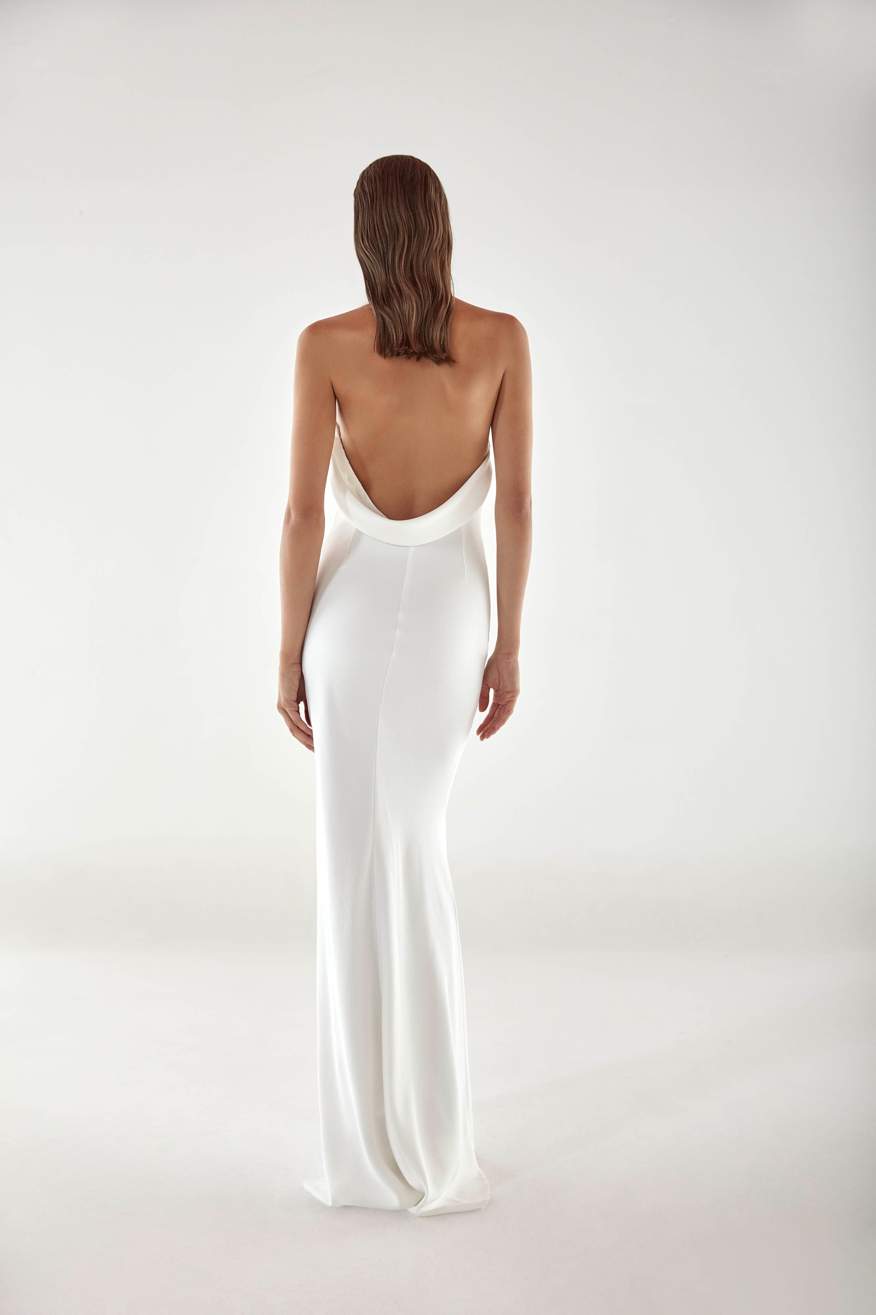 Mermaid gown in crêpe. The halter neckline is slightly bloused. The deep back cutout is finished with a soft crêpe drape.