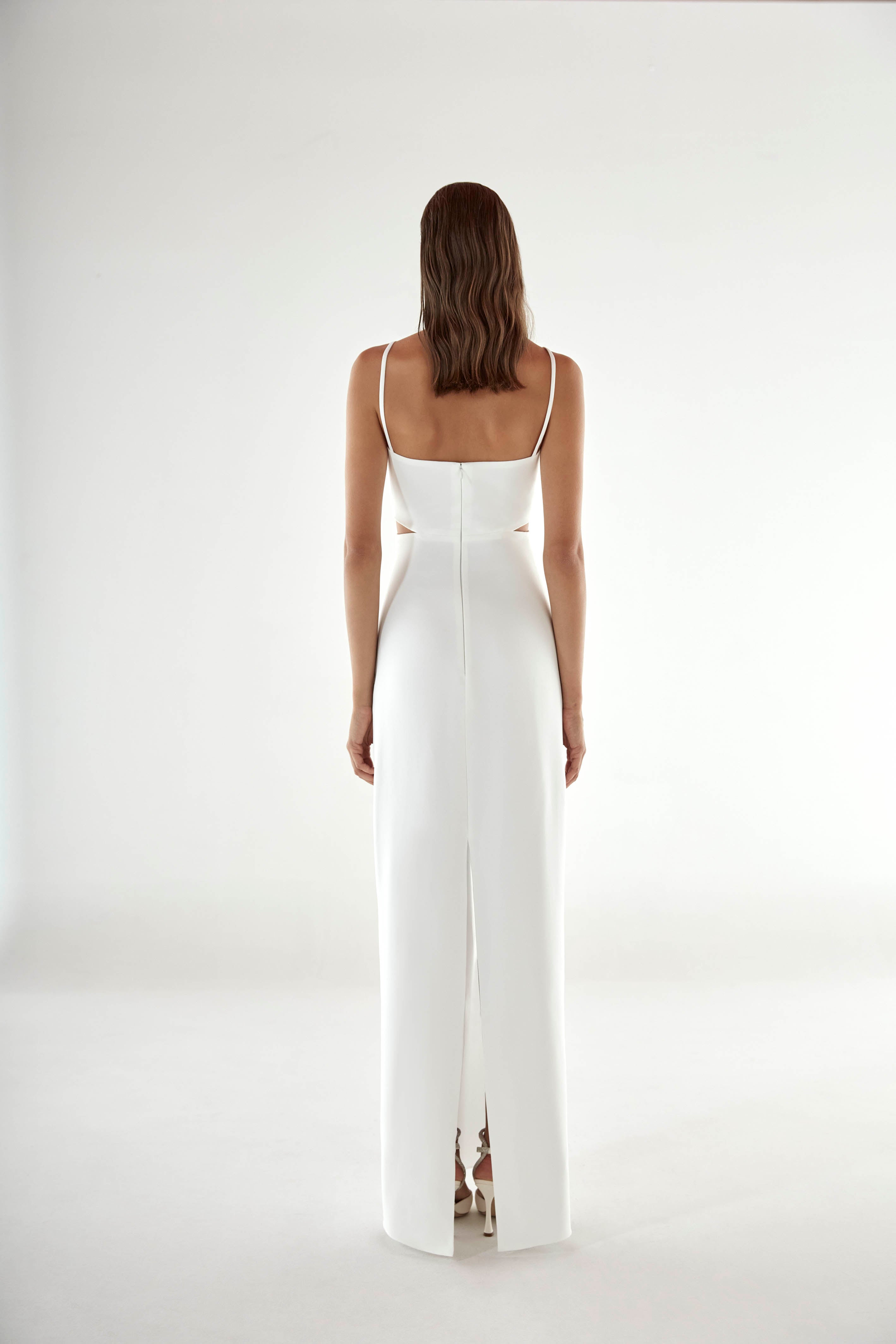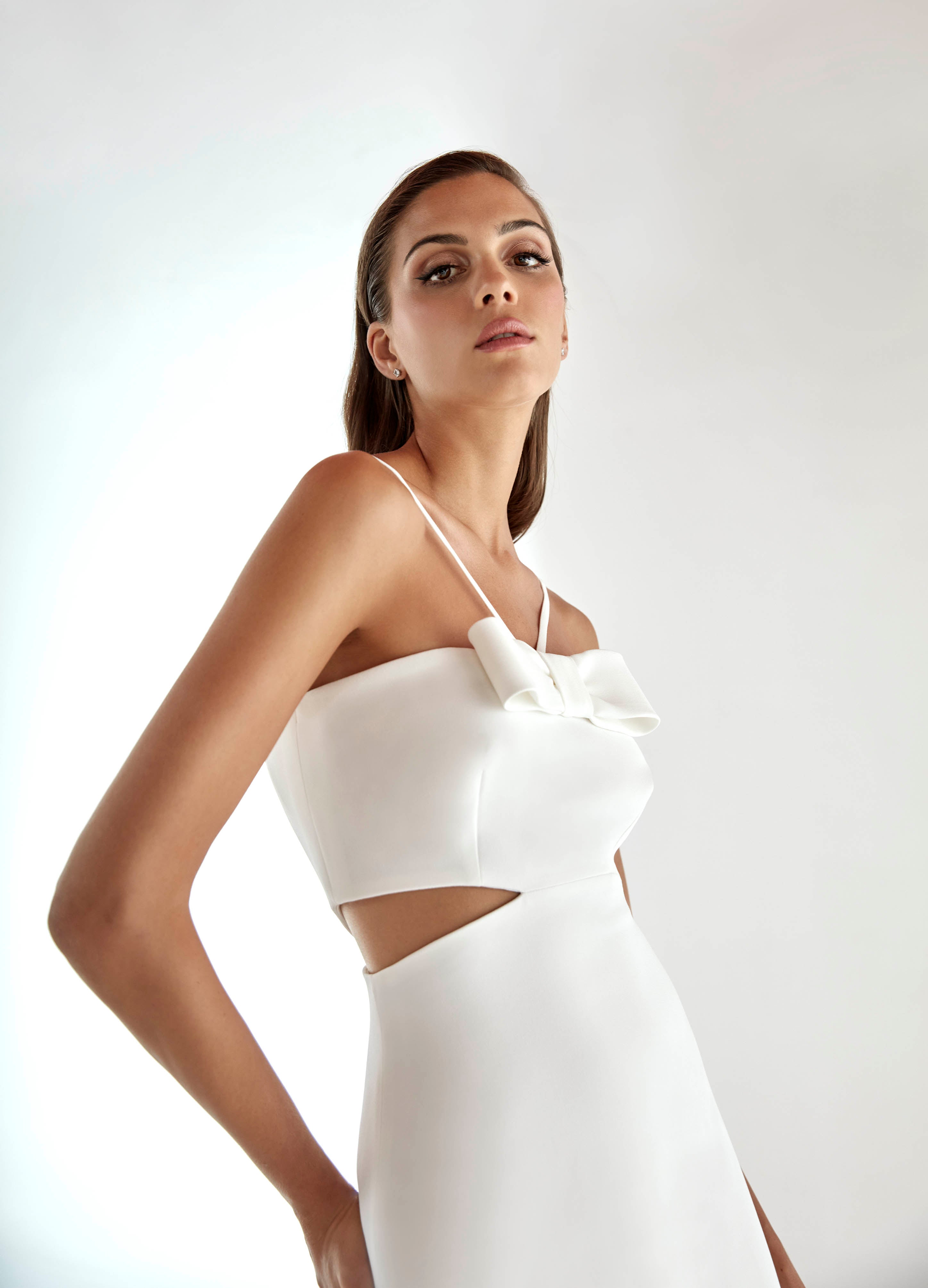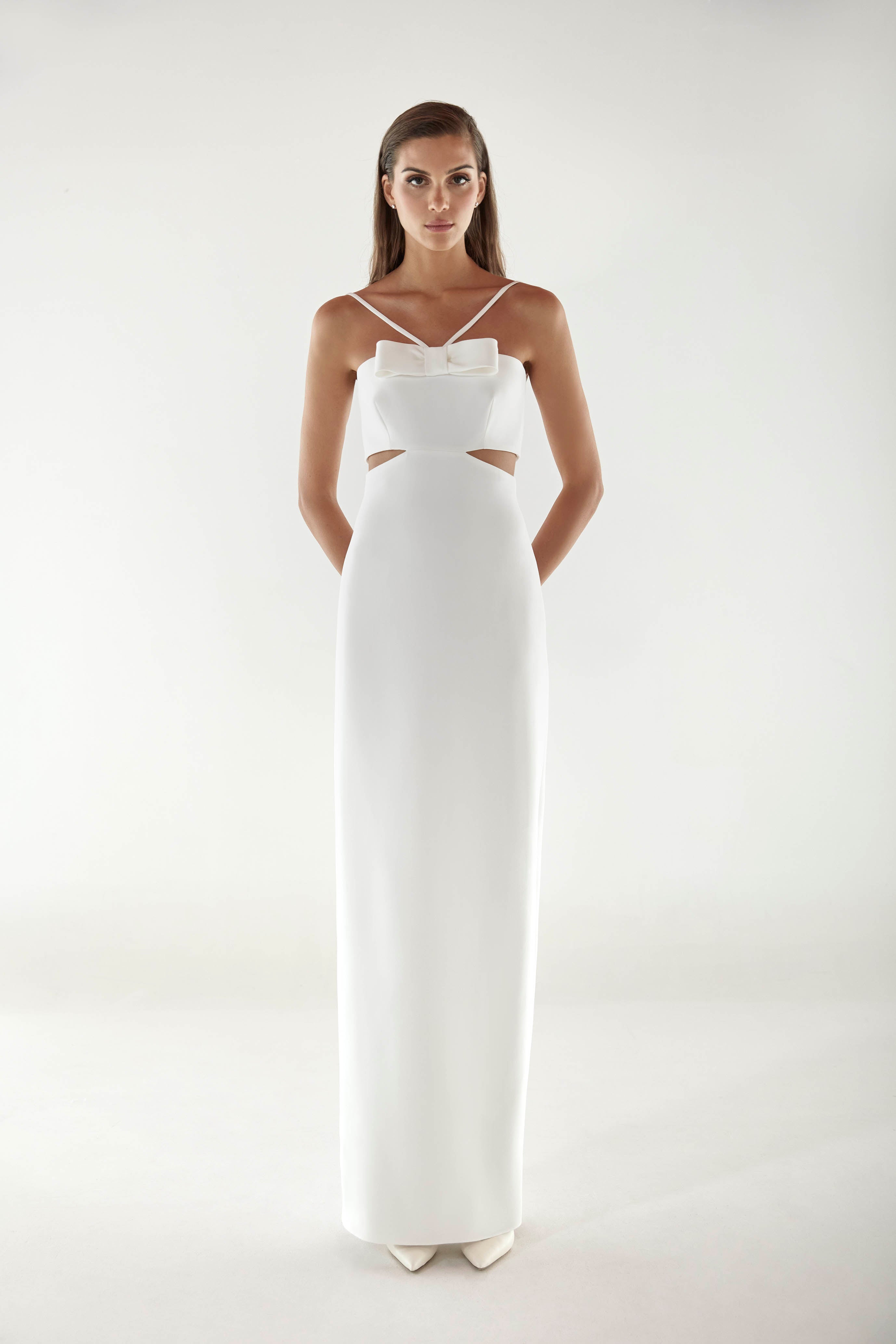 Column dress in crepe with cutouts at the sides. The neckline is adorned with a large crepe bow with internal crinoline to maintain its shape.