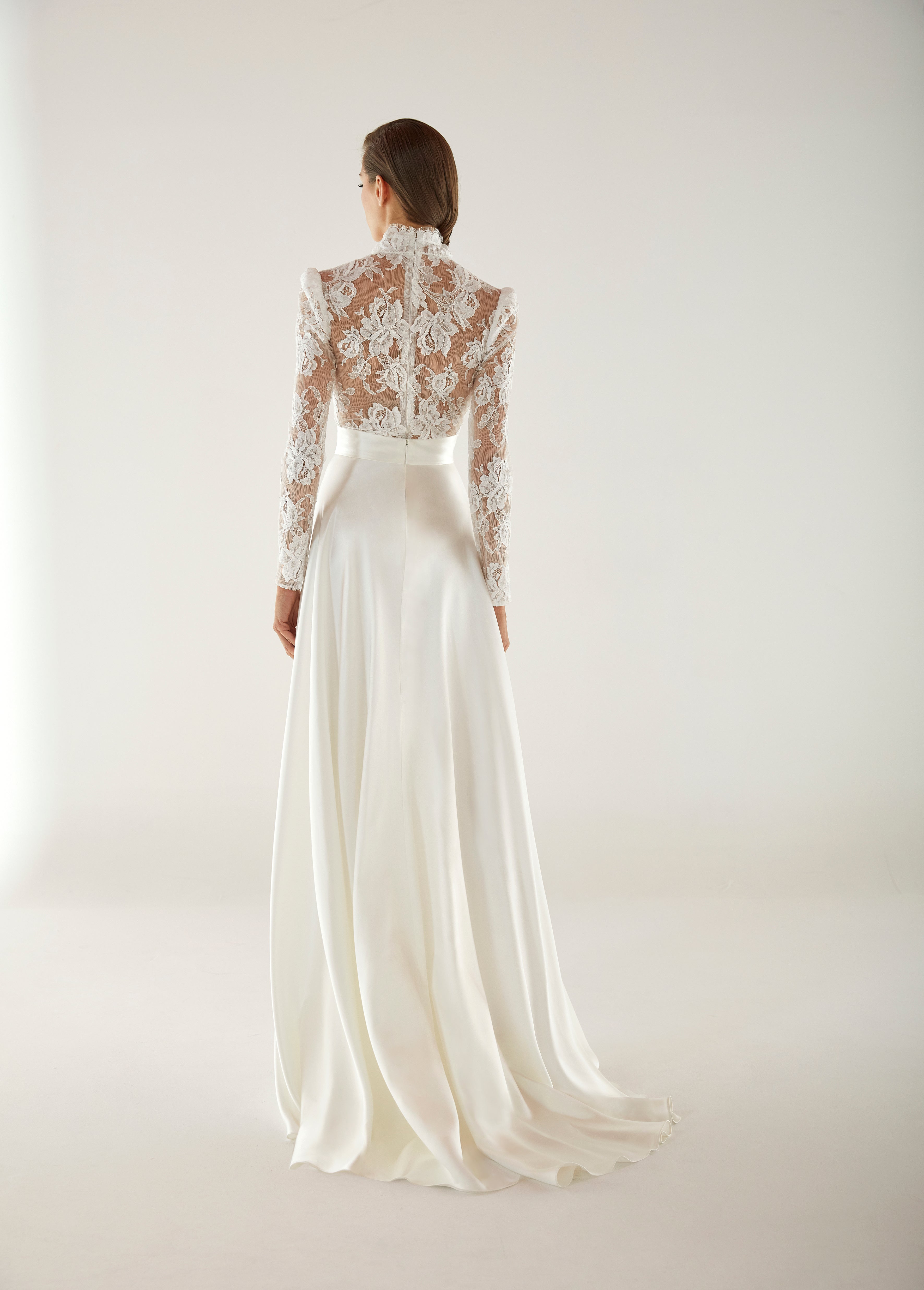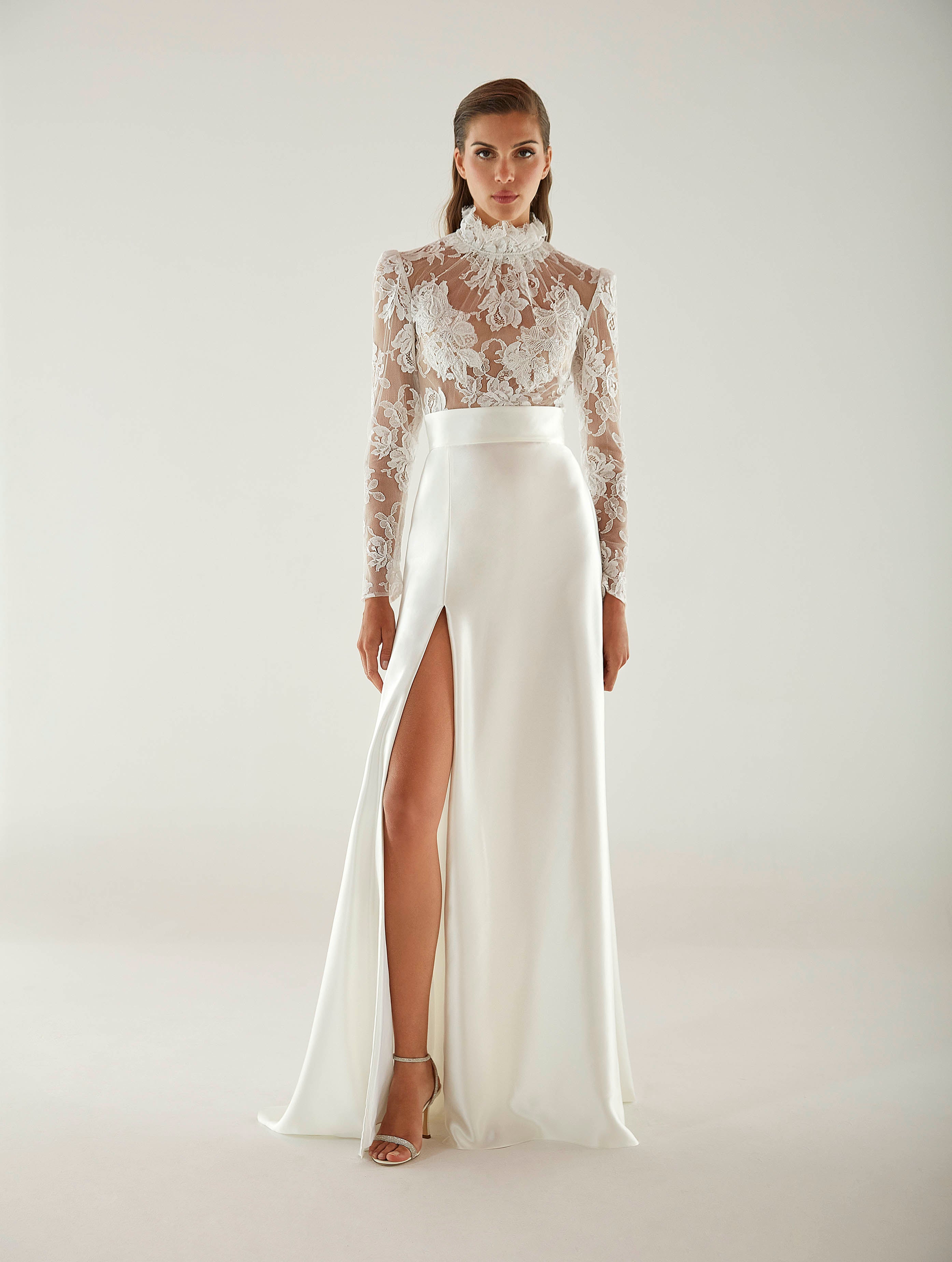 Two-piece outfit consisting of a semi-transparent bodysuit made of French Chantilly cotton lace, featuring an elegant high ruched collar adorned with an embroidered trim. Embroidered appliqués on the front add a three-dimensional effect to the lace. The sleeves are puffed and structured, supported by an internal crinoline. Invisible zipper closure at the center back. The skirt is made of silk-blend satin. Its timeless high-waisted design is complemented by a 5 cm wide waistband that perfectly cinches the waist. A side slit accentuates its femininity.