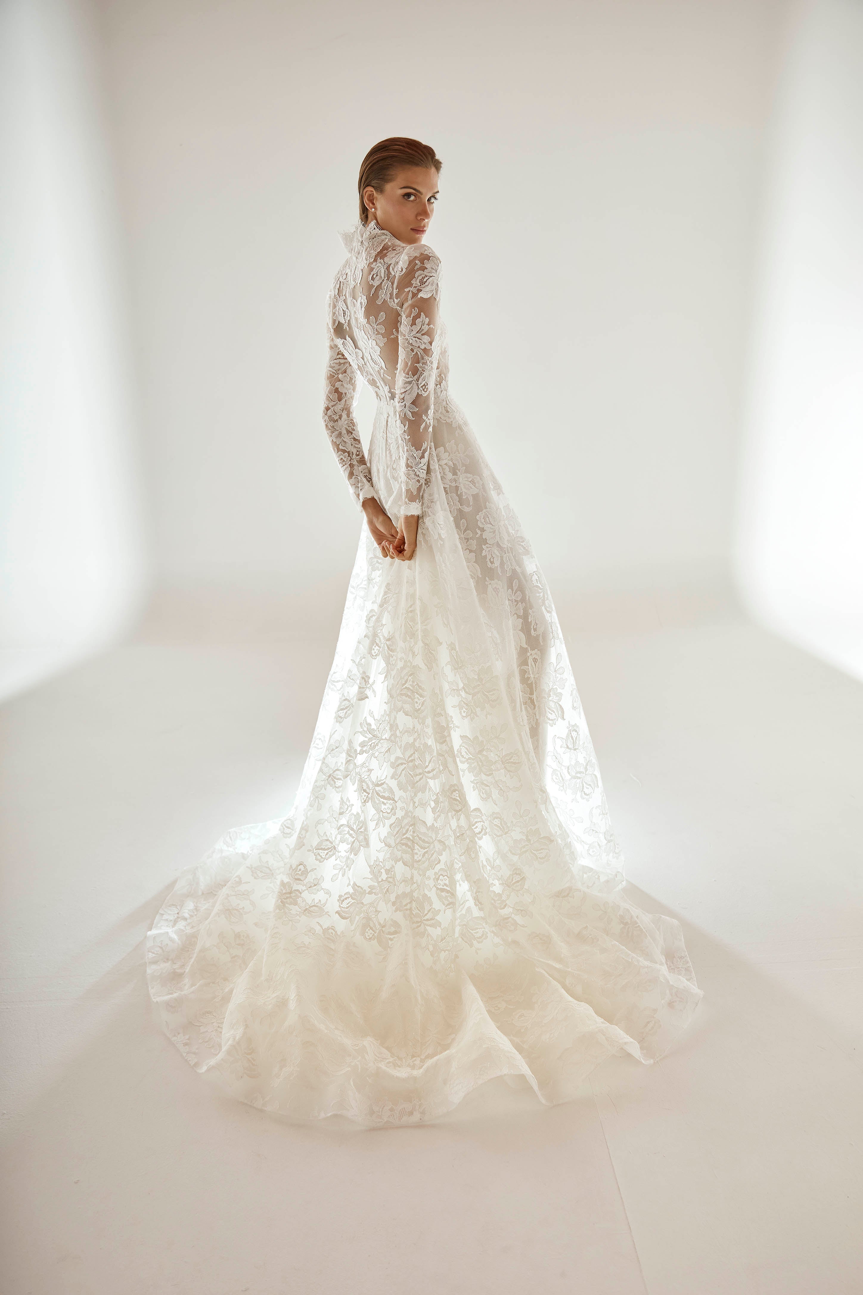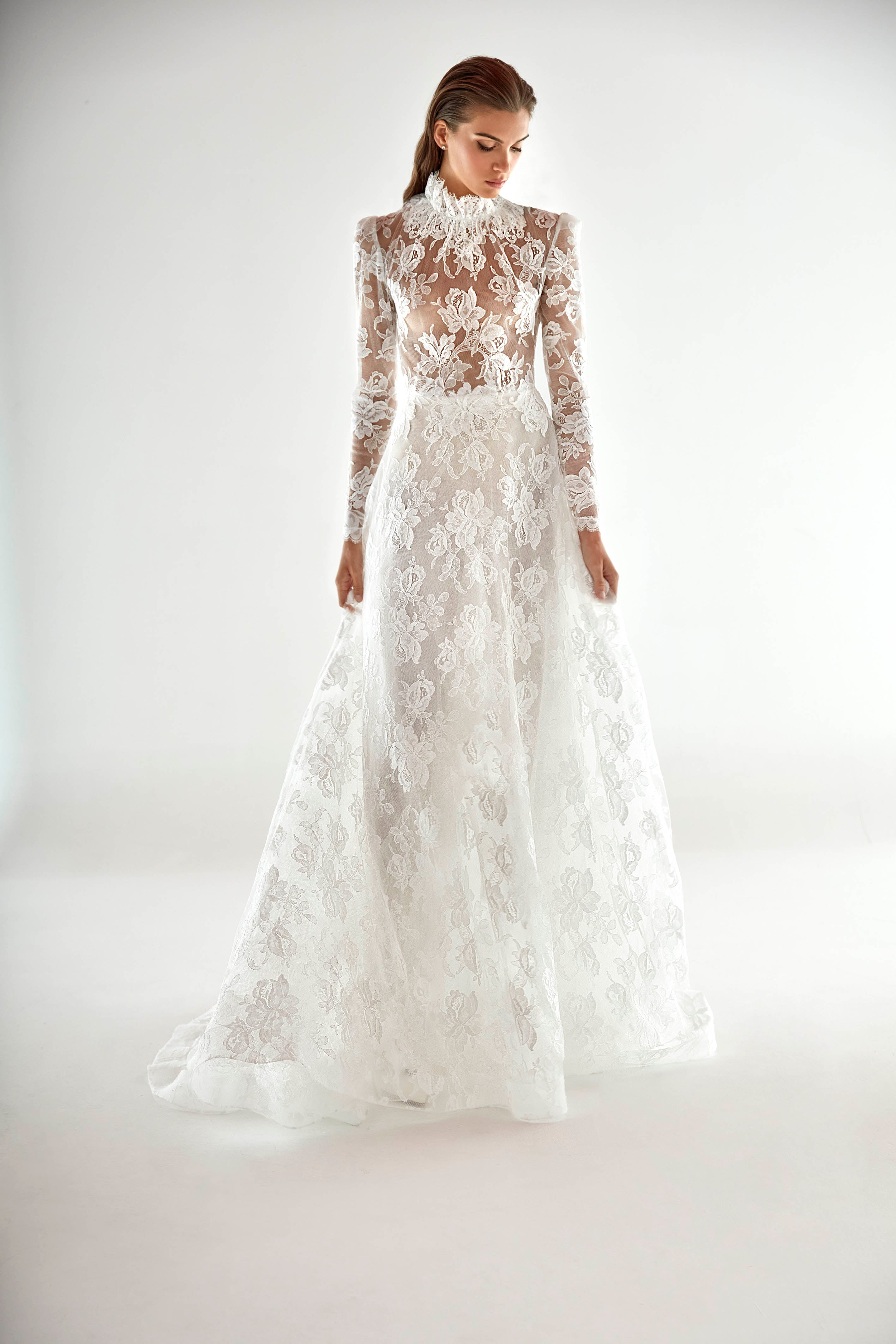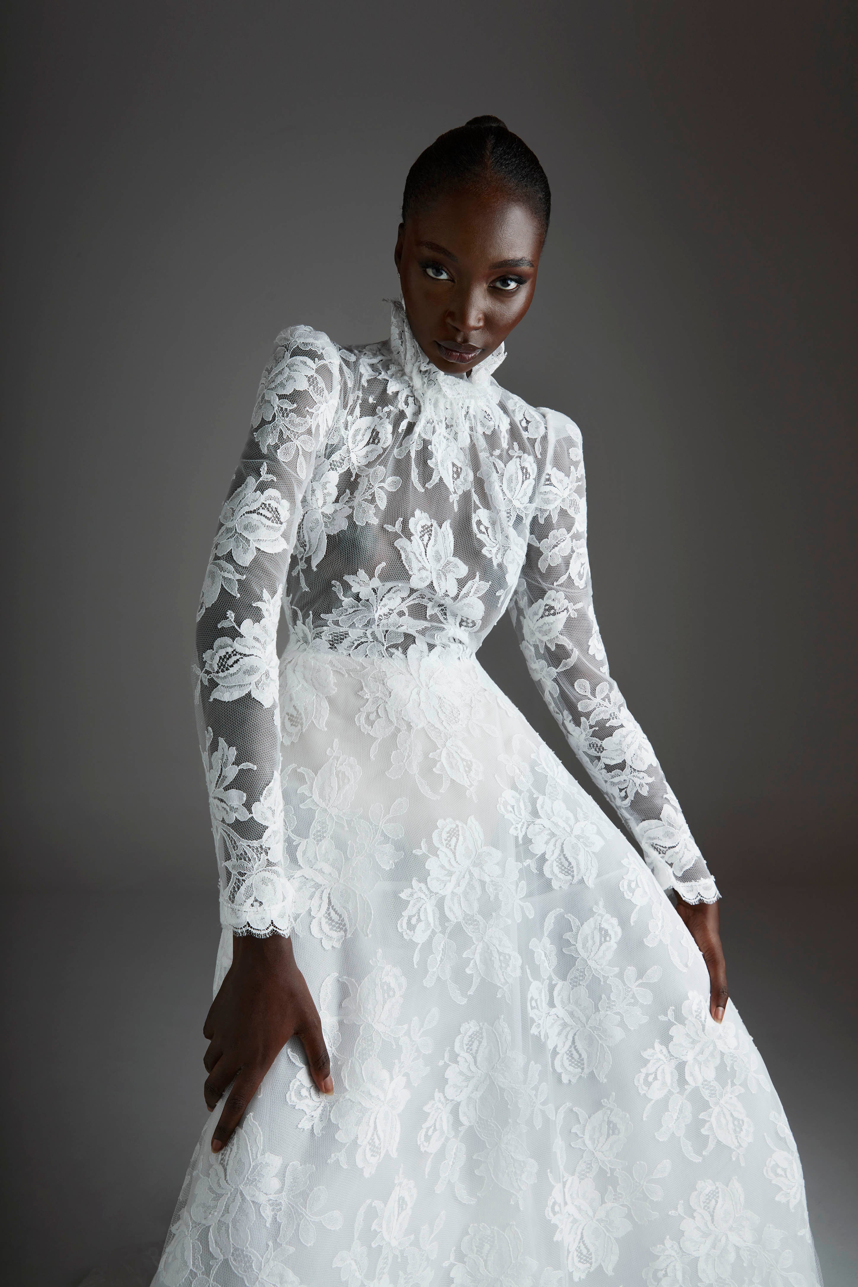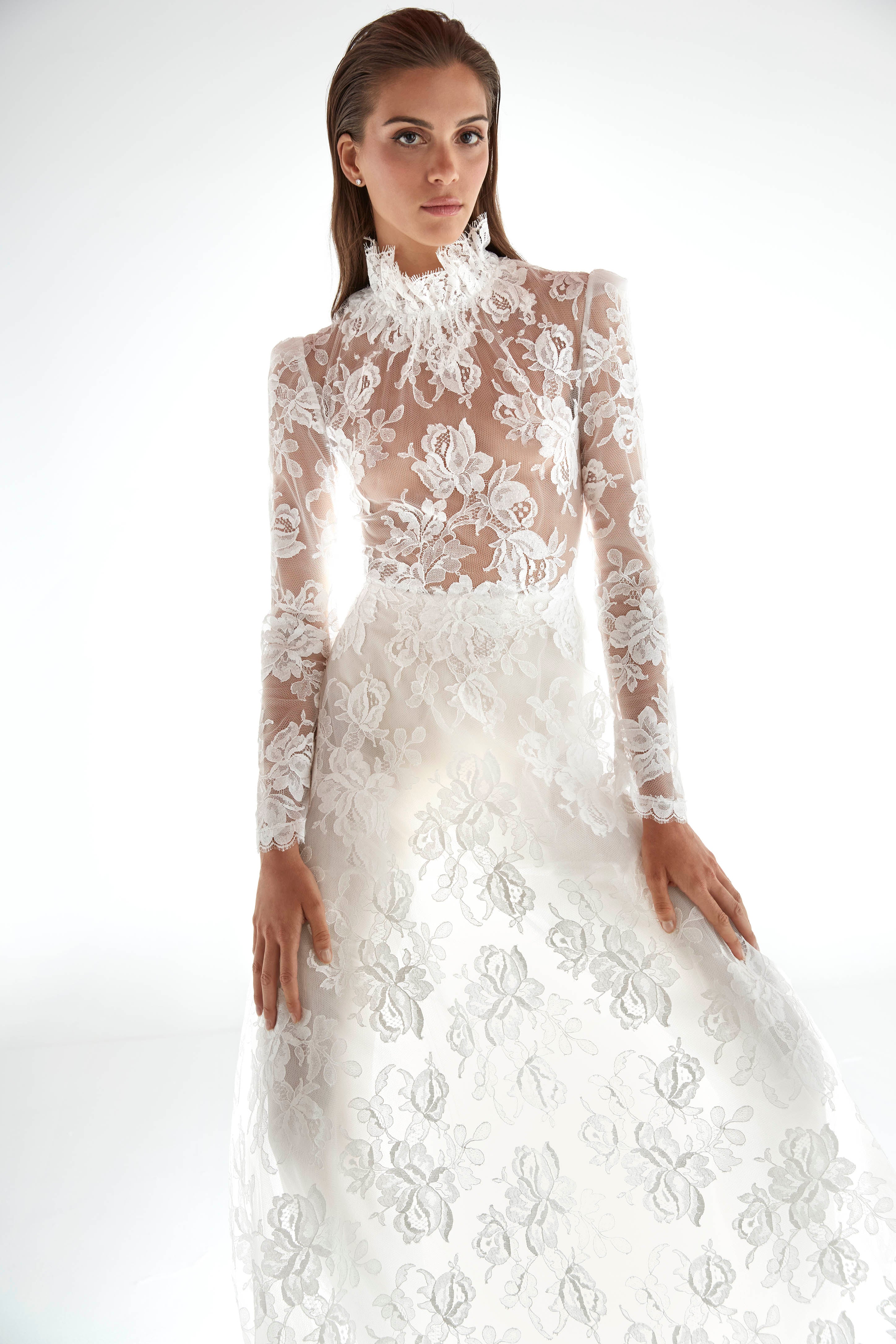 A-line dress in French Chantilly cotton lace. The semi-transparent bodice is finished with a refined high, ruched collar. The sleeves are long and rounded.