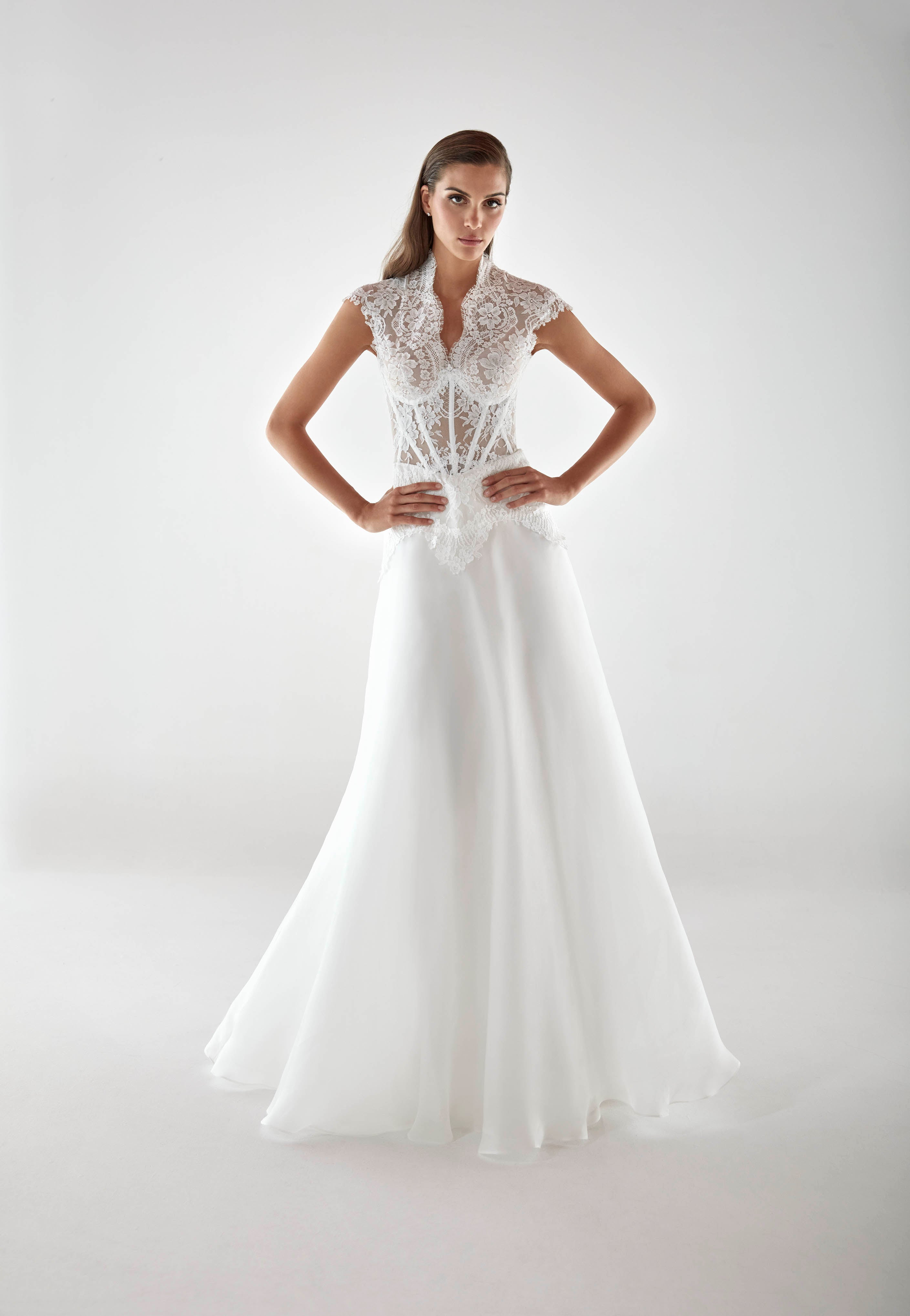 A-line dress in silk organza. The V-neck bodice has a corset structure with visible boning design, finished with grosgrain. French Chantilly lace in cotton is placed symmetrically. The hand-shaped placement extends to the first hip.