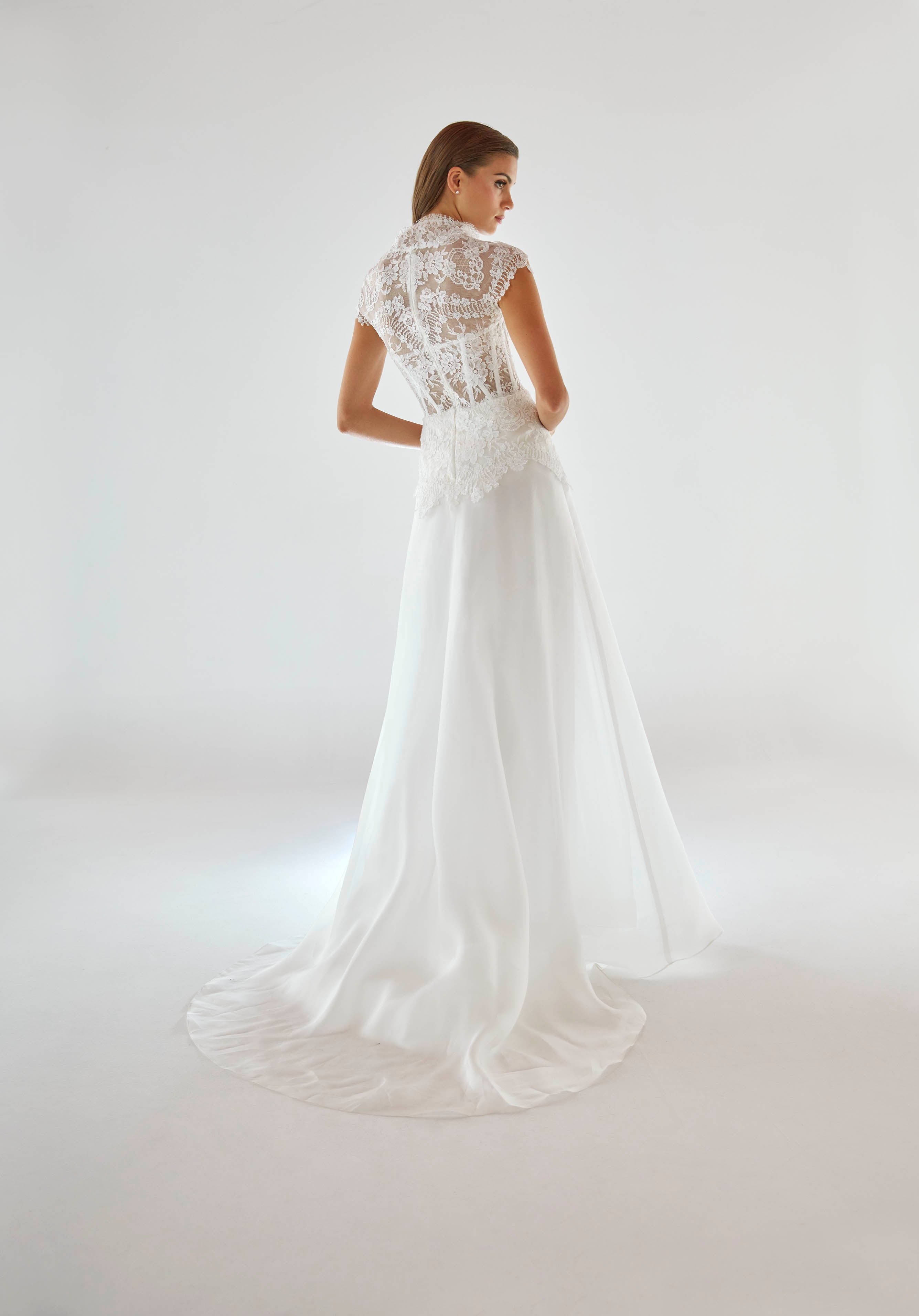 Each detail is crafted with precision to ensure an impeccable fit and natural elegance. The wedding dresses are entirely made to measure, using only noble fabrics selected to enhance the beauty of every bride.
