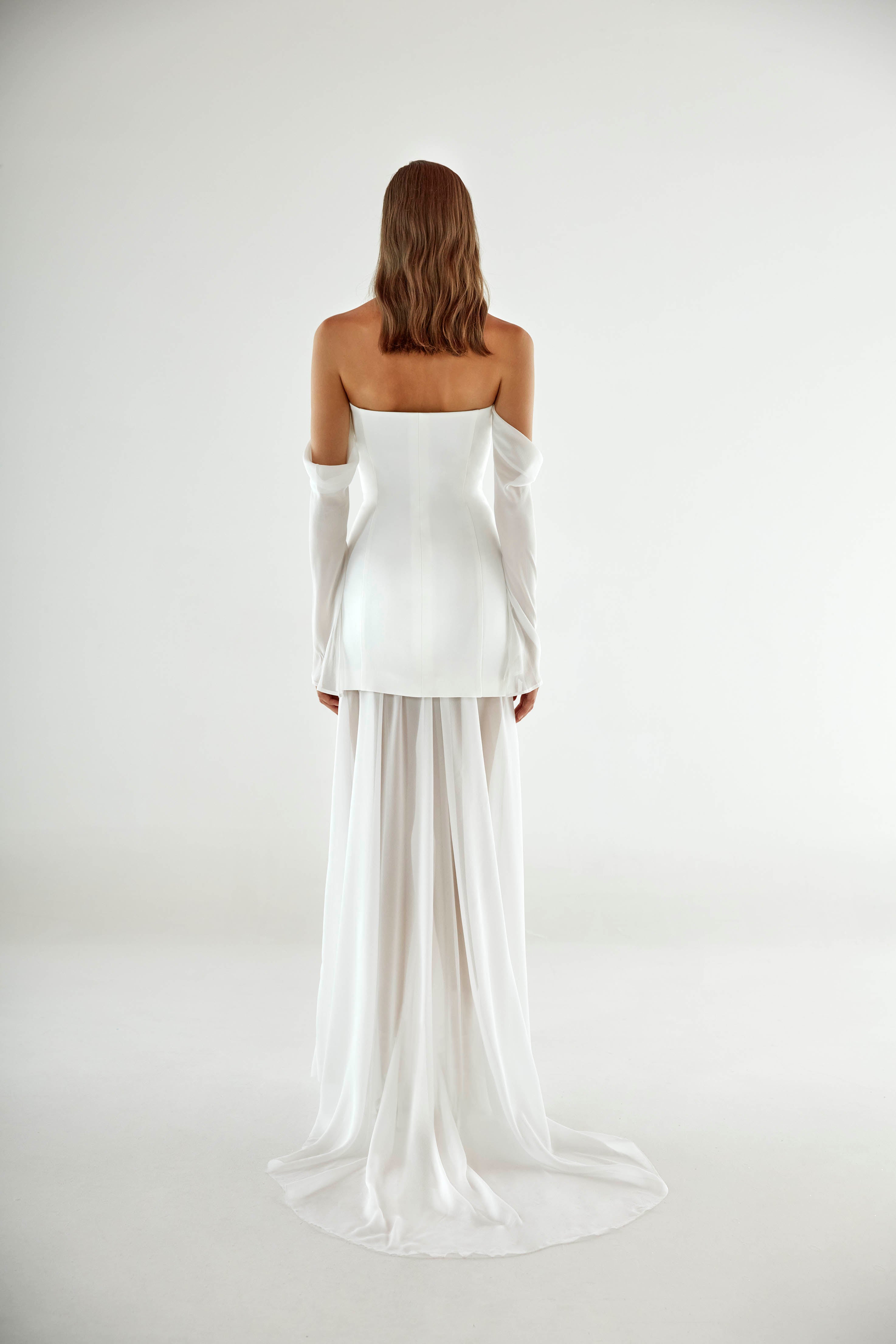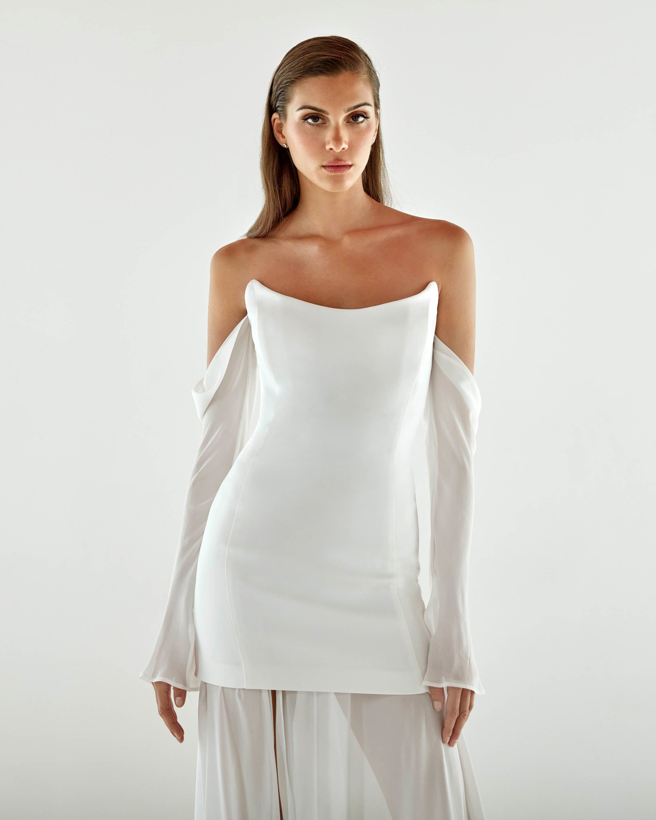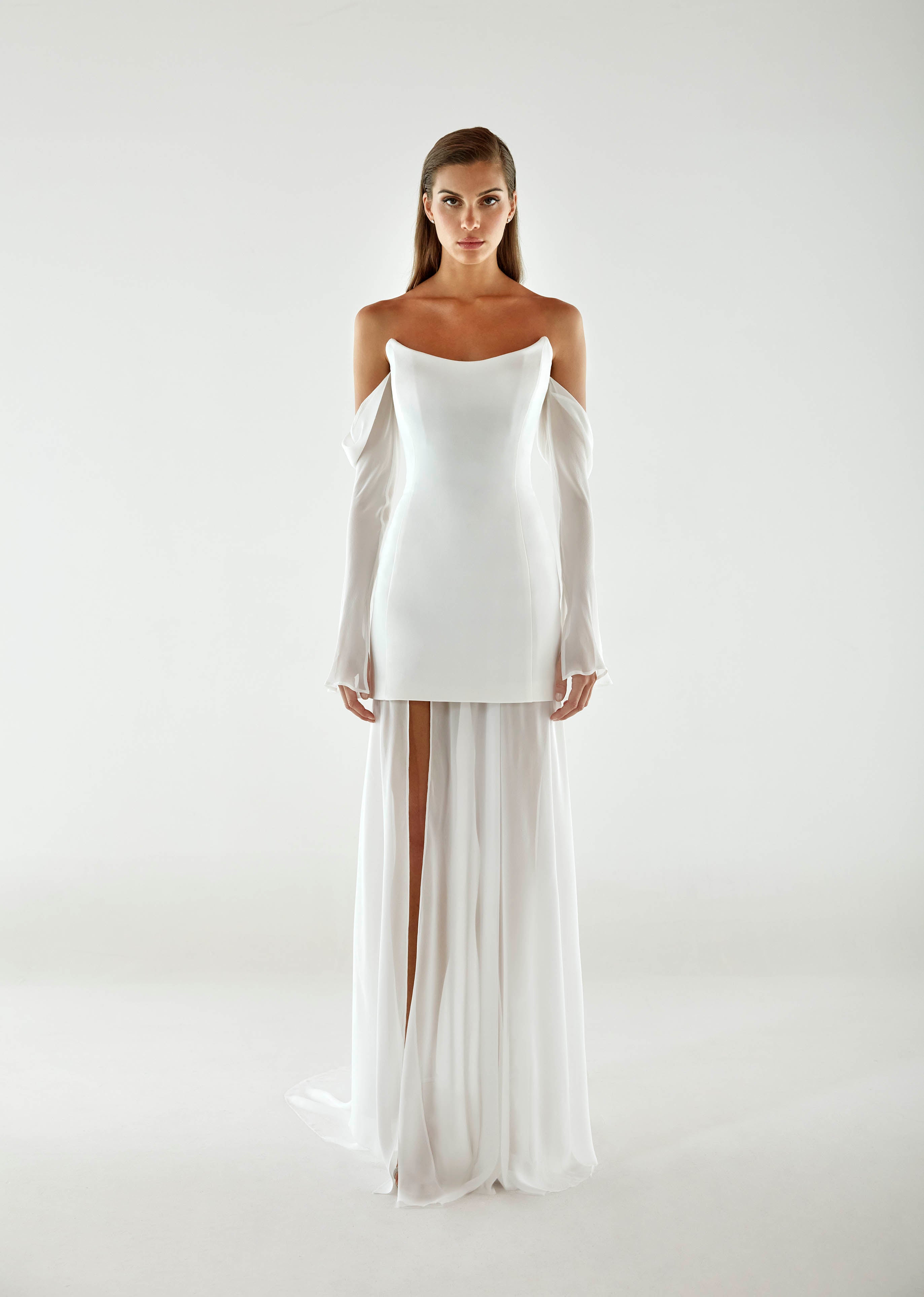 Crepe sheath dress with a modular and versatile design. The complete look features a structured mini dress with an internal corset and a sweetheart neckline, floating trumpet sleeves, and a lightweight removable viscose chiffon underdress.