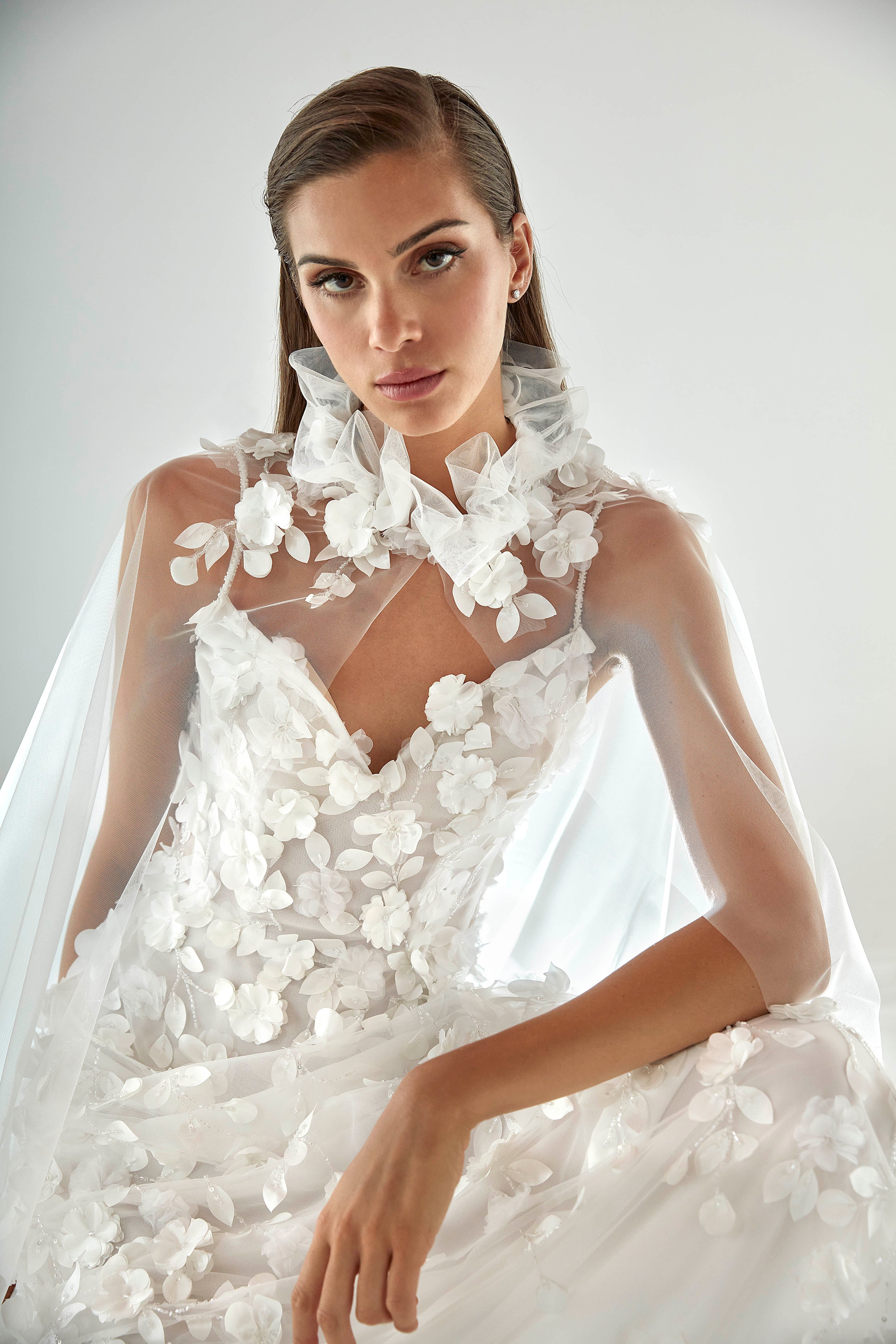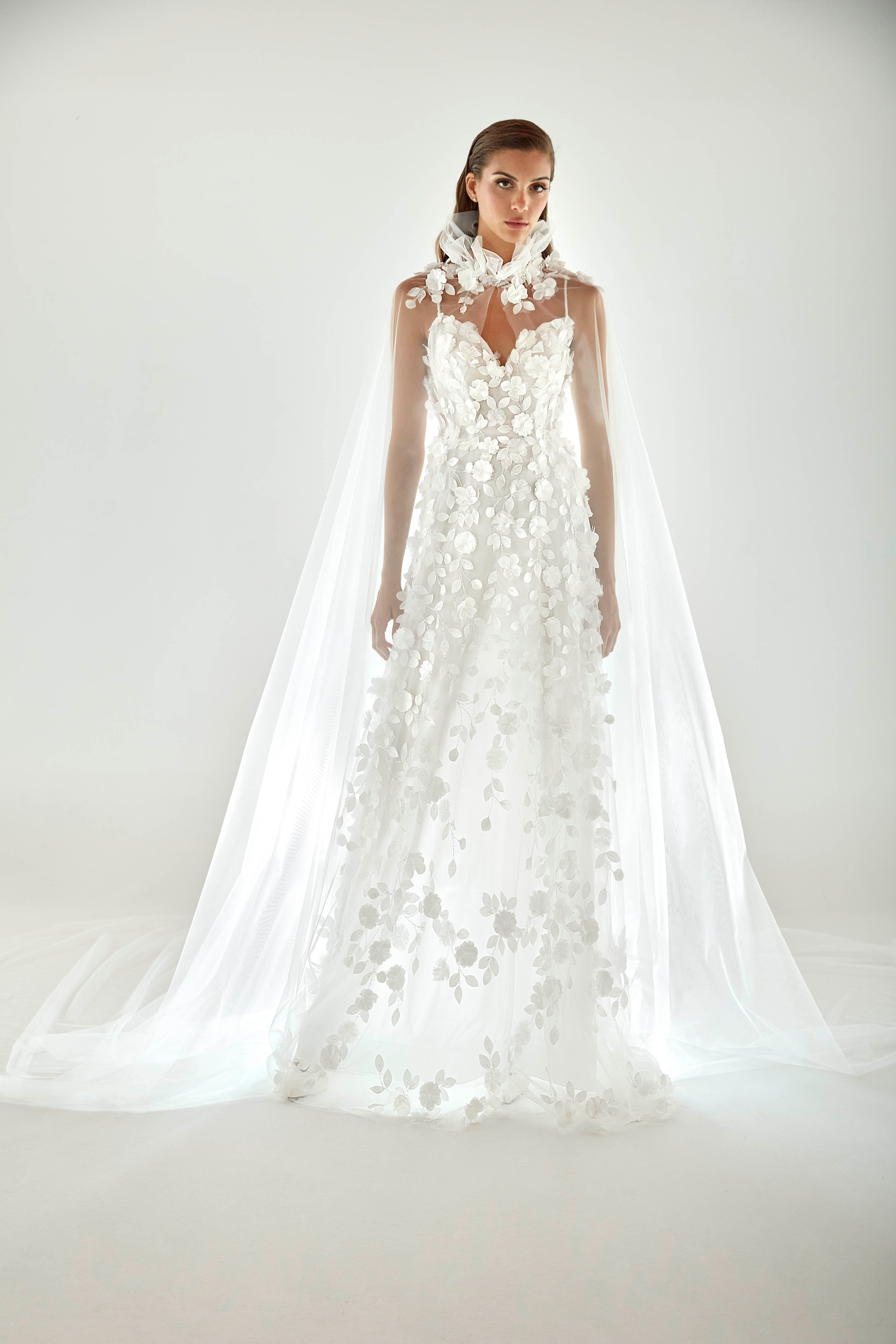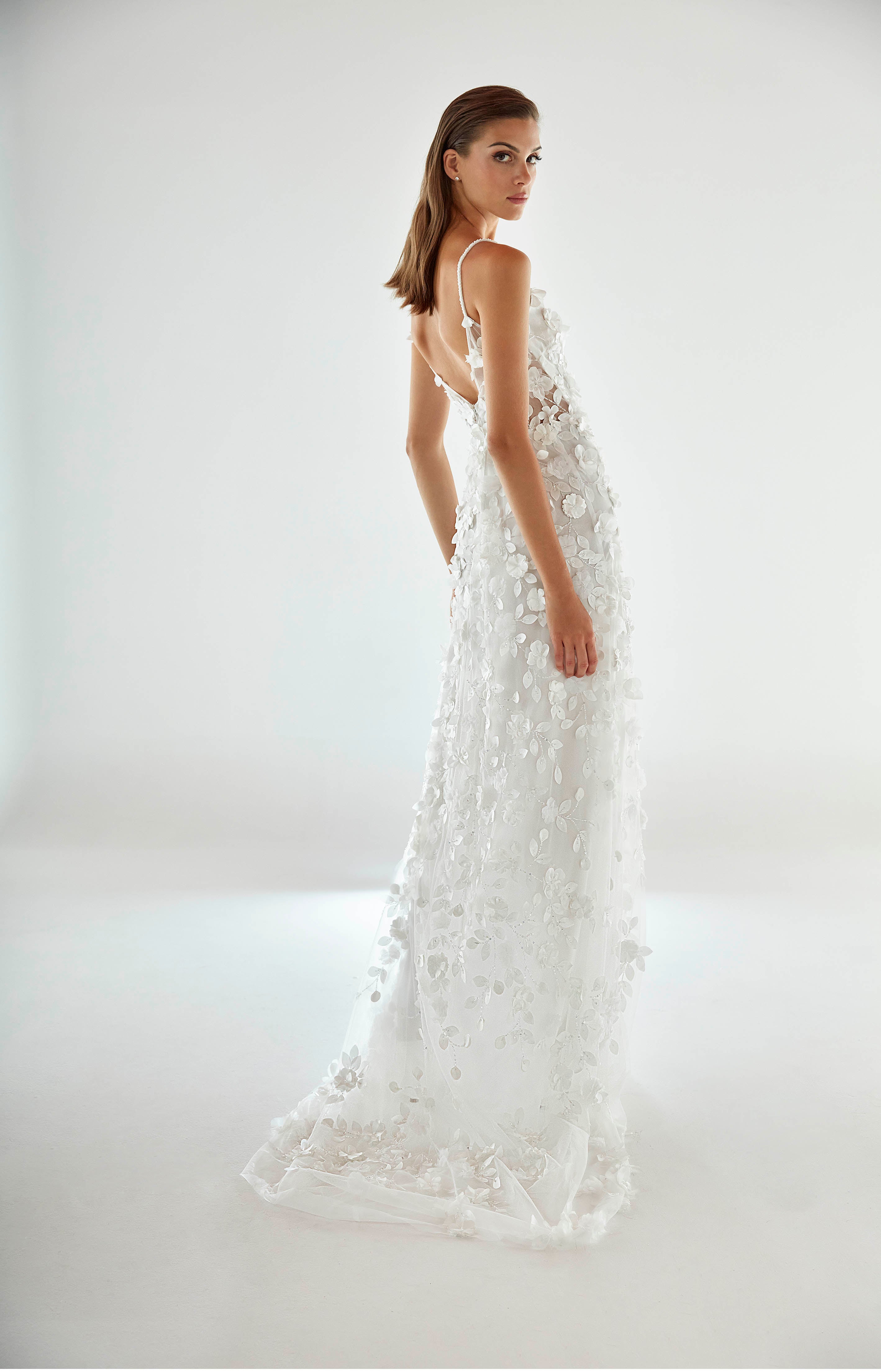 Flowing dress in embroidered tulle. V-neckline outlined with embroidered straps. Crystal embroidery lines and three-dimensional fabric flowers compose the lace design. The dress features lightweight layering with medium coverage.