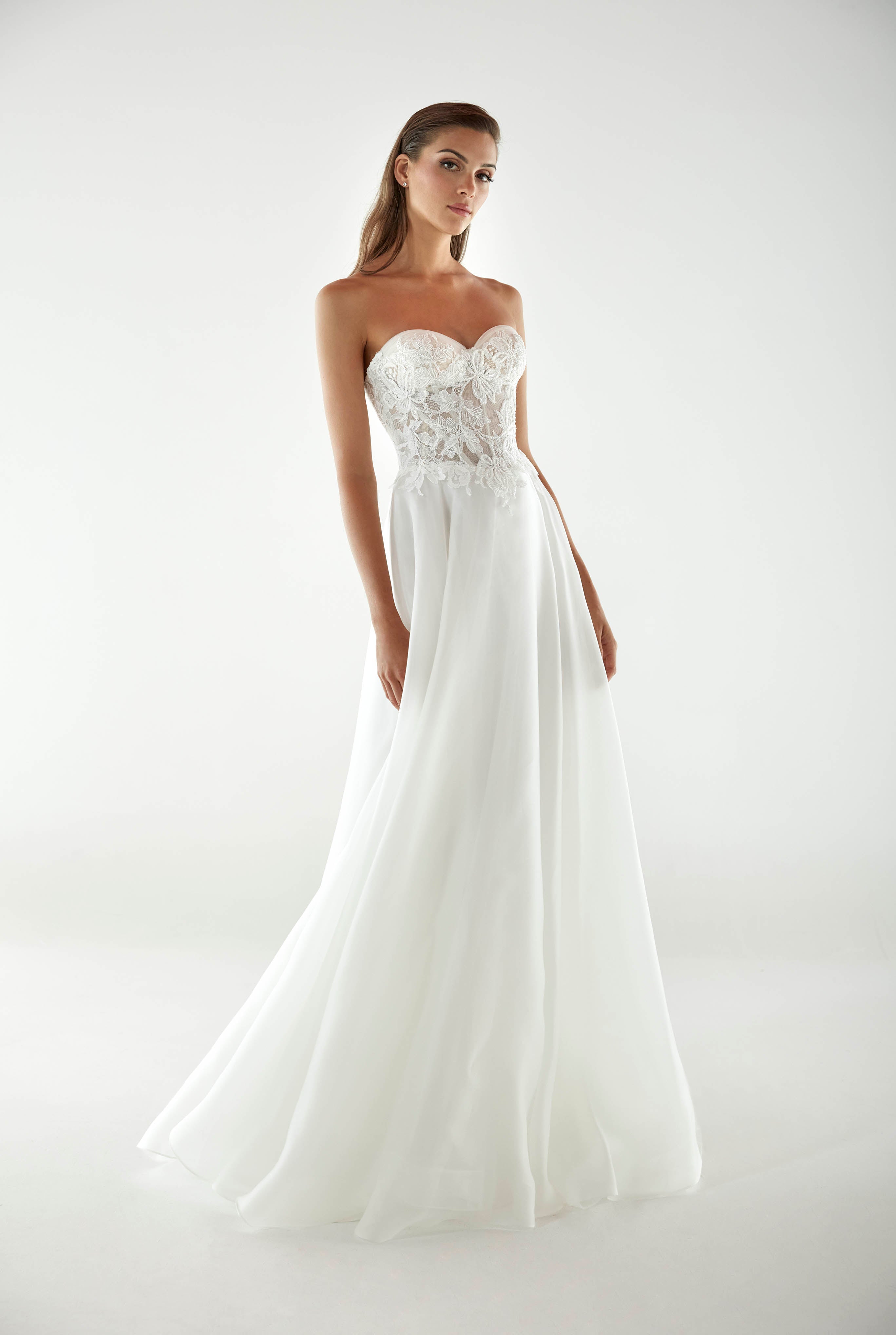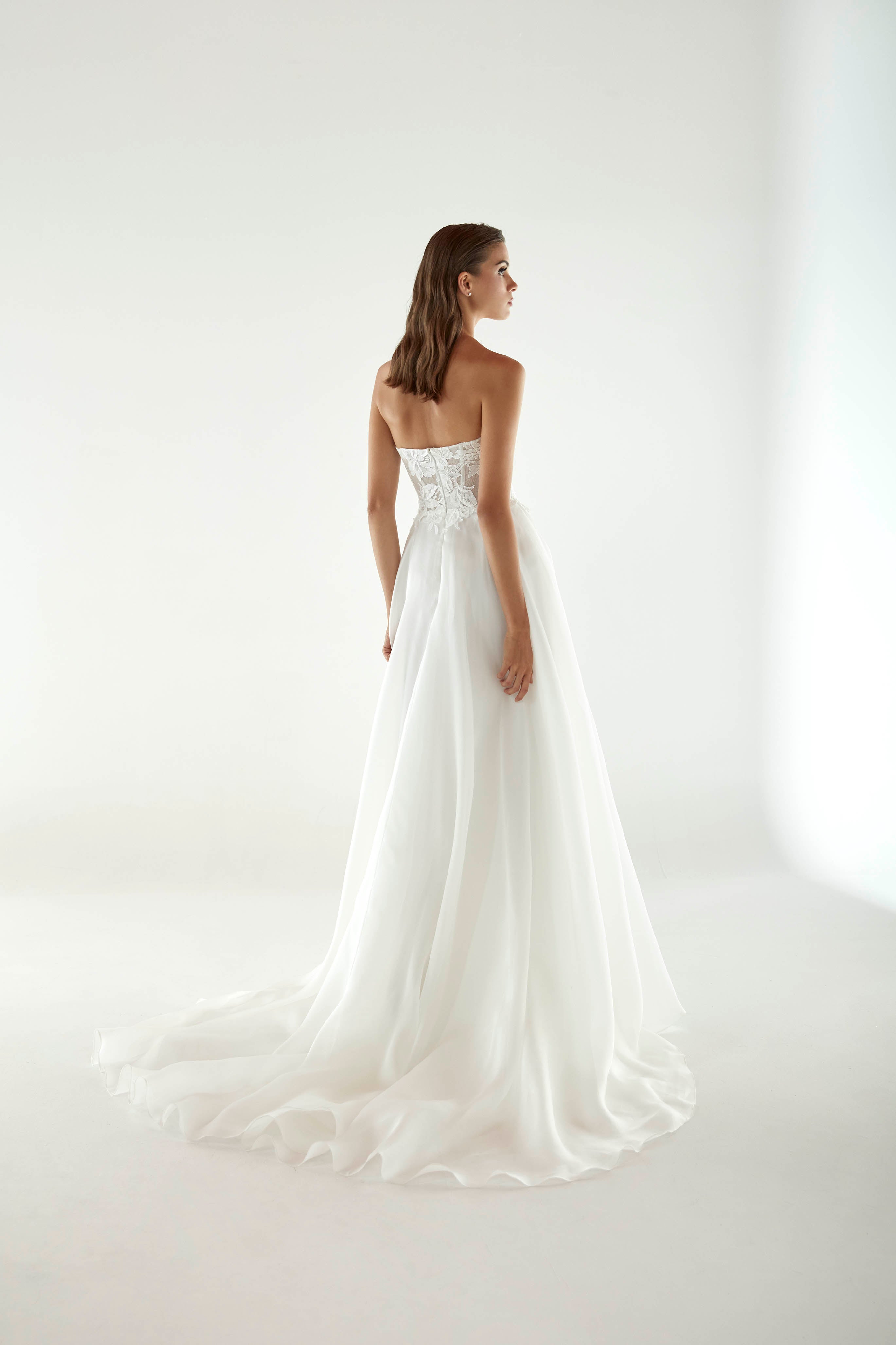 A-line dress in silk organza. The bodice is structured like a corset with an exposed boning design. Embroidered lace appliqués overlap French Chantilly lace, giving the bodice a three-dimensional effect. The skirt features a light and soft structure.