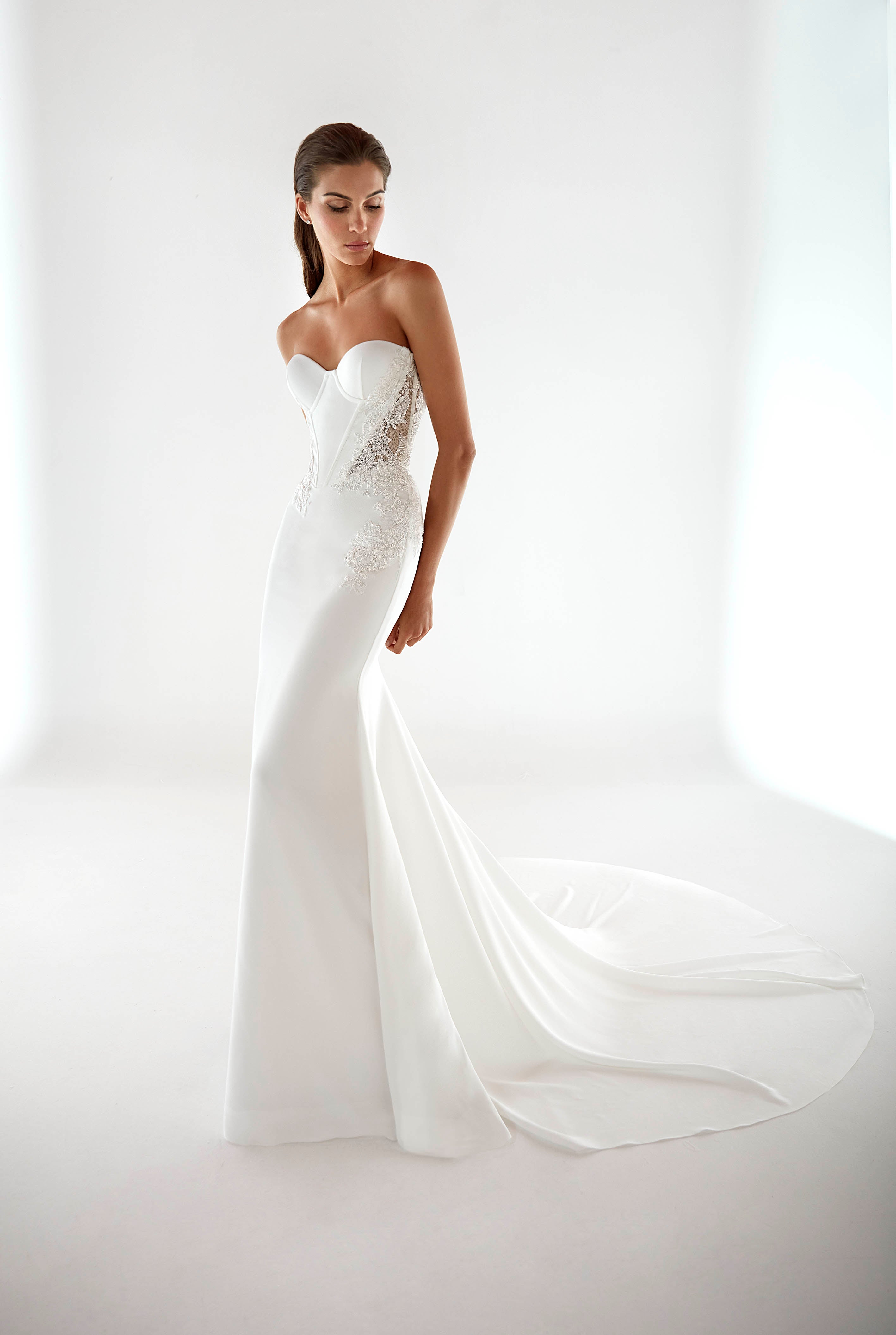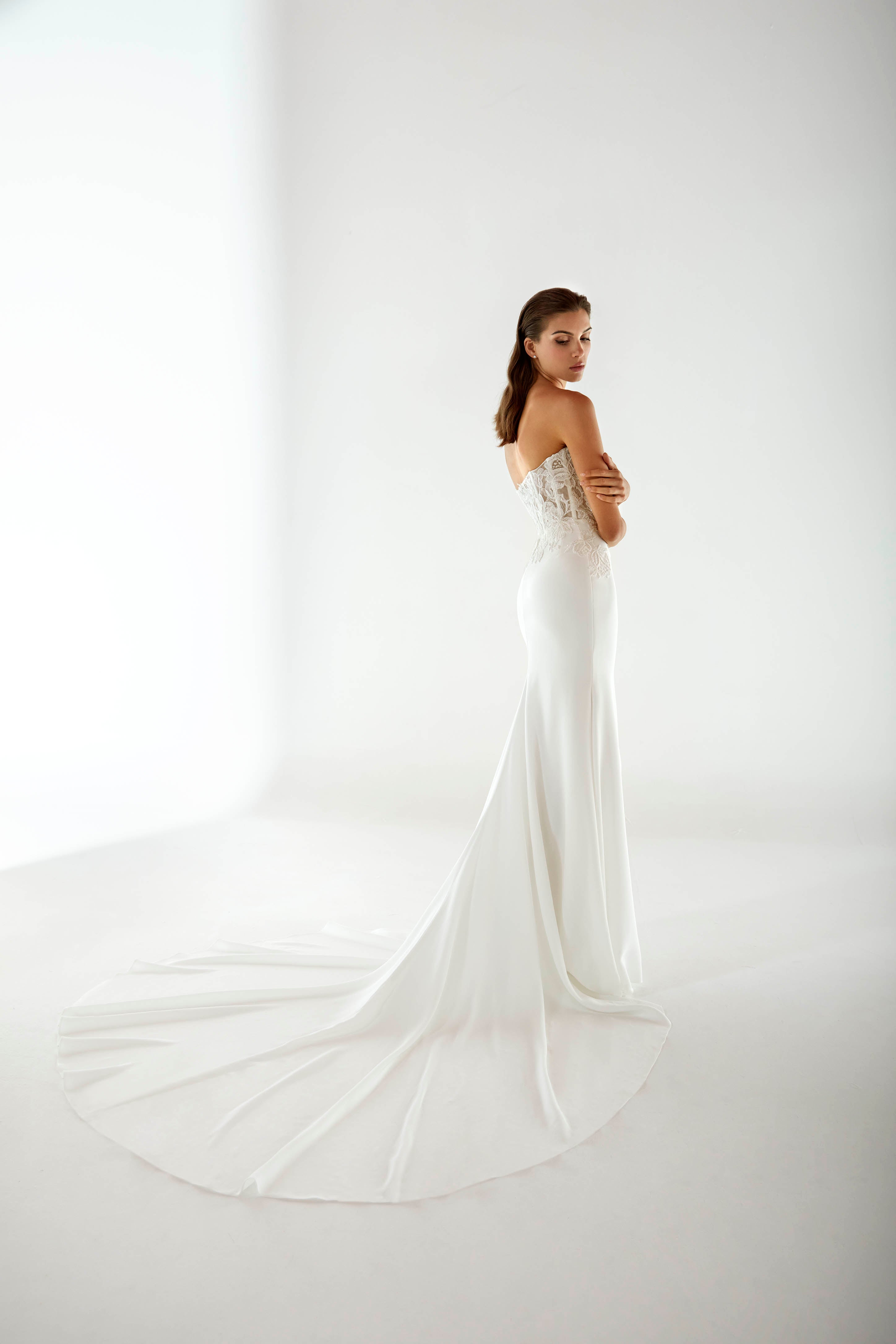 Mermaid dress in crêpe. The bodice is crafted with a corset structure, detailed with stitched boning. Embroidered lace appliqués overlay Chantilly lace, adding dimension to the semi-transparent base. The long train gives the dress a modern yet timeless elegance.