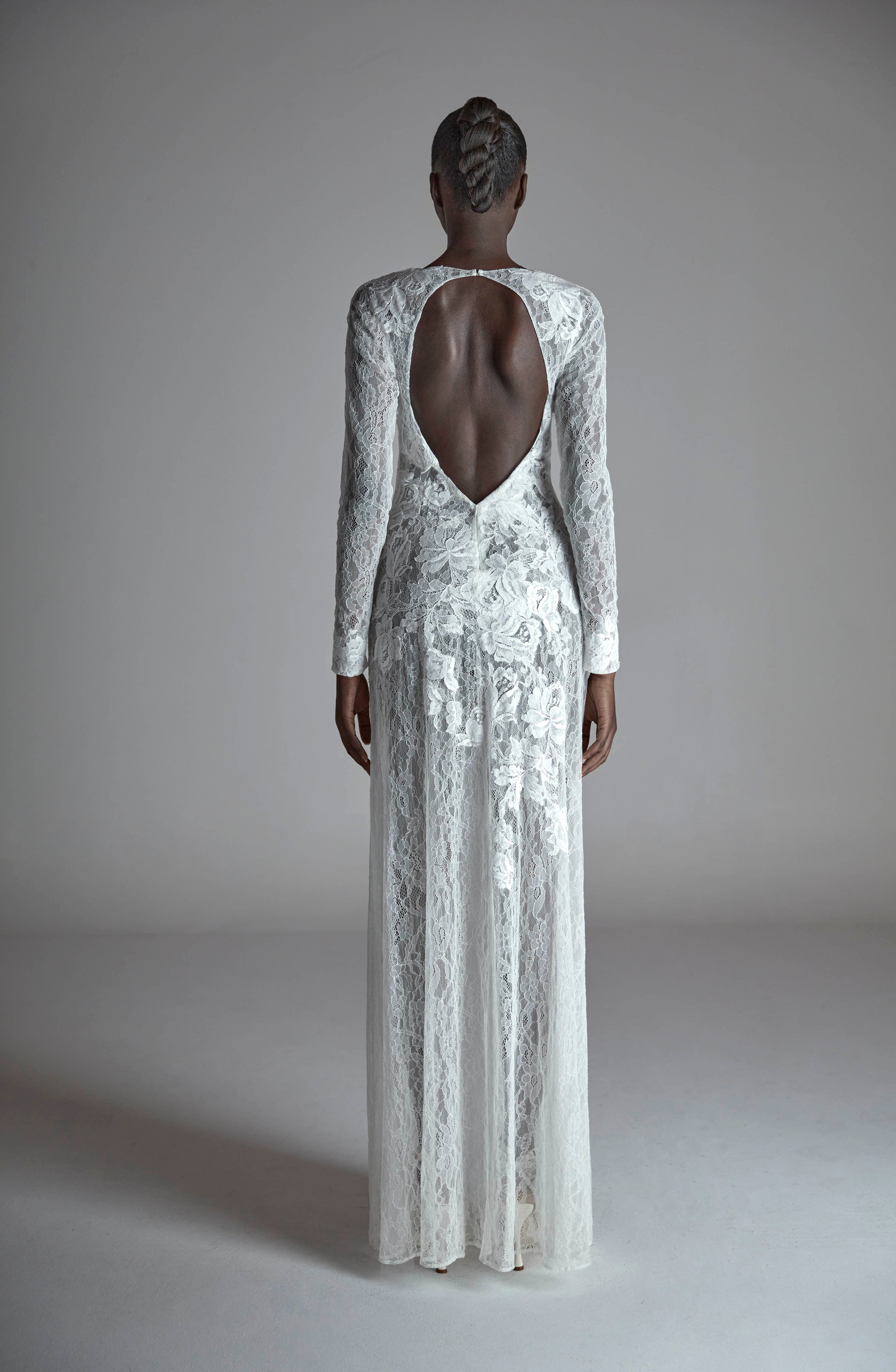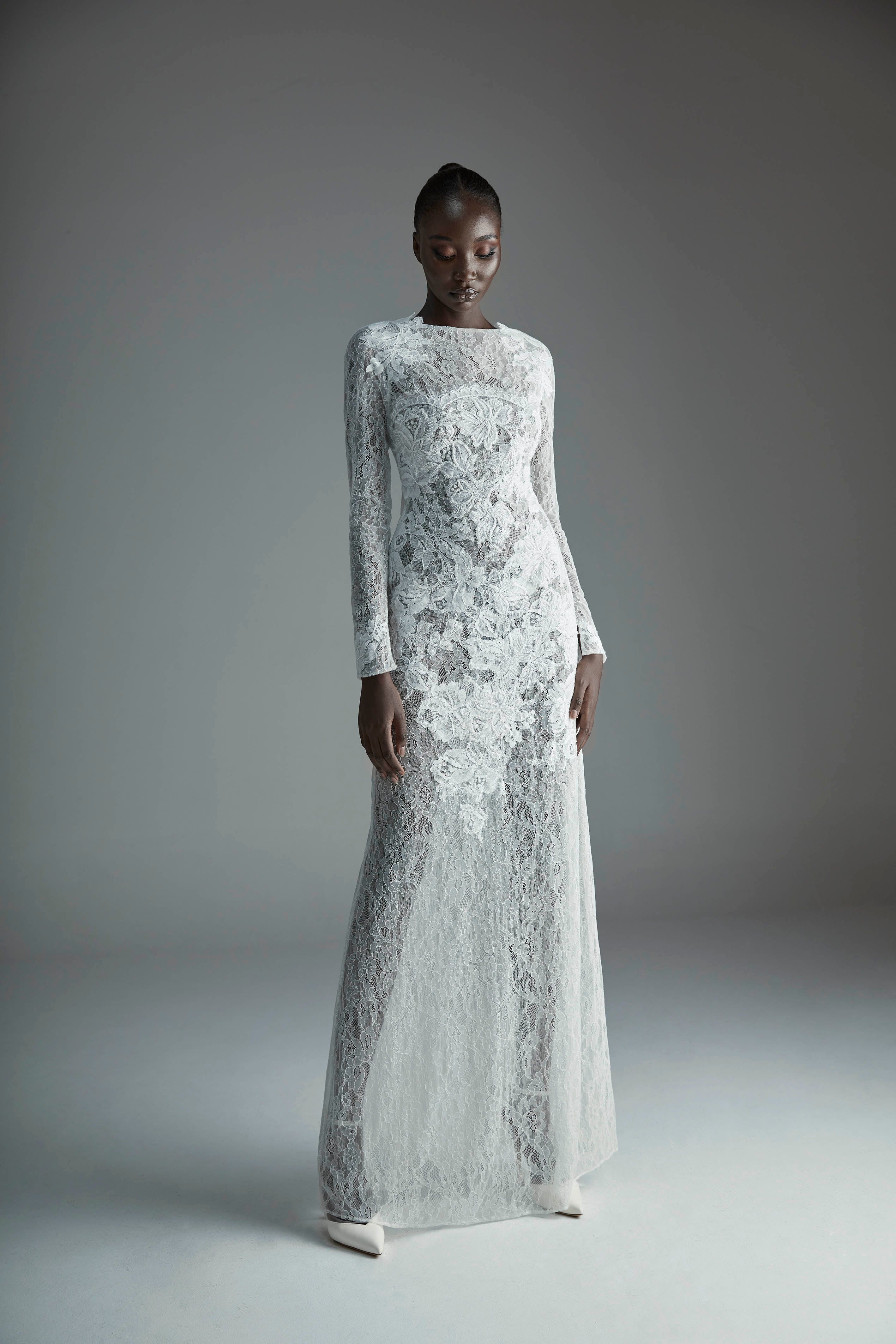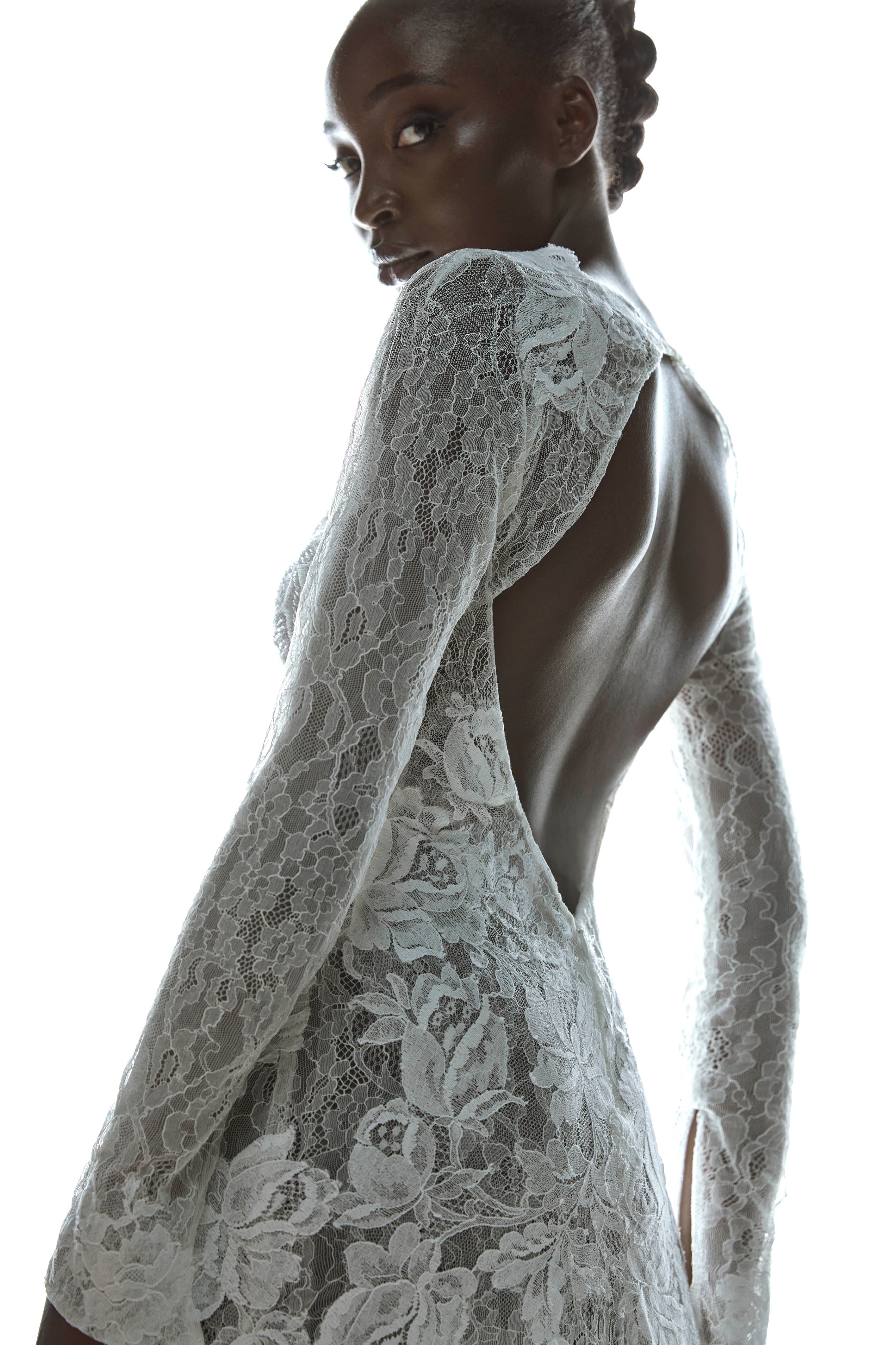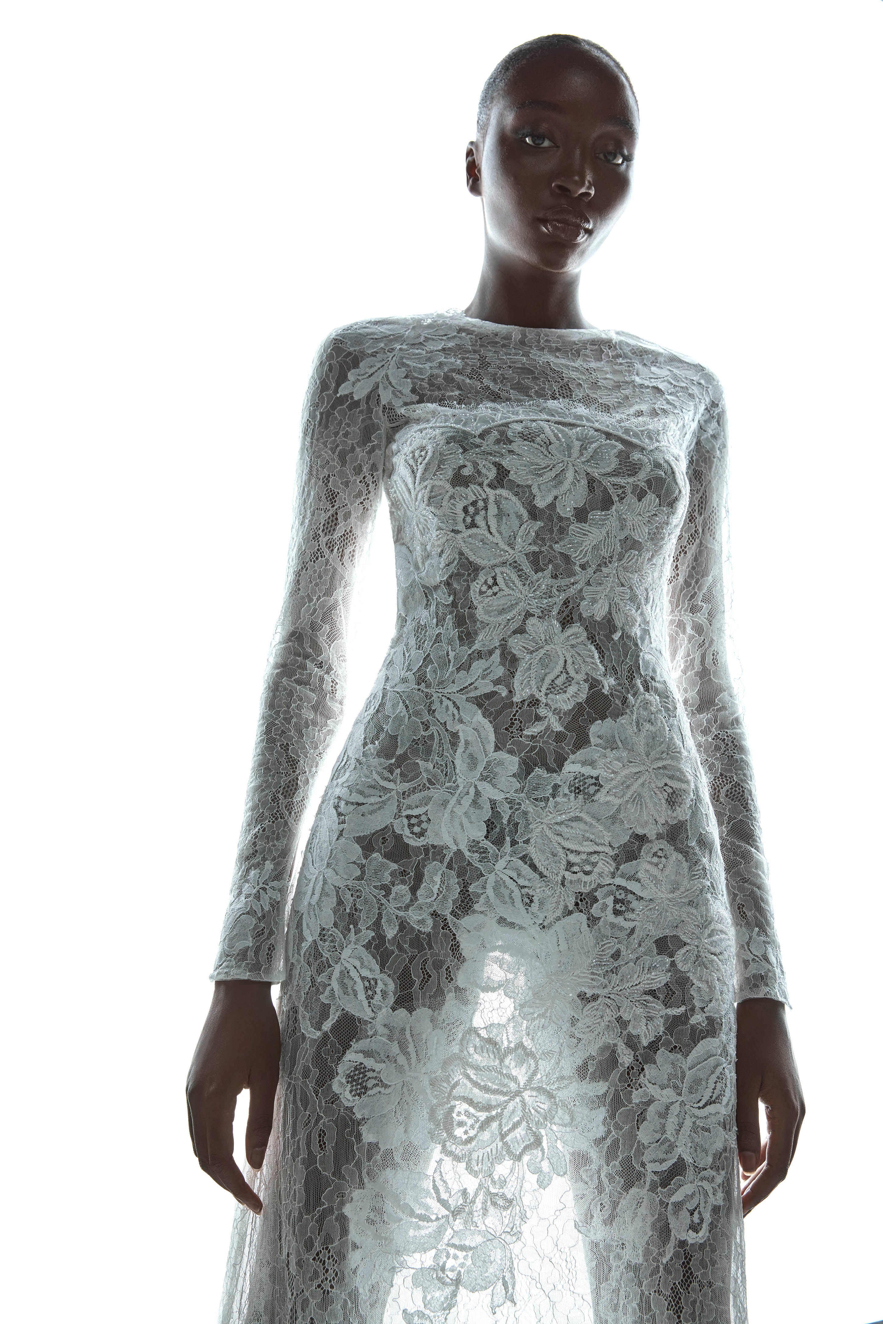 Column dress in stretch french chantilly lace on a tulle base. The cotton lace appliqués are handcrafted to create an asymmetrical and three-dimensional design, achieved through the use of embroidered appliqués. Long sleeves with slits.