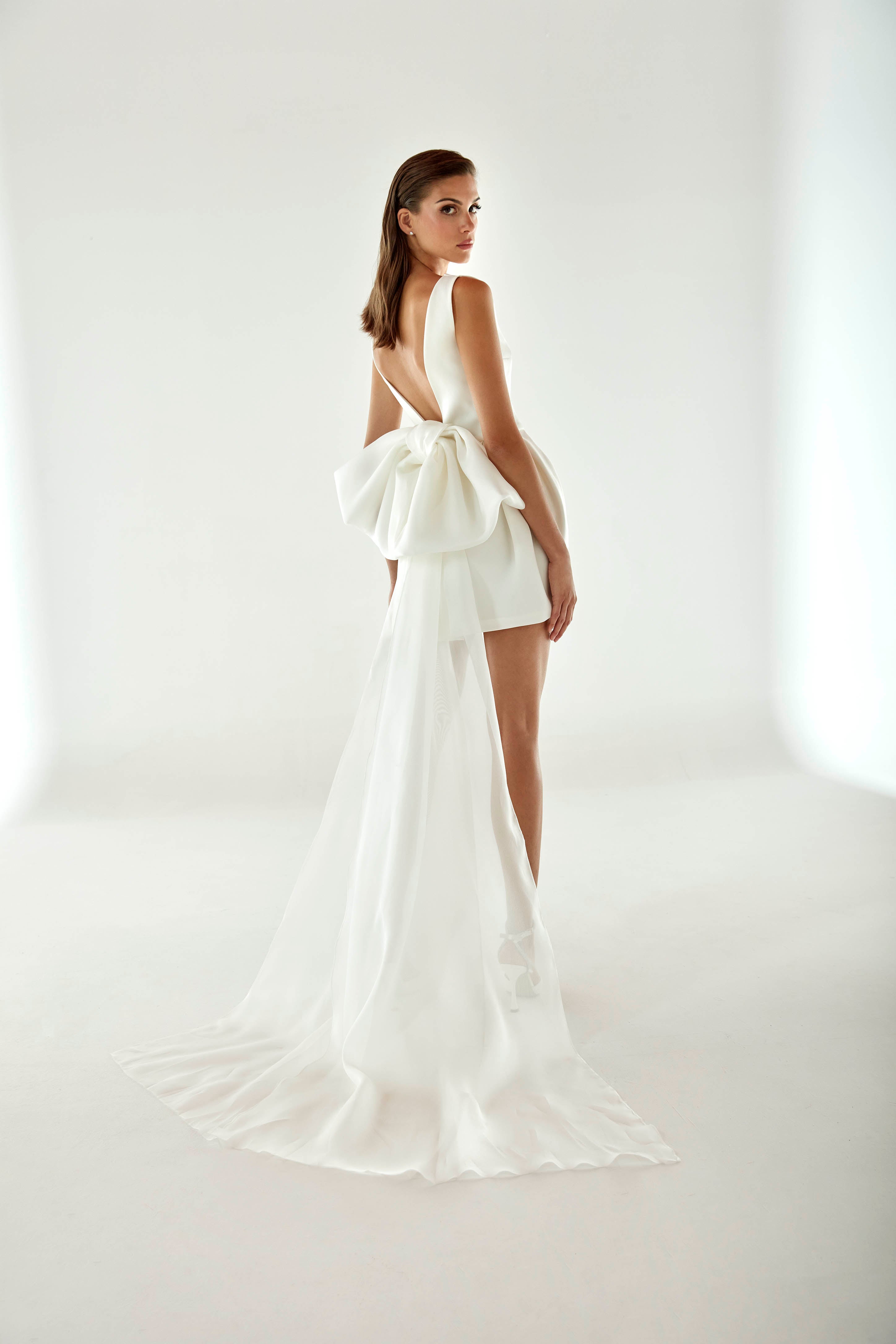 The look is completed with a detachable bow with long organza tails.