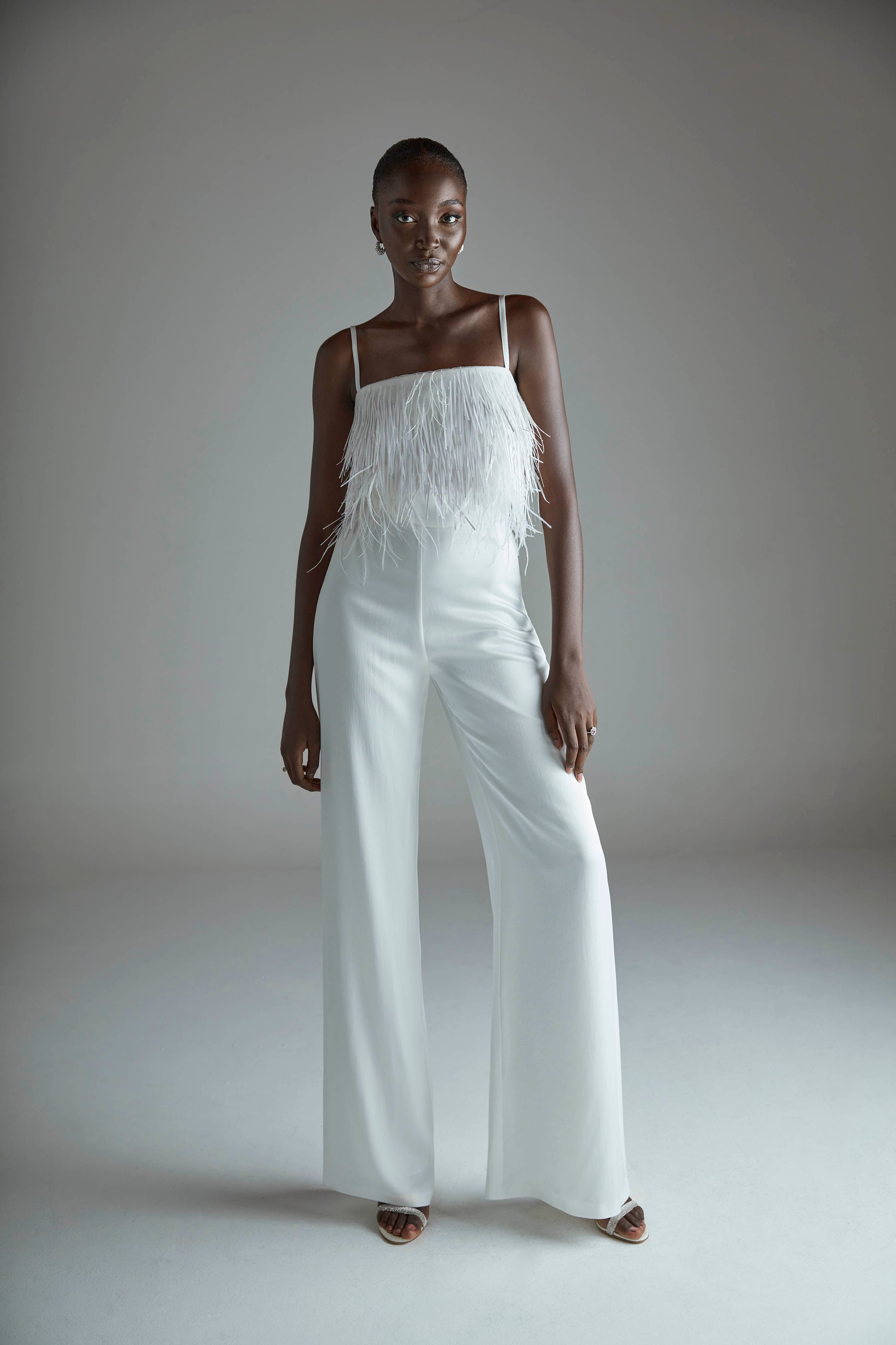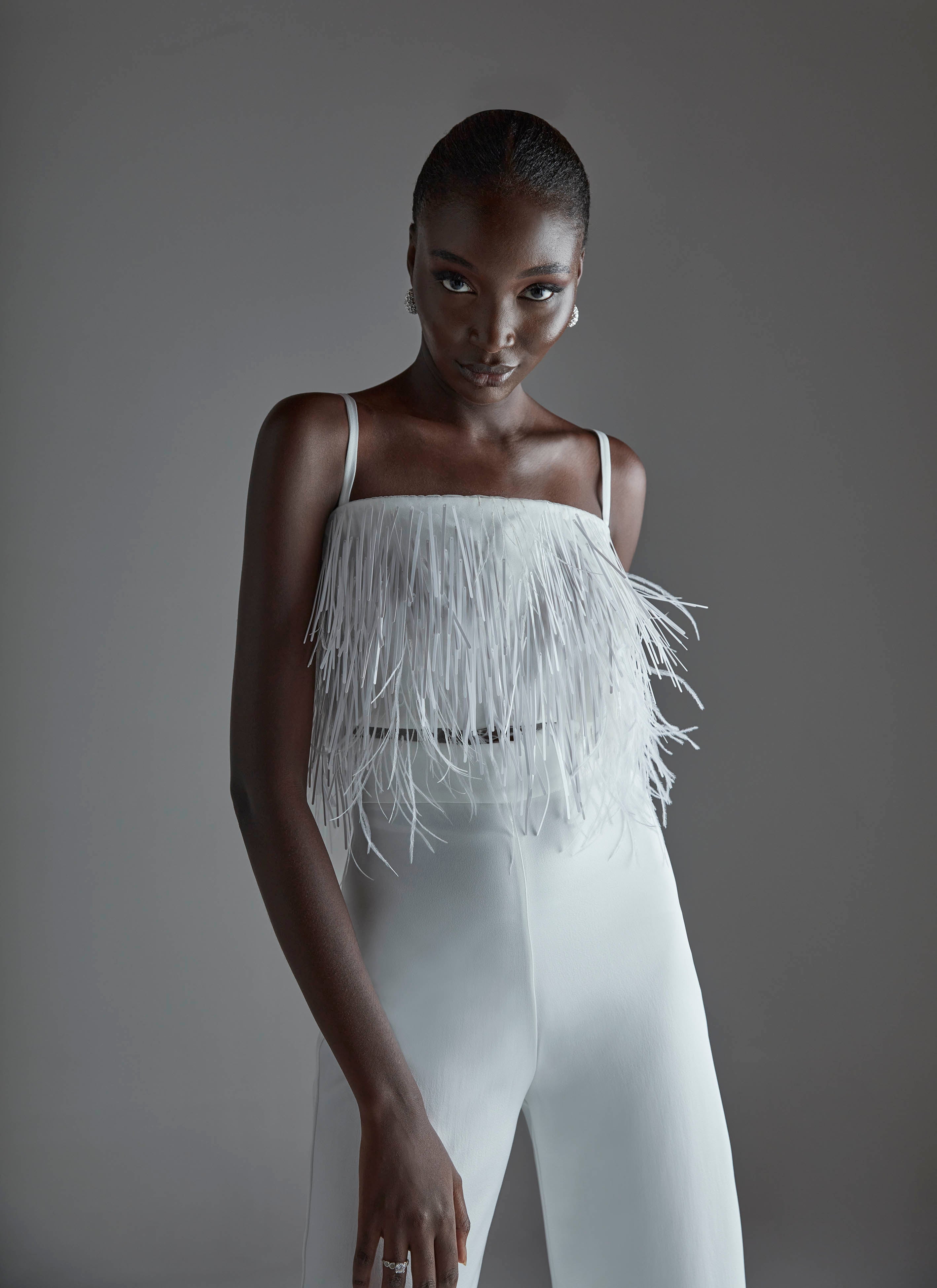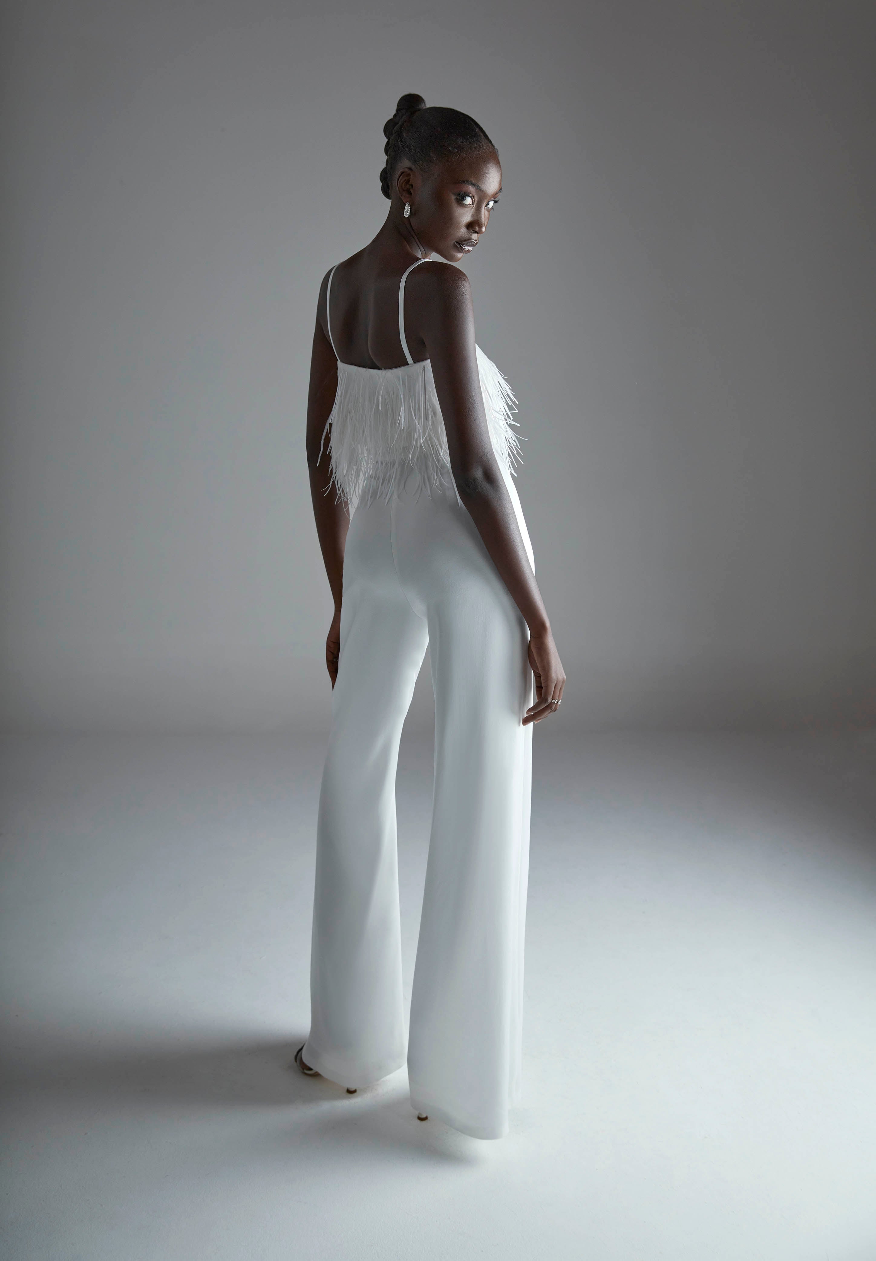 Embroidered tulle top with feathers and contrasting inserts. The straight neckline and thin crêpe straps add a modern touch to the top, perfect for your rehearsal dinner or a change of outfit. Tailored high-waisted palazzo pants made of enver crêpe.