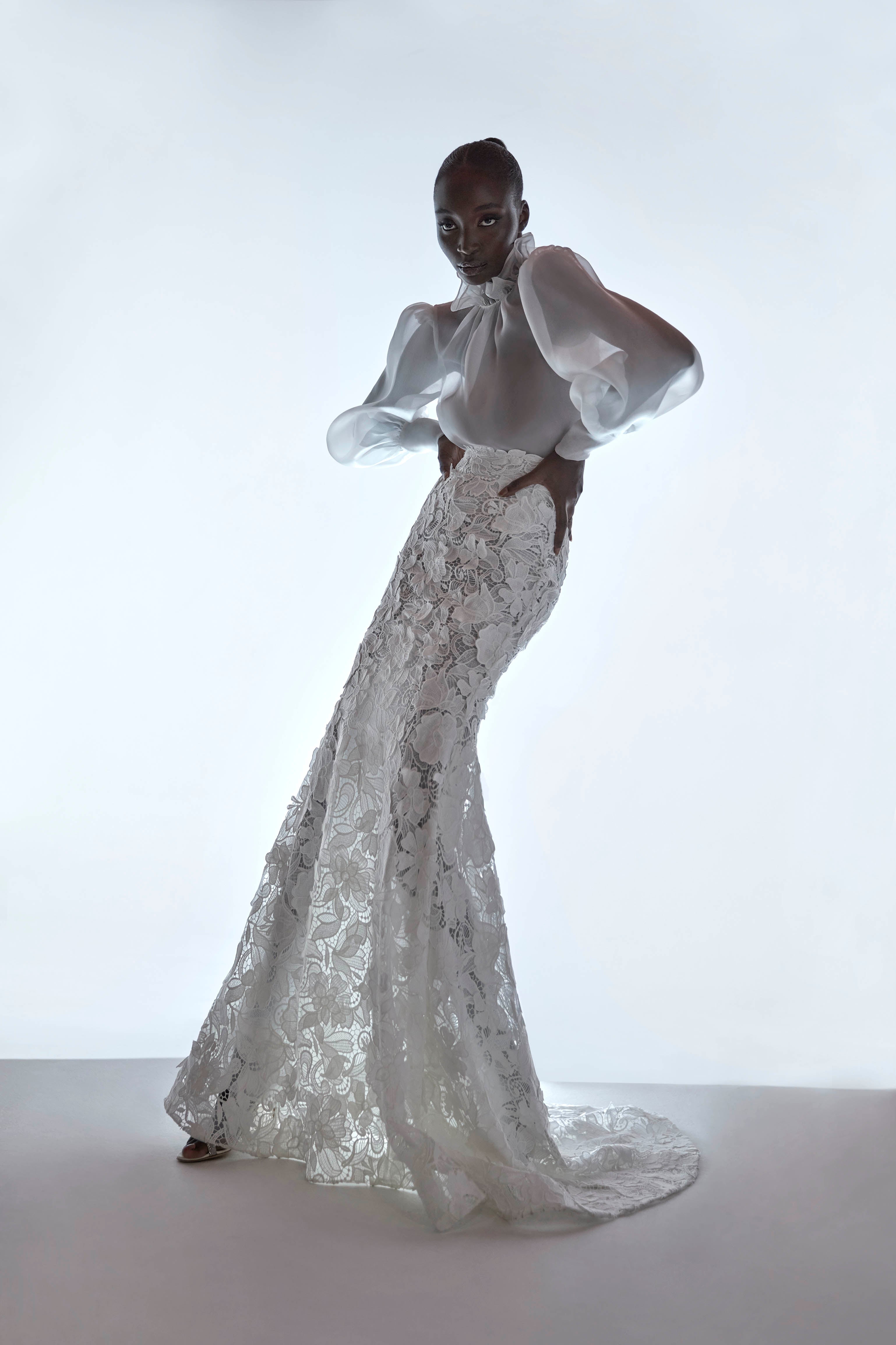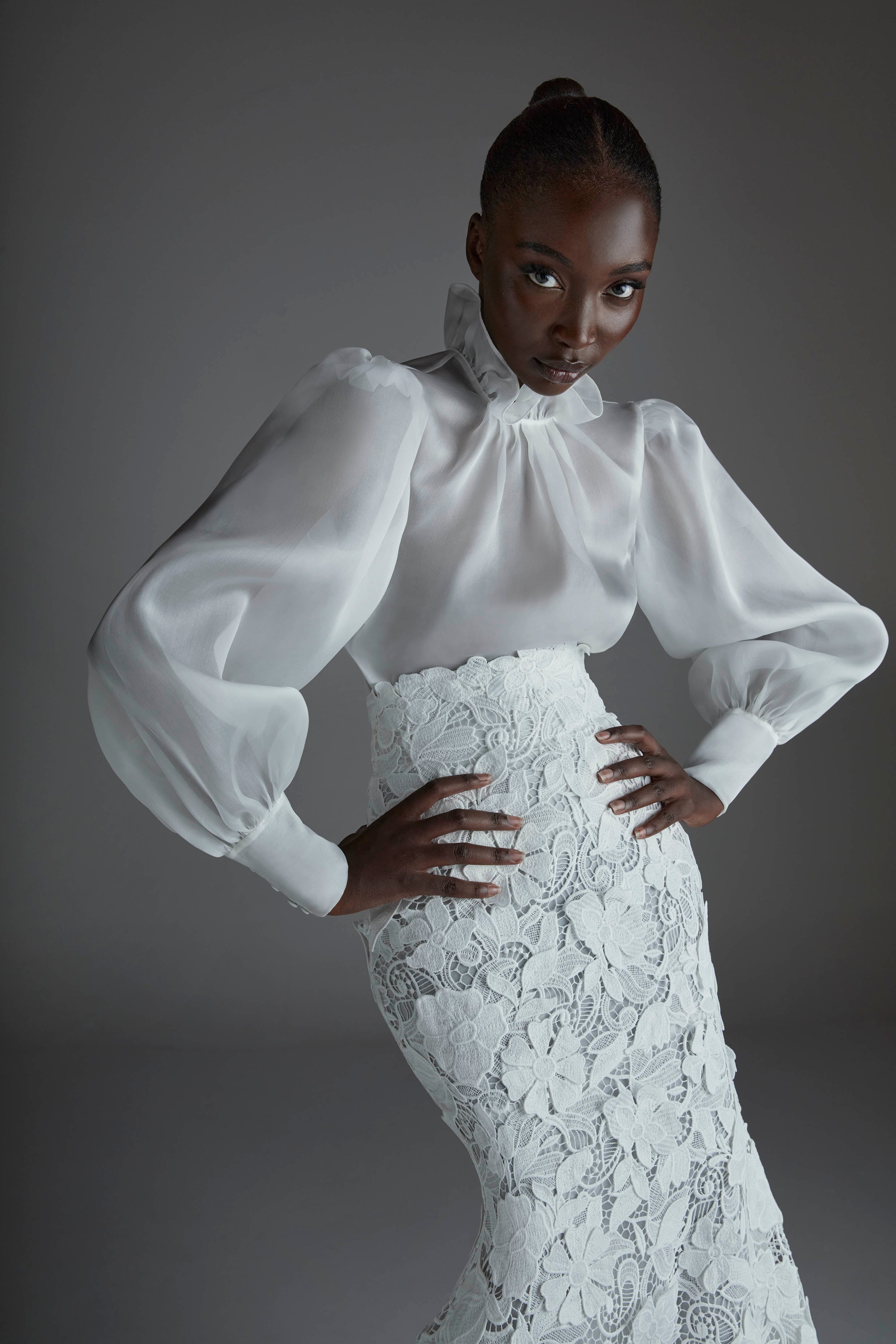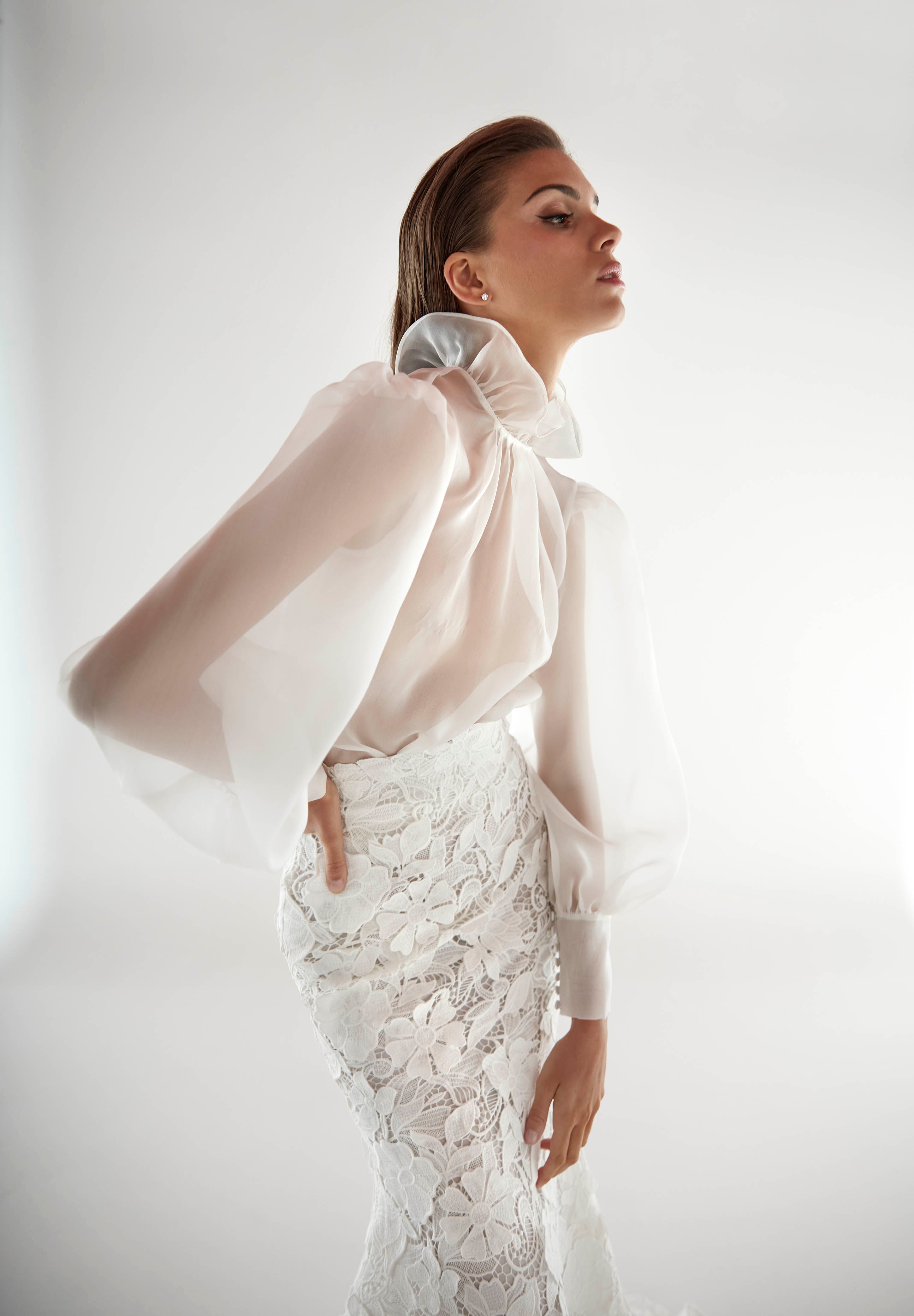 Shirt made of silk organza with an elegant high ruffled collar and wide puffed sleeves finished with cuffs featuring buttonholes and buttons. The mermaid skirt in guipure lace has a high-waisted design and a figure-hugging silhouette that perfectly wraps the body. The skirt is adorned at the waist with applied 3D elements.