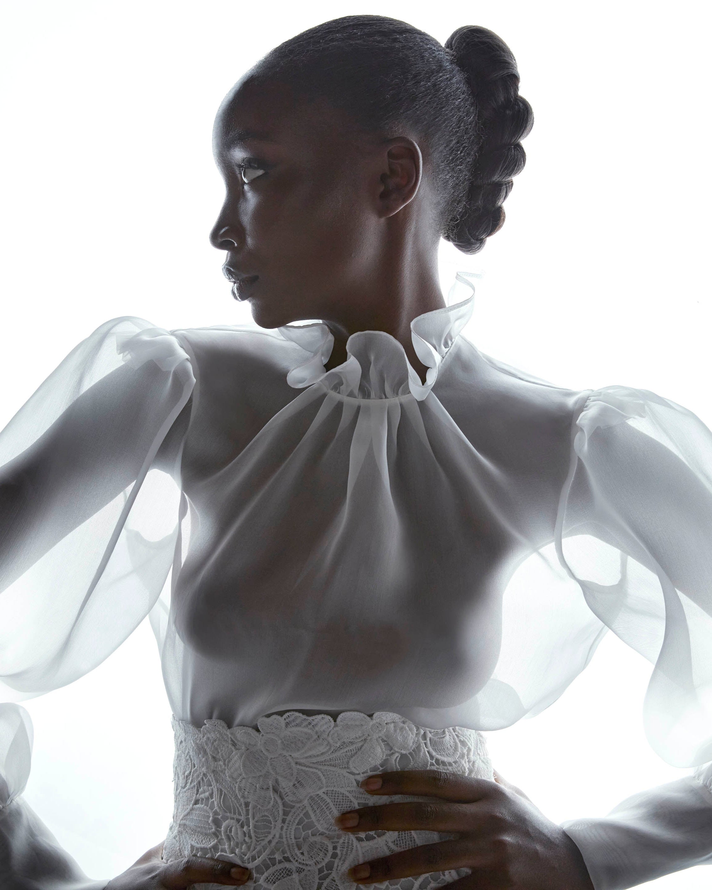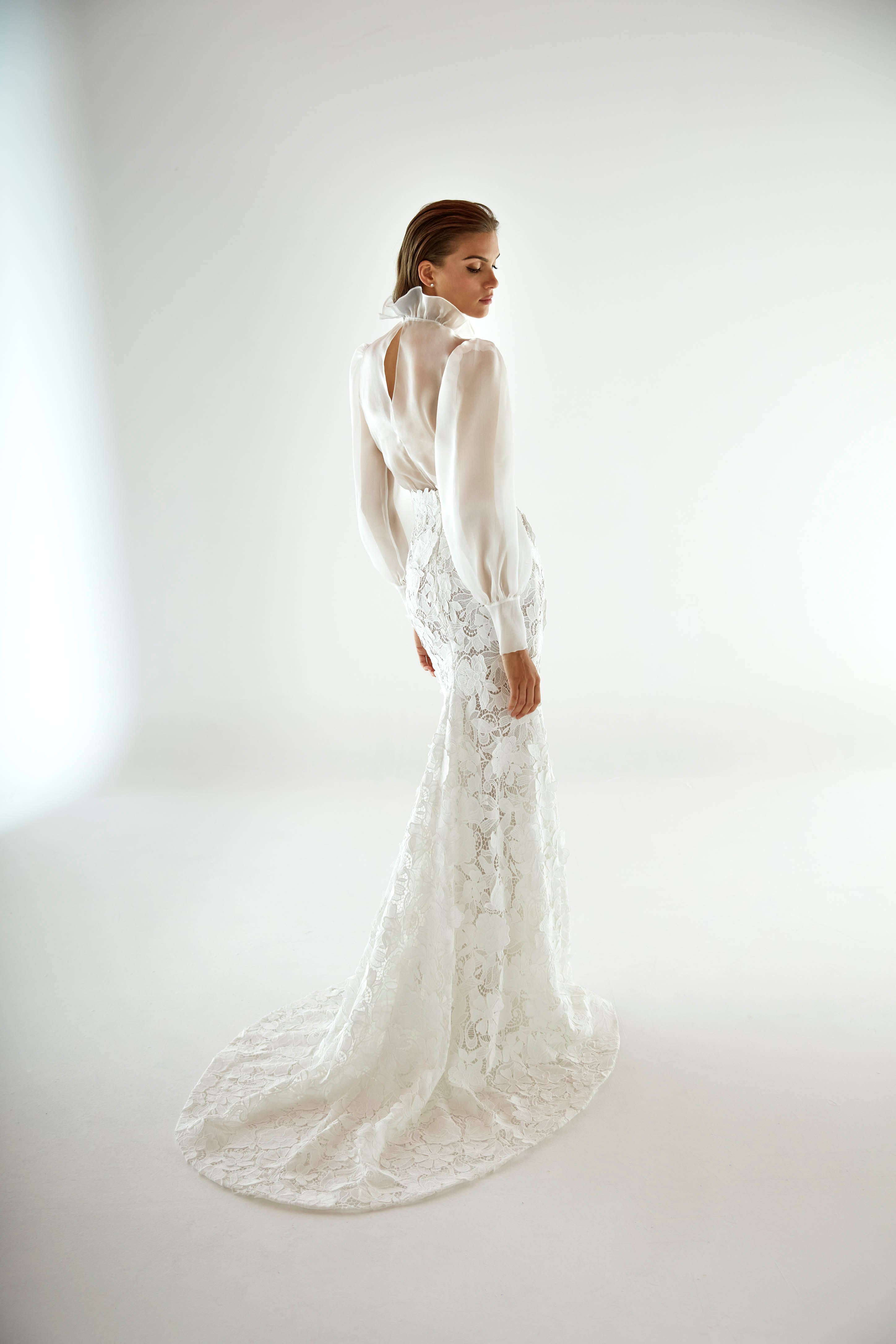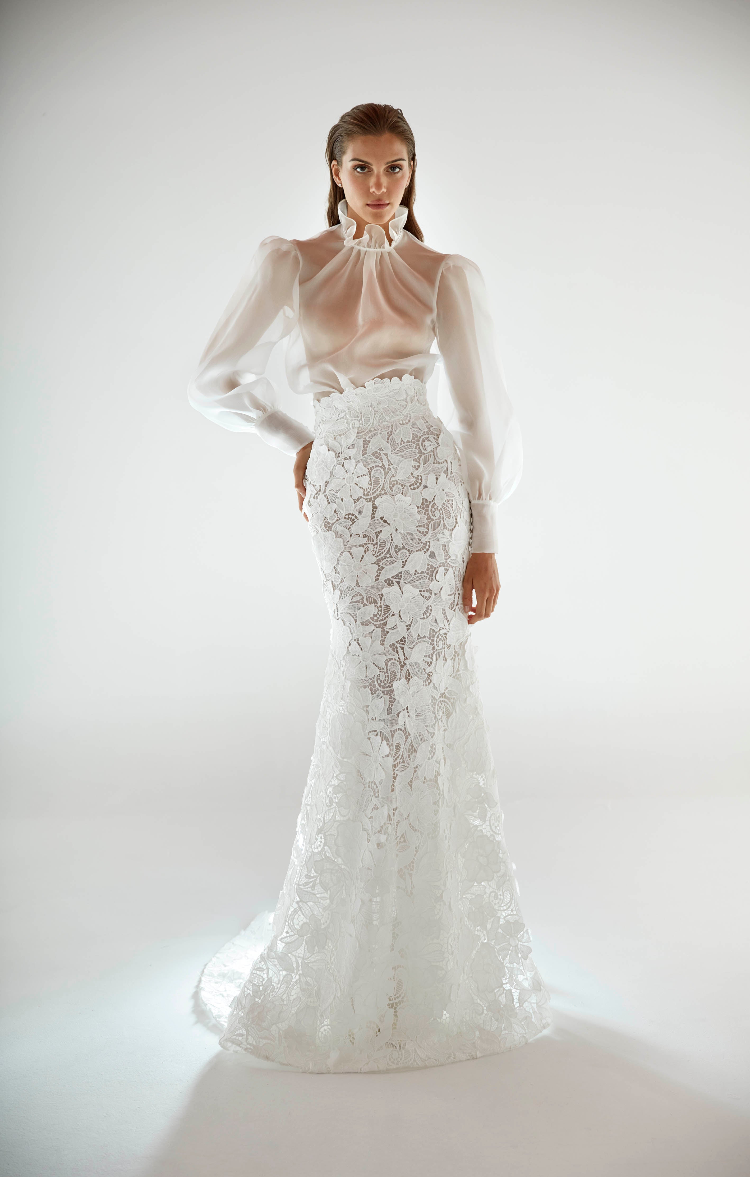 Shirt made of silk organza with an elegant high ruffled collar and wide puffed sleeves finished with cuffs featuring buttonholes and buttons. The mermaid skirt in guipure lace has a high-waisted design and a figure-hugging silhouette that perfectly wraps the body. The skirt is adorned at the waist with applied 3D elements.