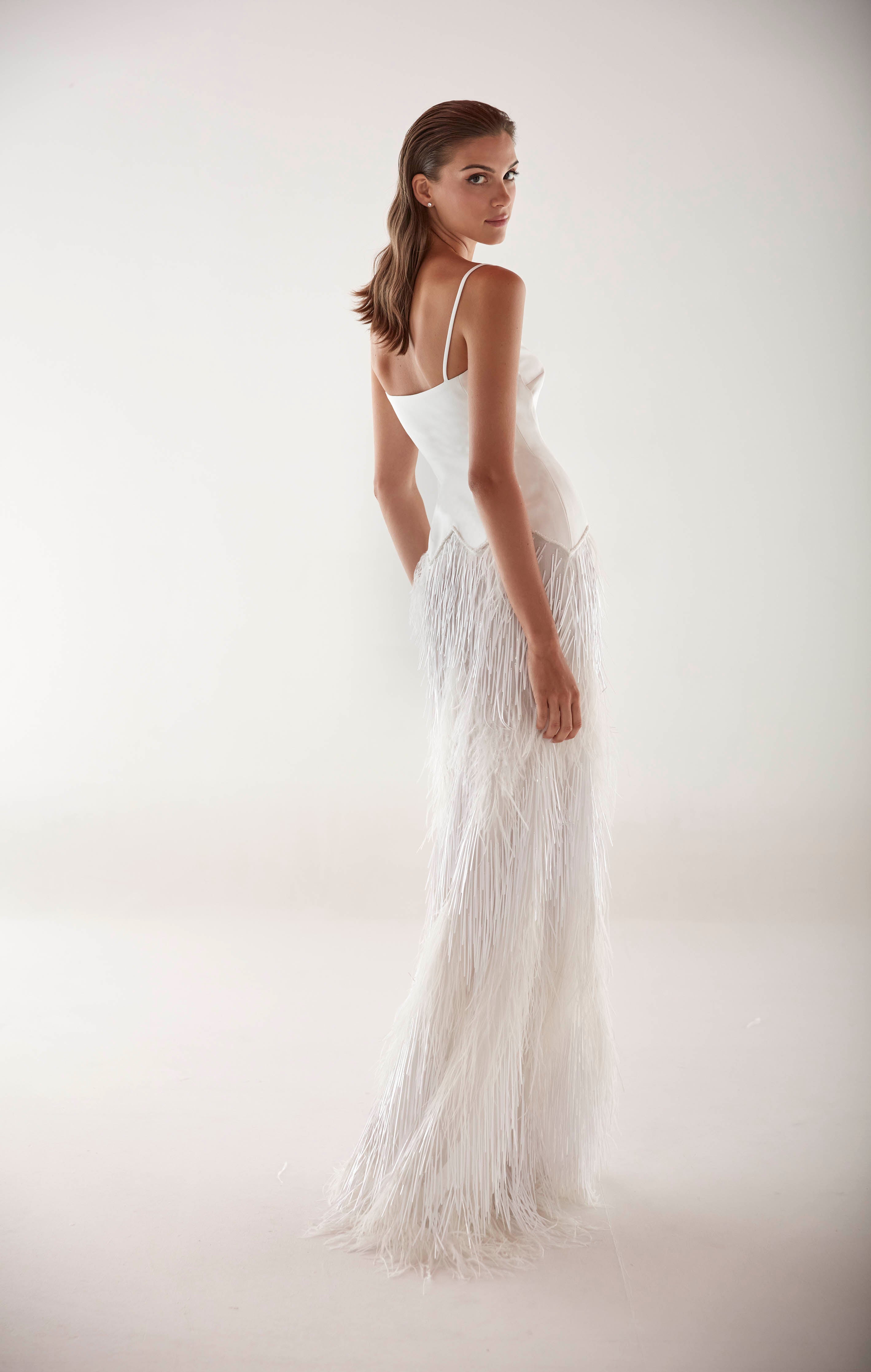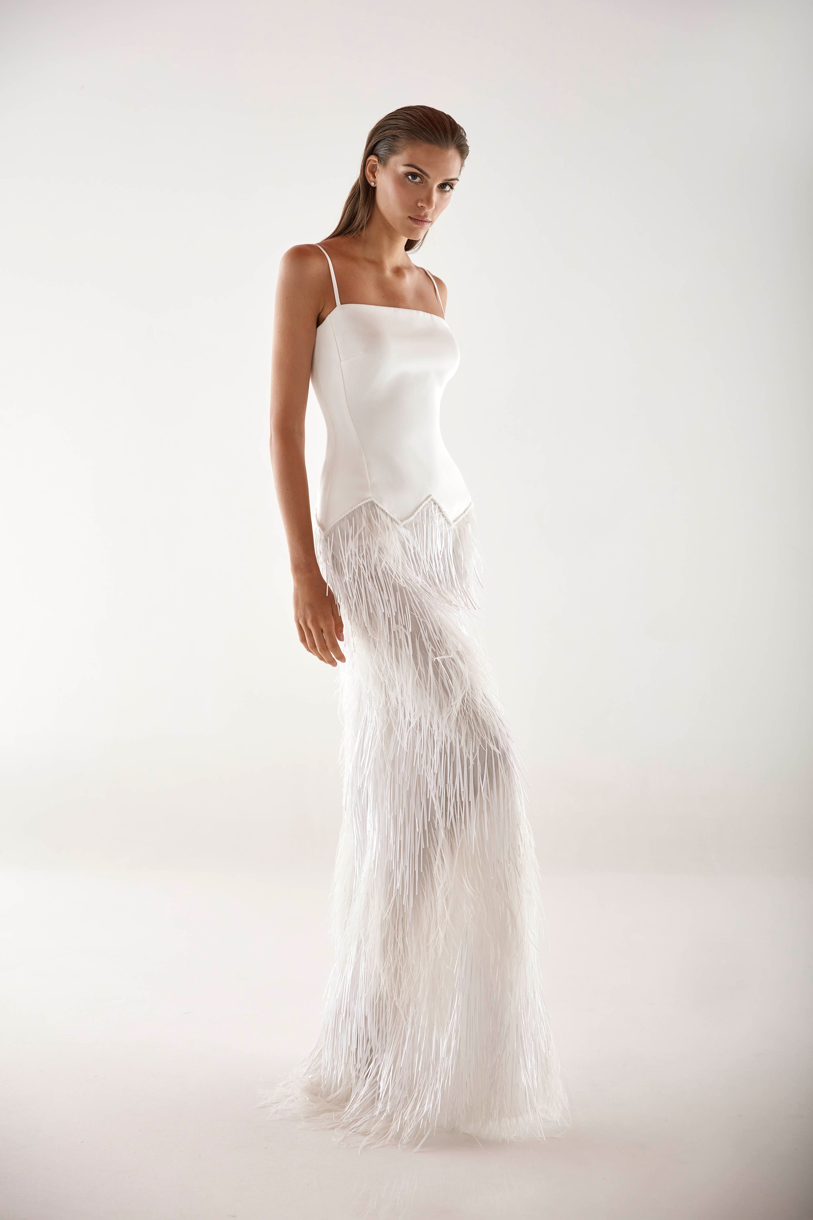 Flowing gown in crêpe with a dropped waist, embellished with beaded embroidery. The trimming that connects the bodice and the skirt is finely hand-placed, following a geometric design. The skirt is made of embroidered tulle with feathers and contrasting inserts.