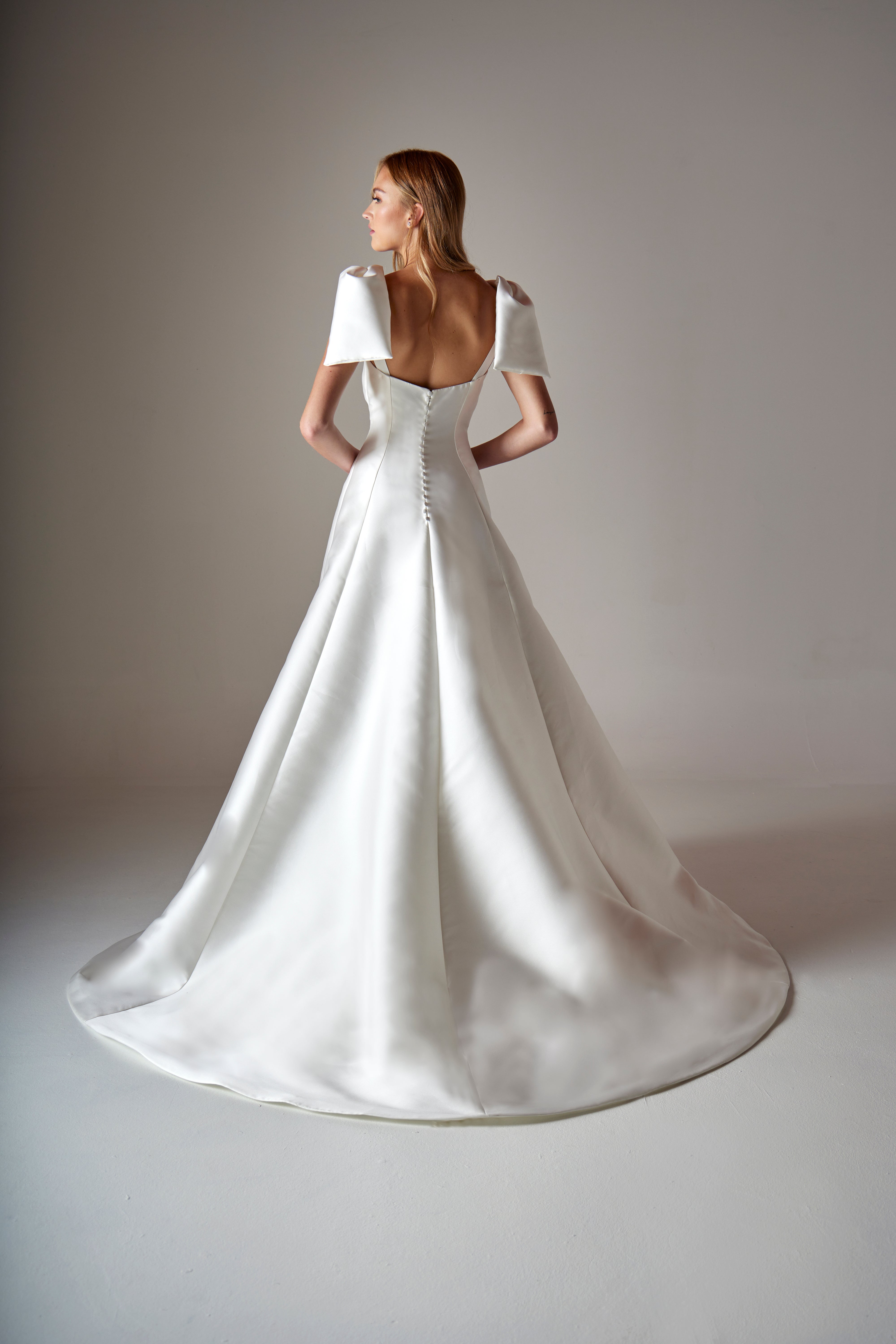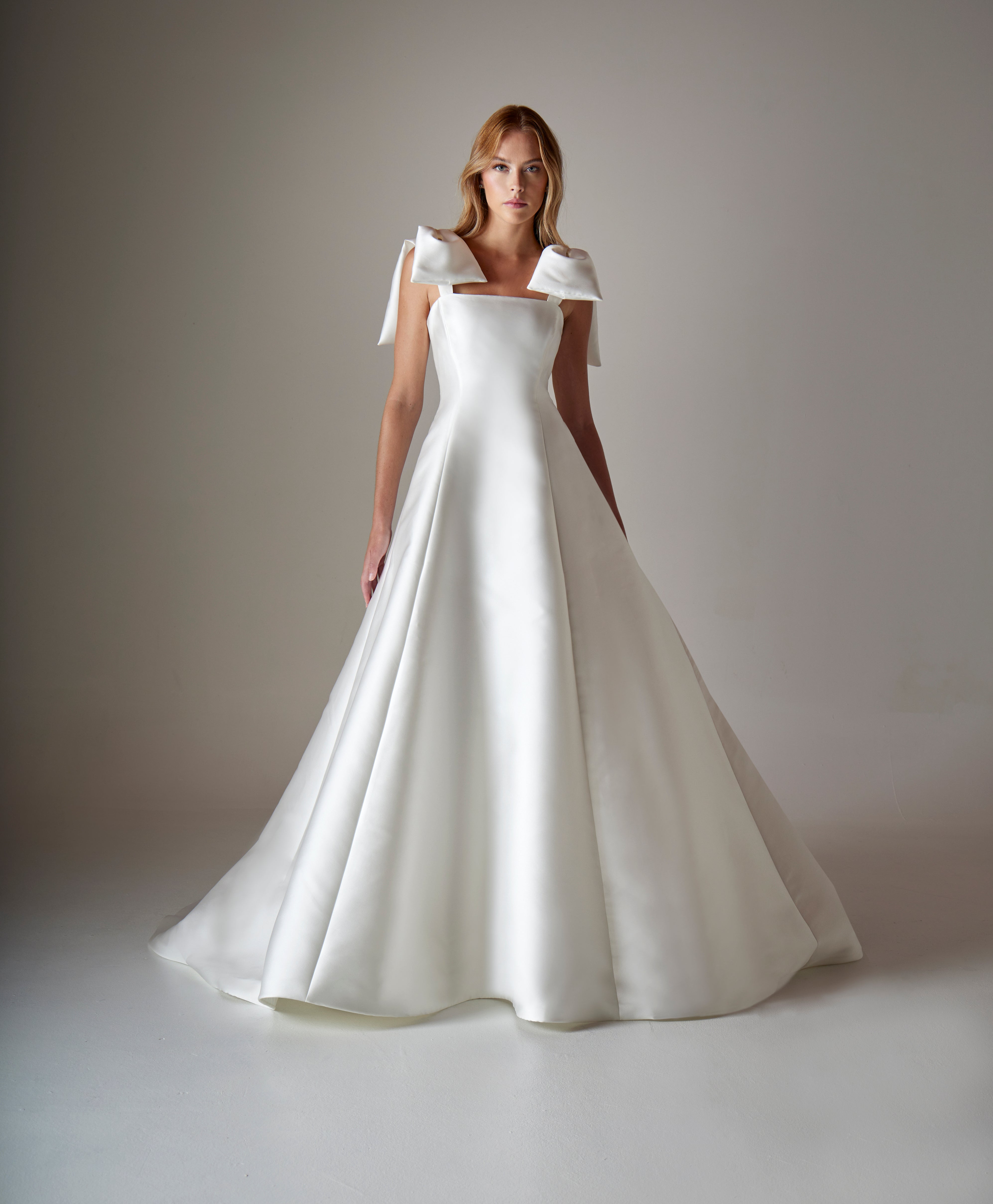 Mikado redingote defined by clean, refined lines. The shoulder pads with detachable bow delicately transform the look, shifting from minimalist elegance to a more romantic, feminine detail. A minimalist yet sophisticated design that celebrates elegance without excess.