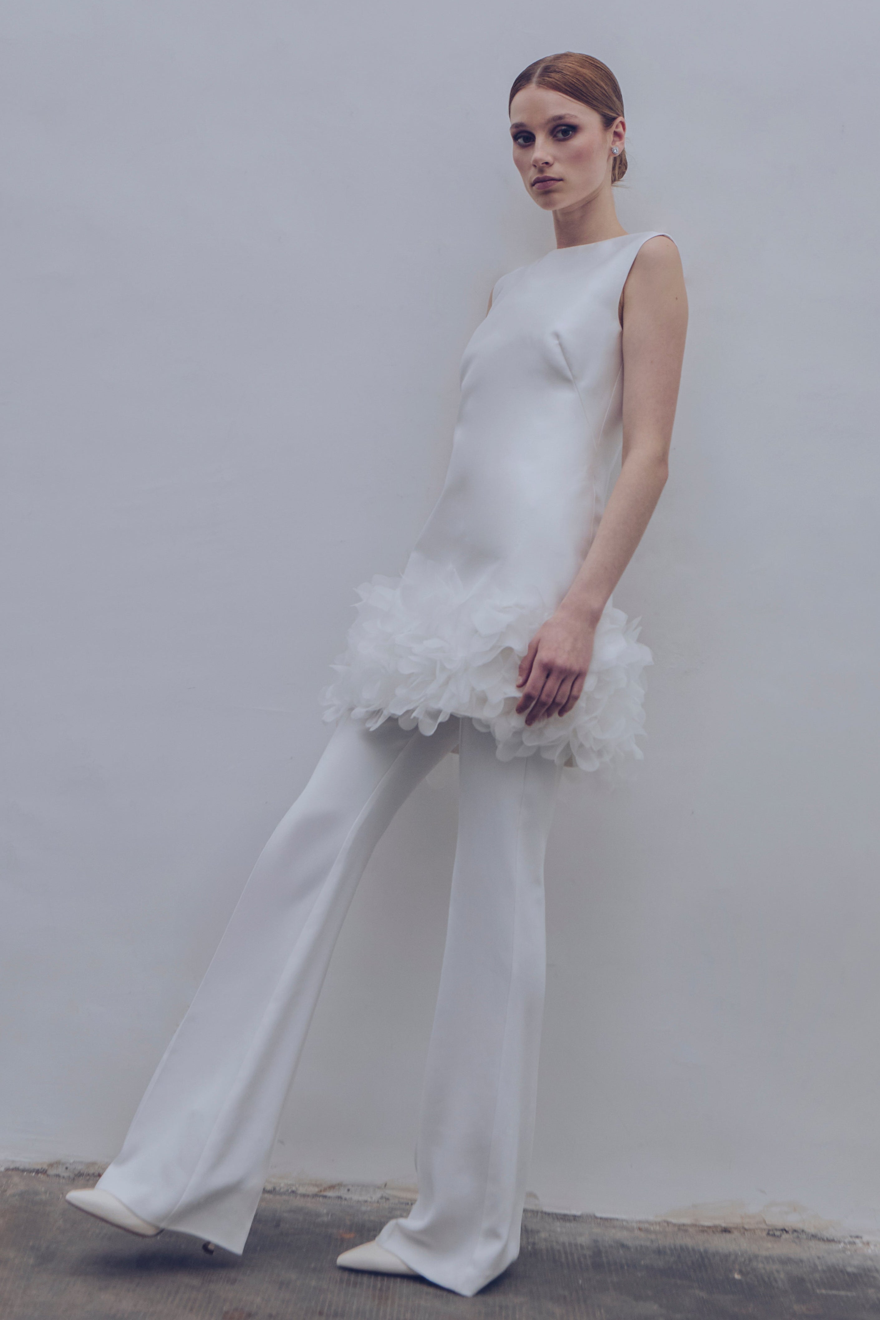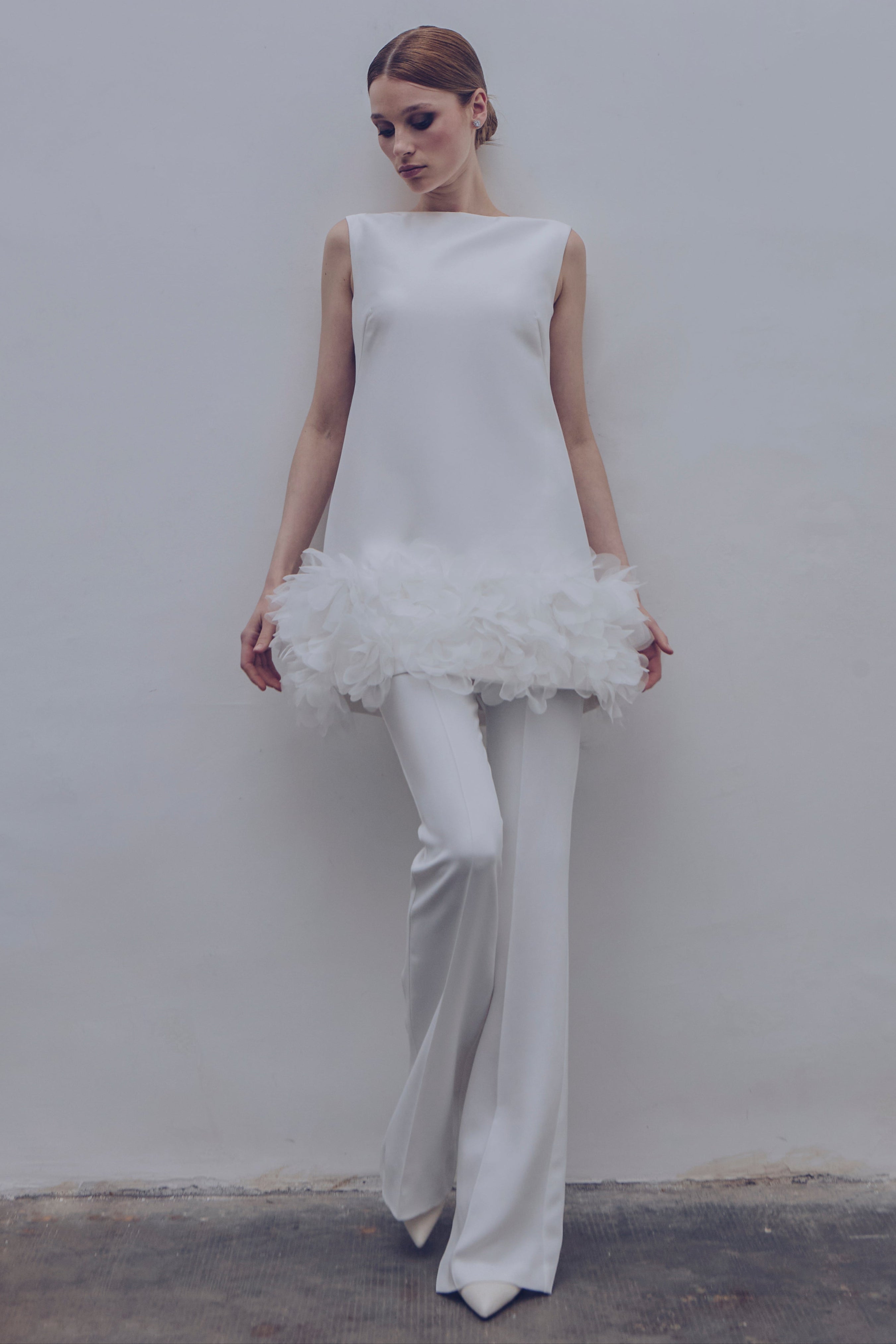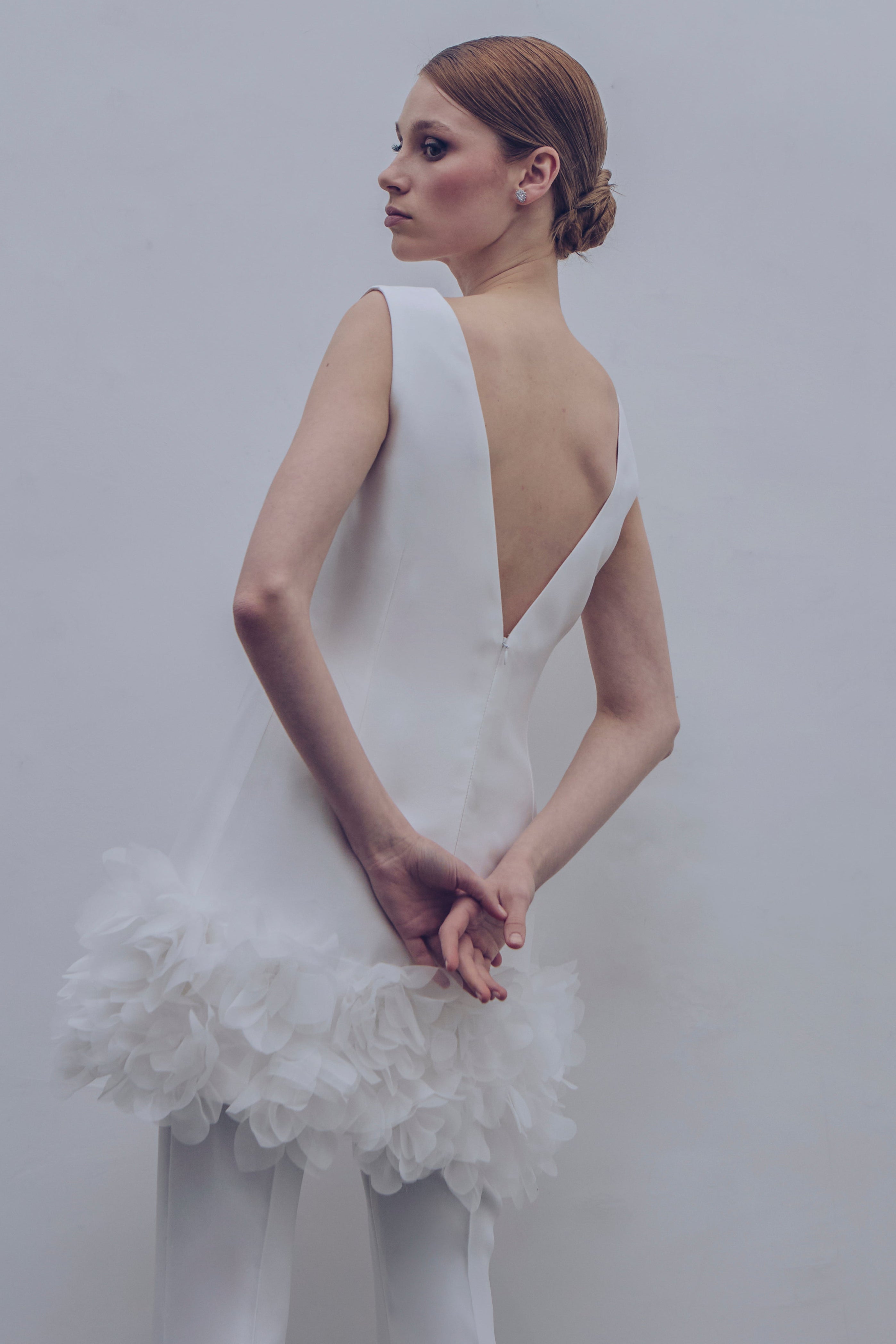 Softly shaped A-line silk blend mikado short dress with tulle band and 3D organza flowers. 60s inspiration for a transformable minidress to be paired with fit & flare pants. Purity of form enhanced by romantic details.