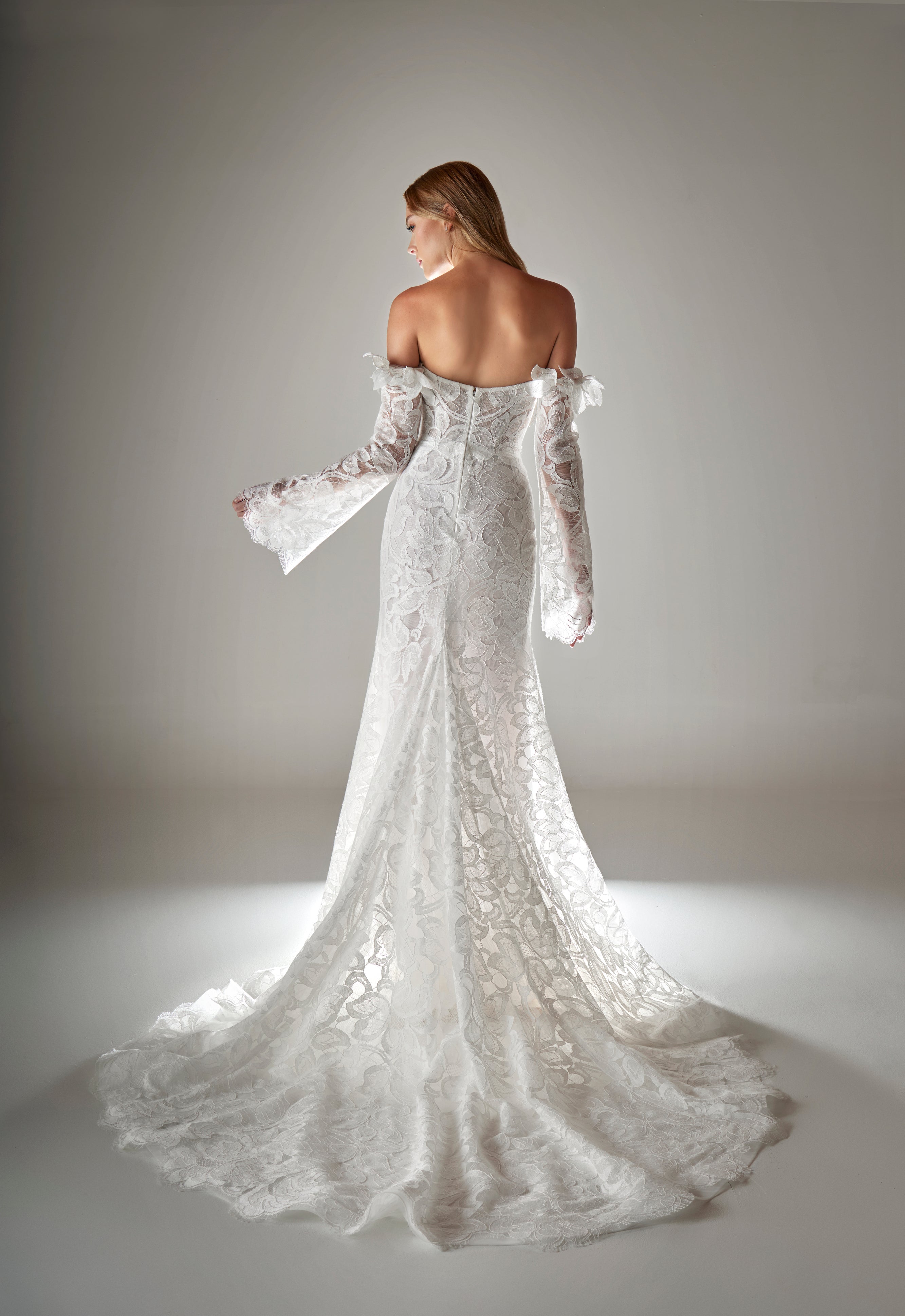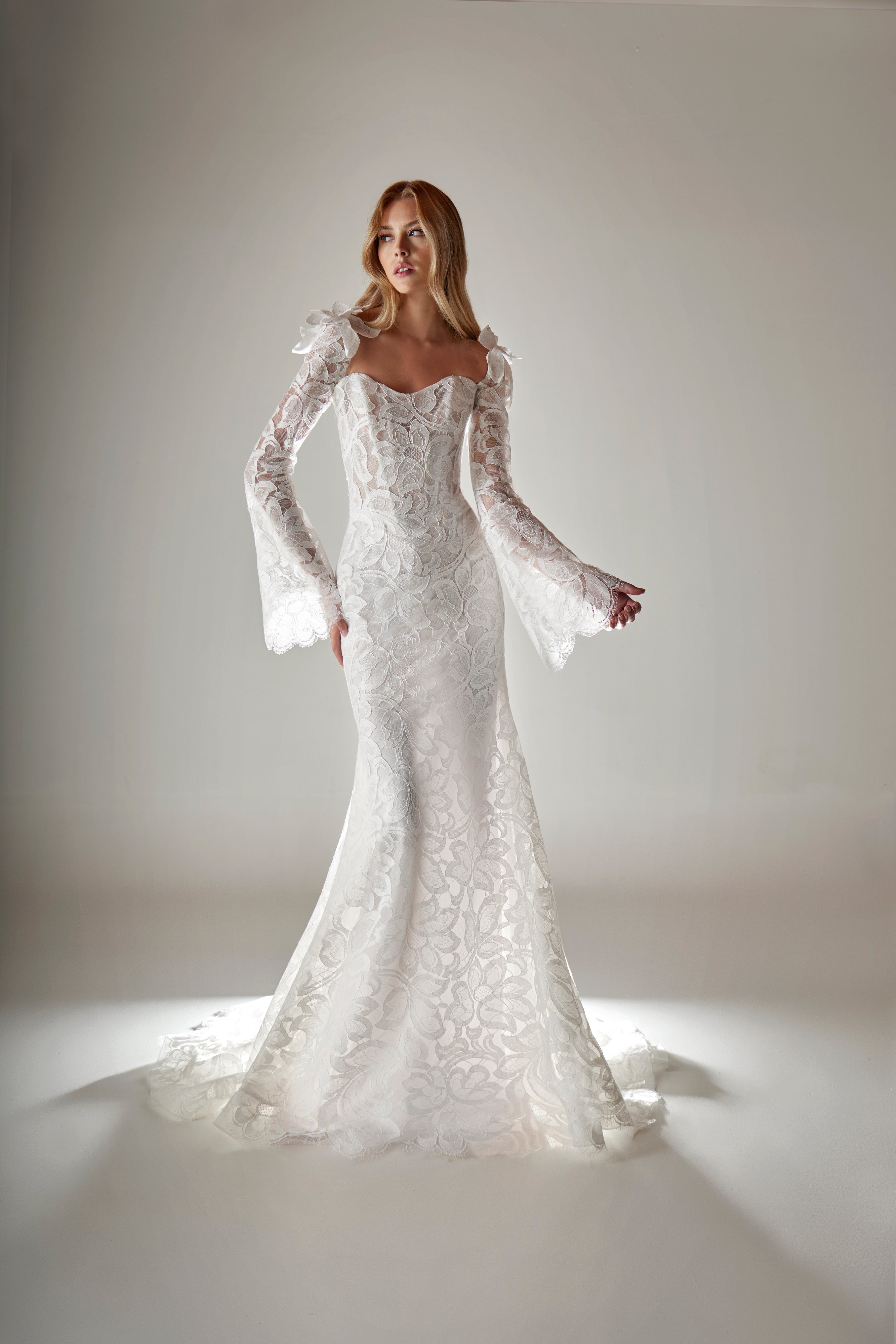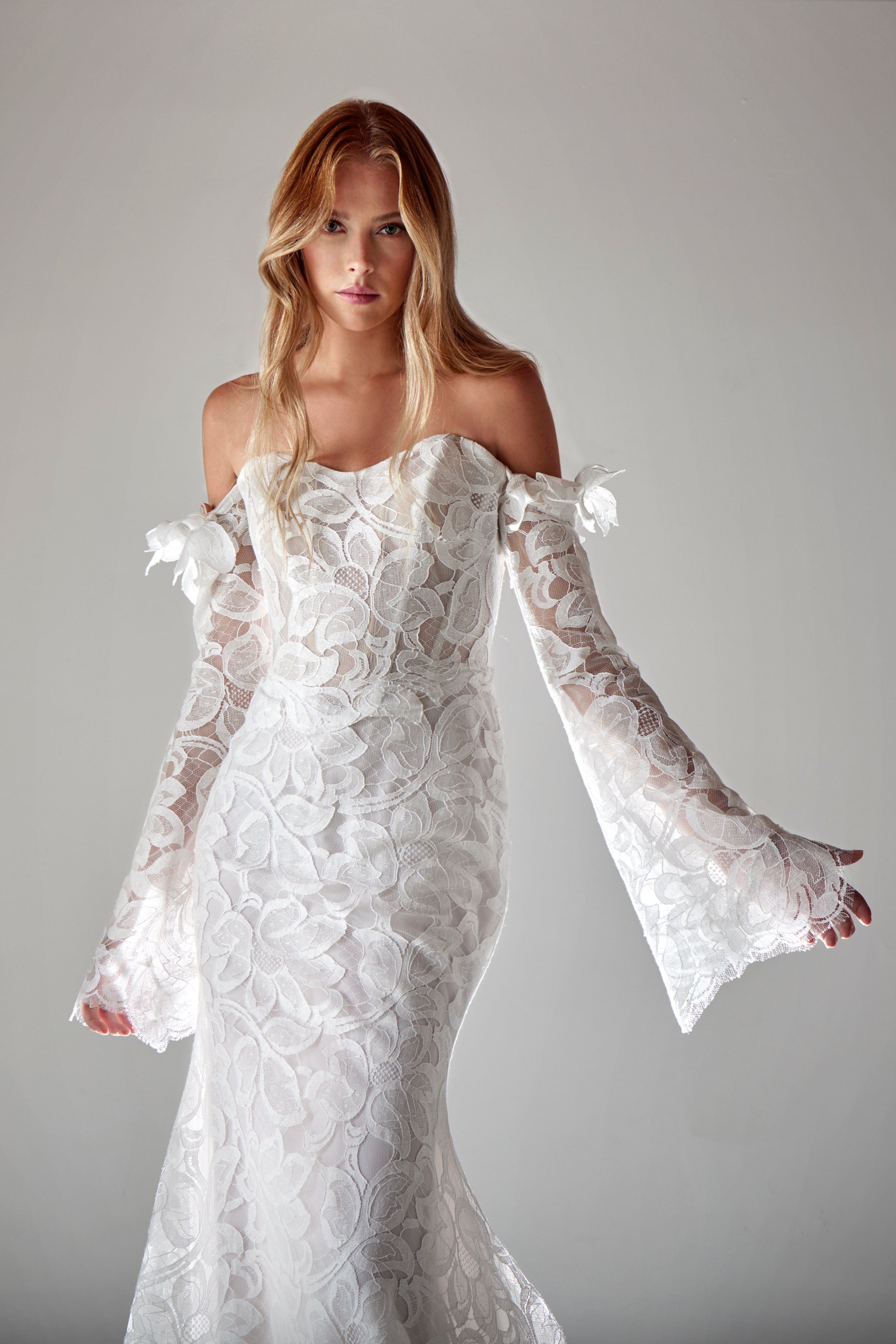 French lace mermaid dress with see-through structured corset and detachable sleeves. Lace scallop and 180 cm train length add romance. V-shaped waist enhances the figure, while hand-applied 3D flowers add handcrafted preciousness.