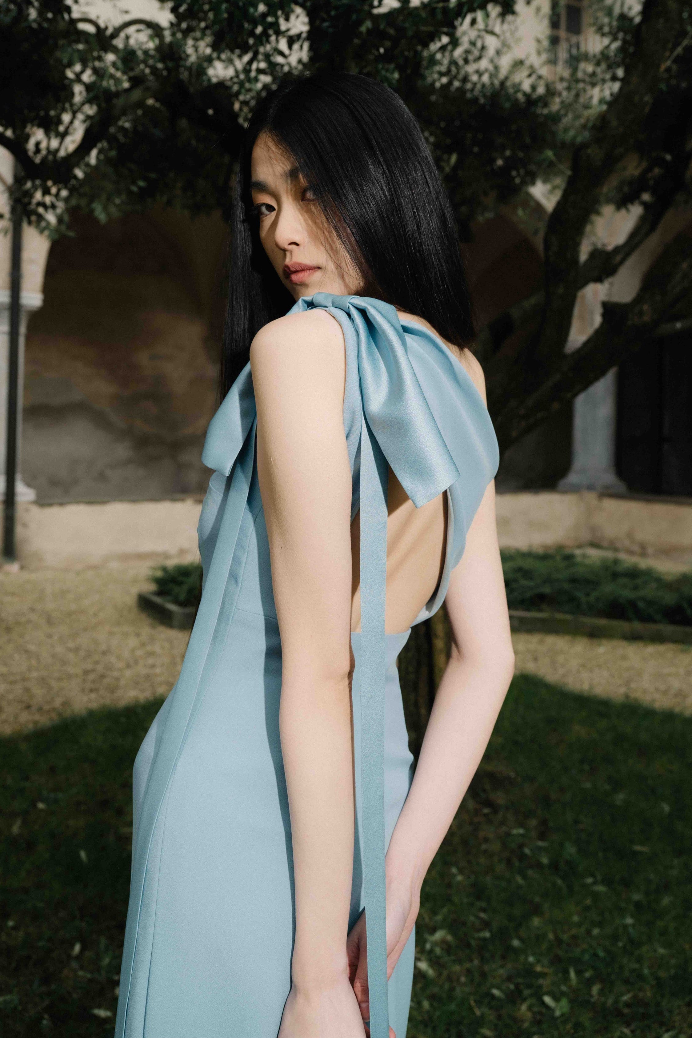 A dress that combines modernity and class with a refined asymmetrical design. The one-shoulder bodice, embellished with a wide fabric bow, elegantly envelops the figure. Draped bands at the back create an unprecedented interplay of lines. The composure of the column silhouette is made feminine by the slit at the back of the dress, which lends movement and lightness.