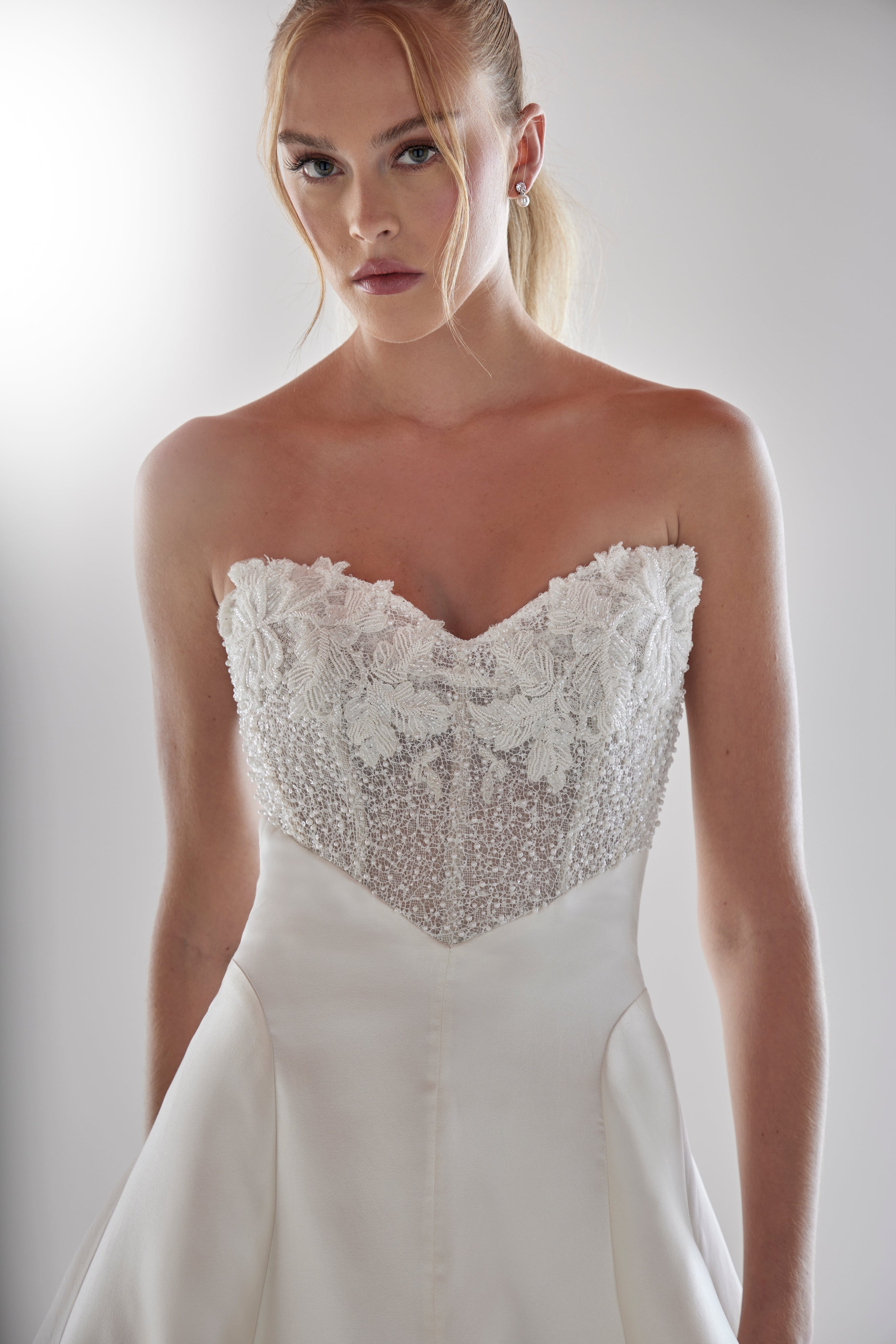 Silk blend mikado wide dress with see-through structured bodice with beaded lace and applications. Geometric cuts define the waist point and open the skirt into sculptural volume. 190 cm train length. Refined, structured, dramatic.