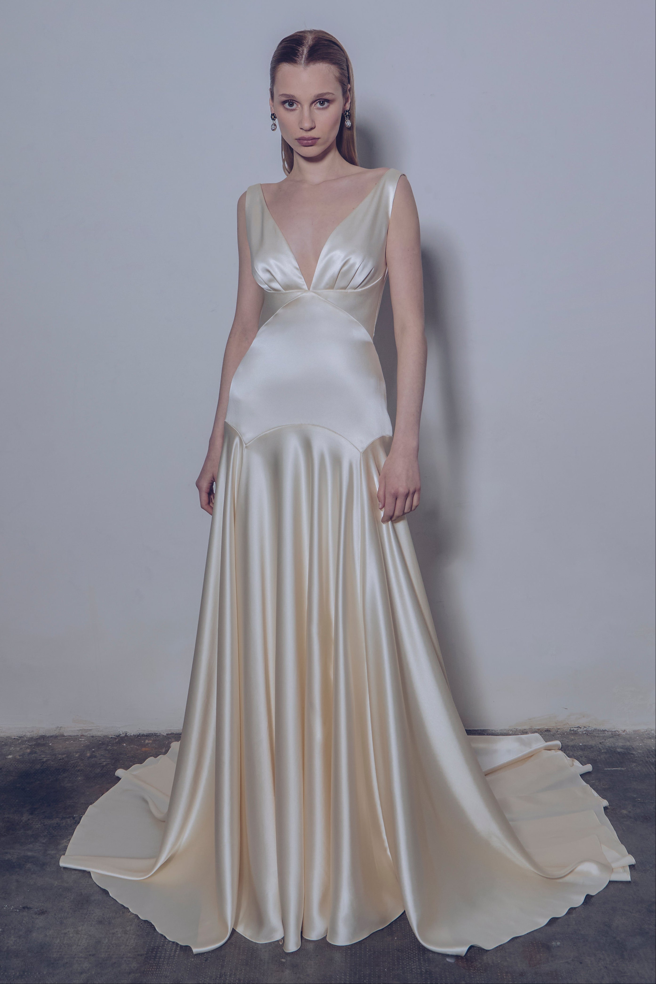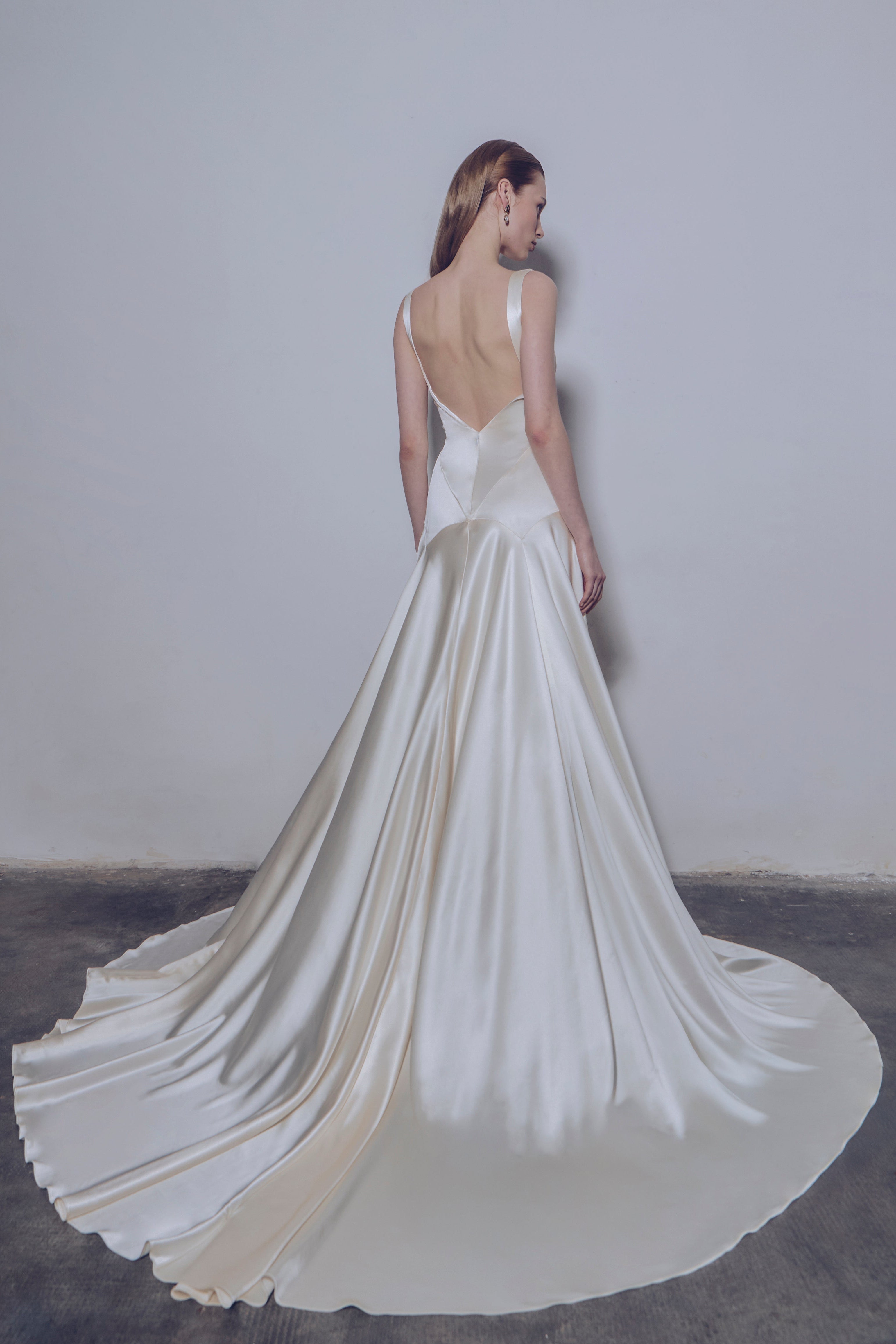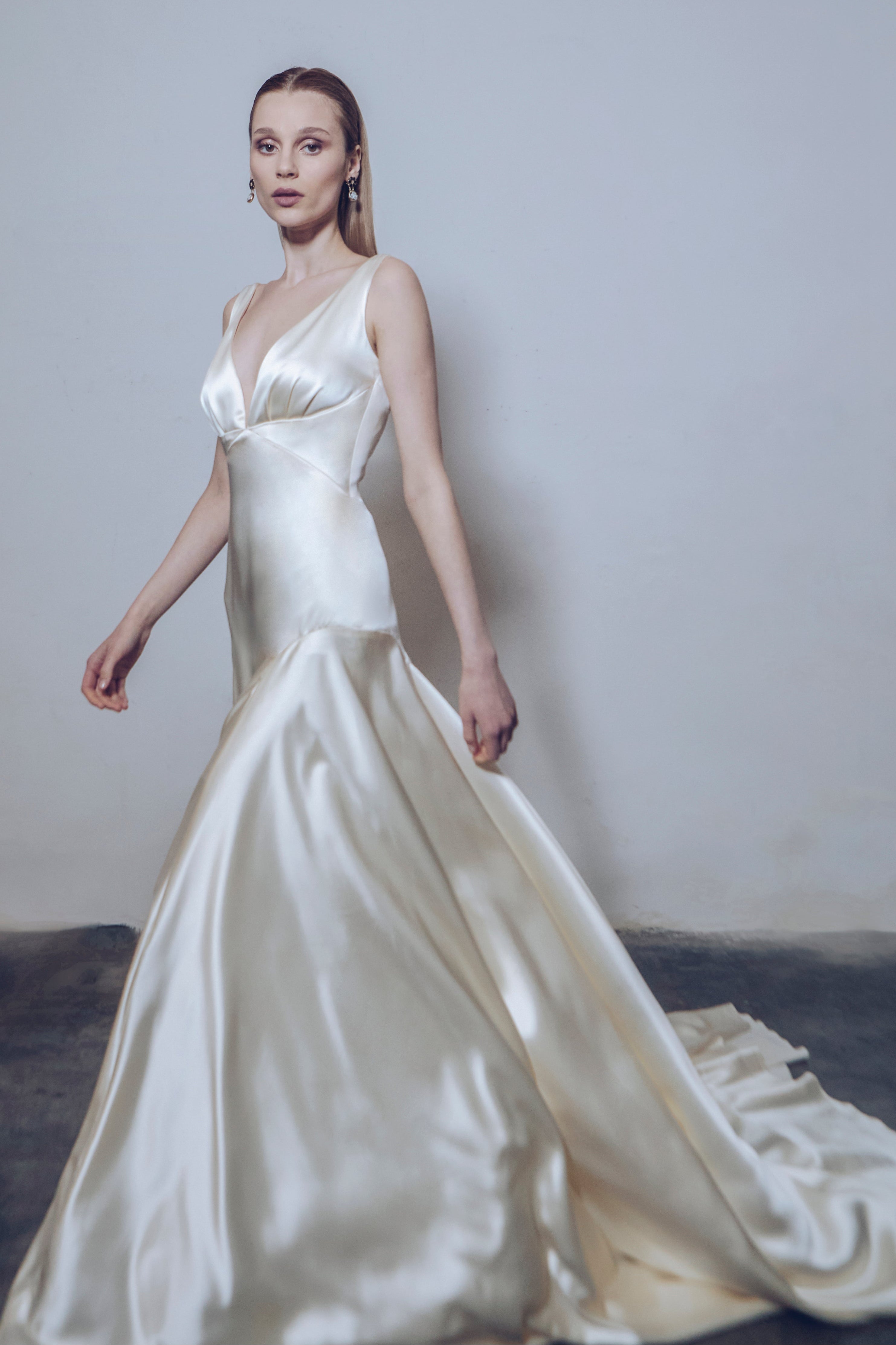 Viscose blend satin flow dress with geometrical cuts to define the silhouette, fitted till hips and flared in the skirt. Vintage 1930s elegance revisited with a modern twist. The plunging neckline at the back and 180 cm train length enhance femininity.