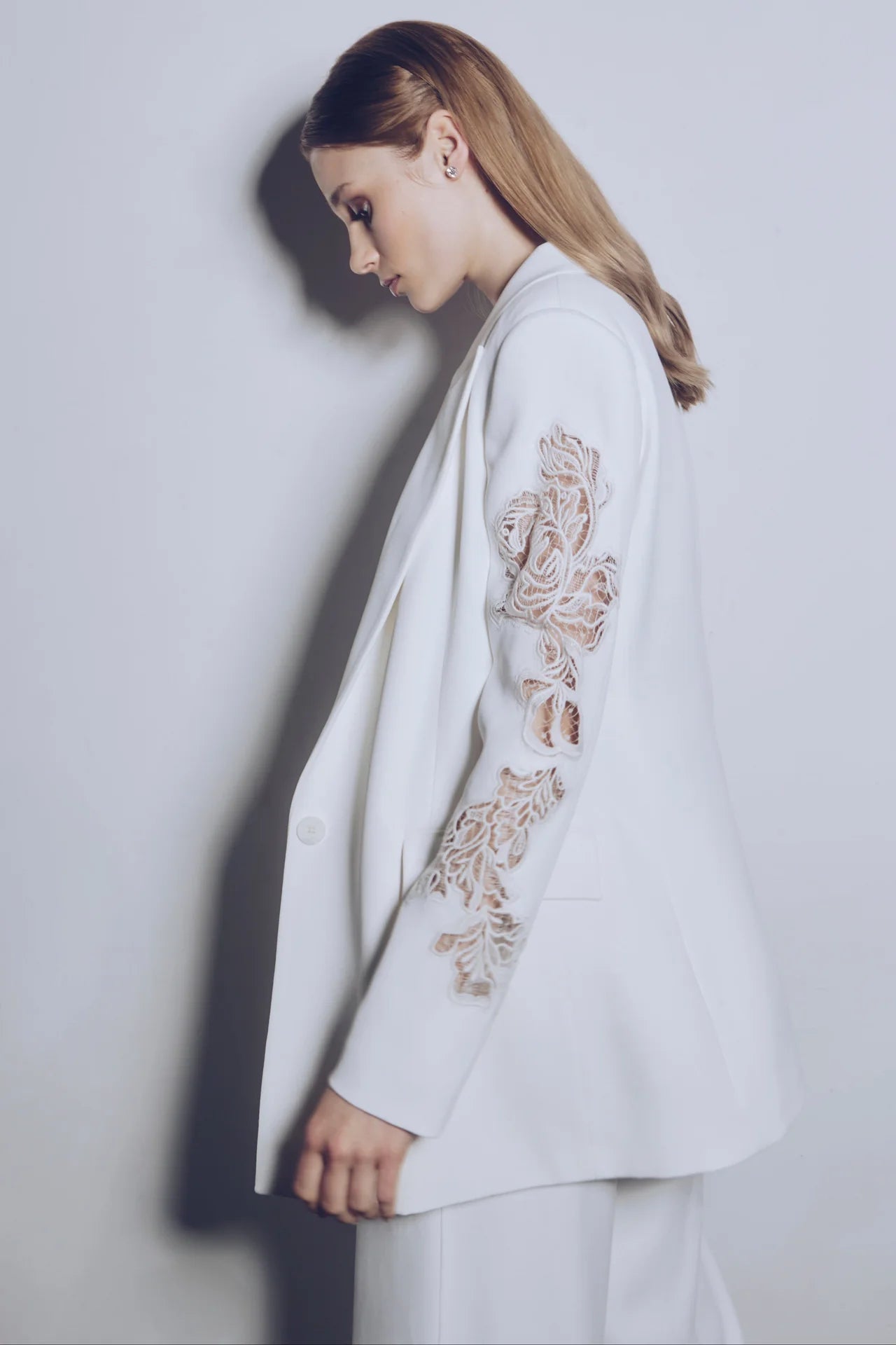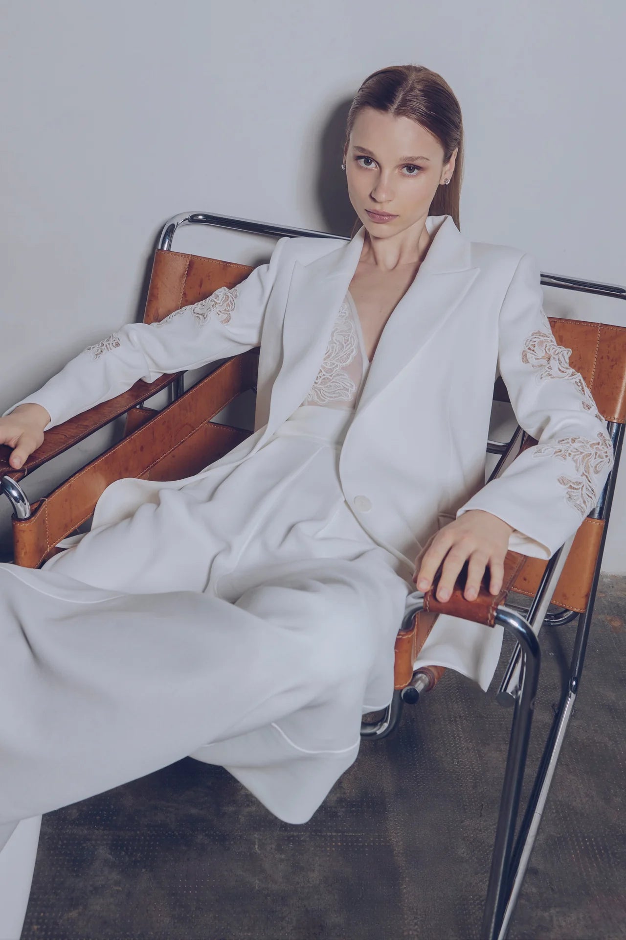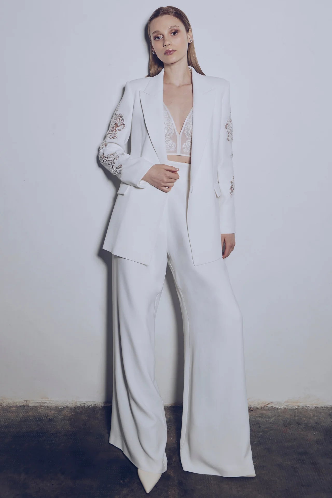 Urban tailored suit in viscose blend cady crepe. Jacket with peak lapels and carved lace, semi-transparent tulle crop top and high-waisted wide-leg trousers. Bold volumes combine with delicate lace for a sophisticated, feminine look.