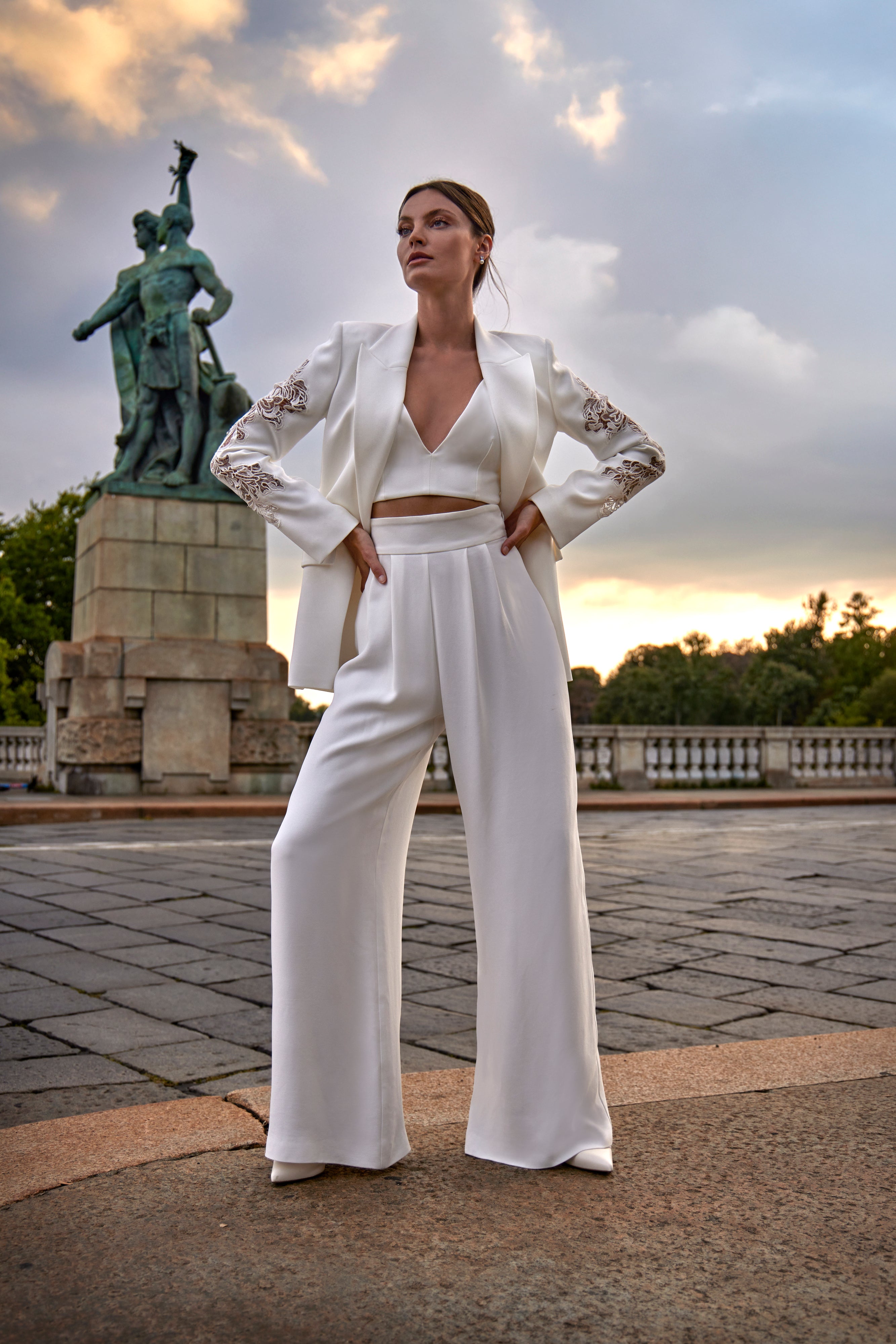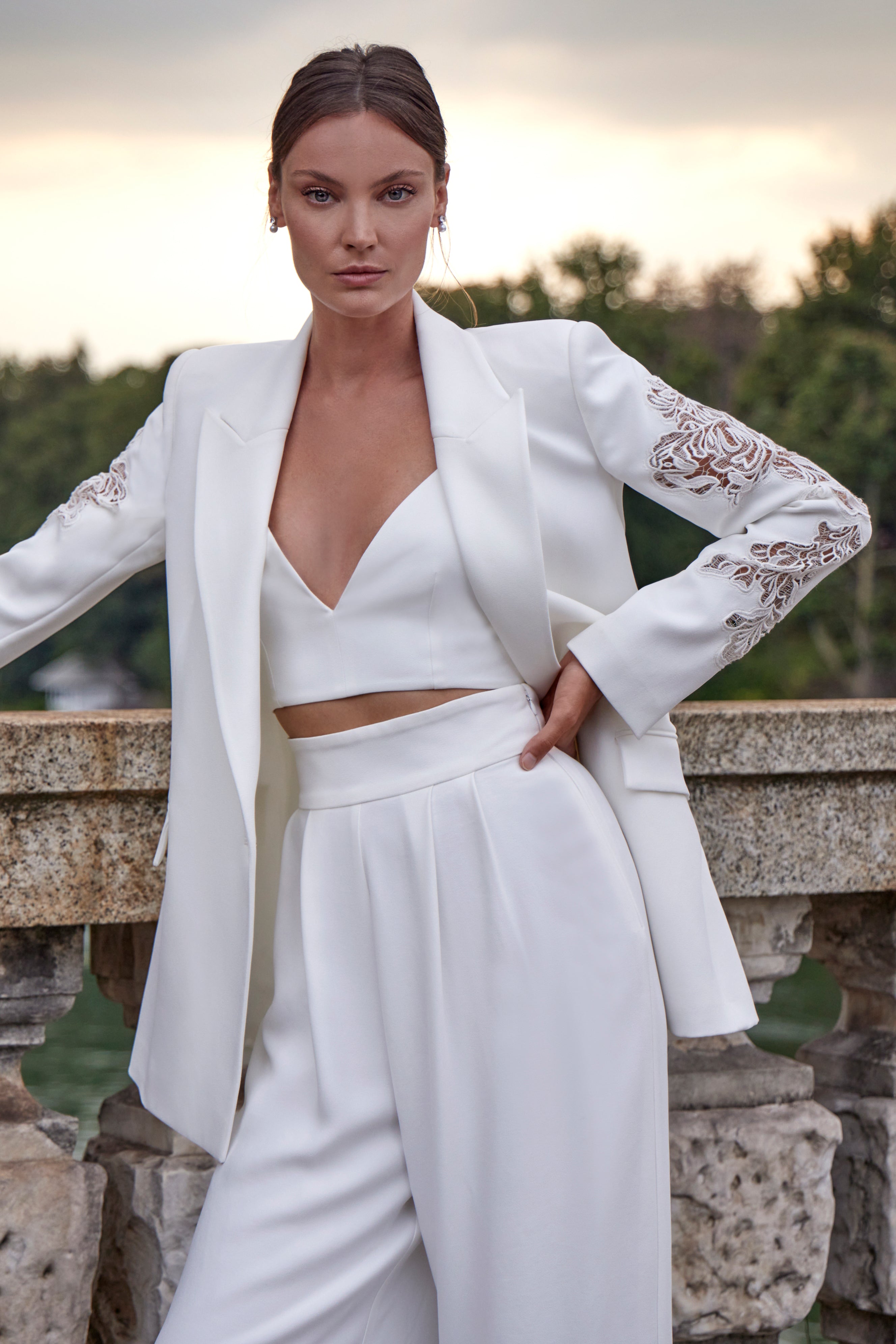 Urban, tailored suit in viscose blend cady crepe. Jacket with peak lapel and lace motifs, crop top and pleated wide-leg pants with high waist. Bold volumes combine with the delicacy of lace for a sophisticated and feminine look.