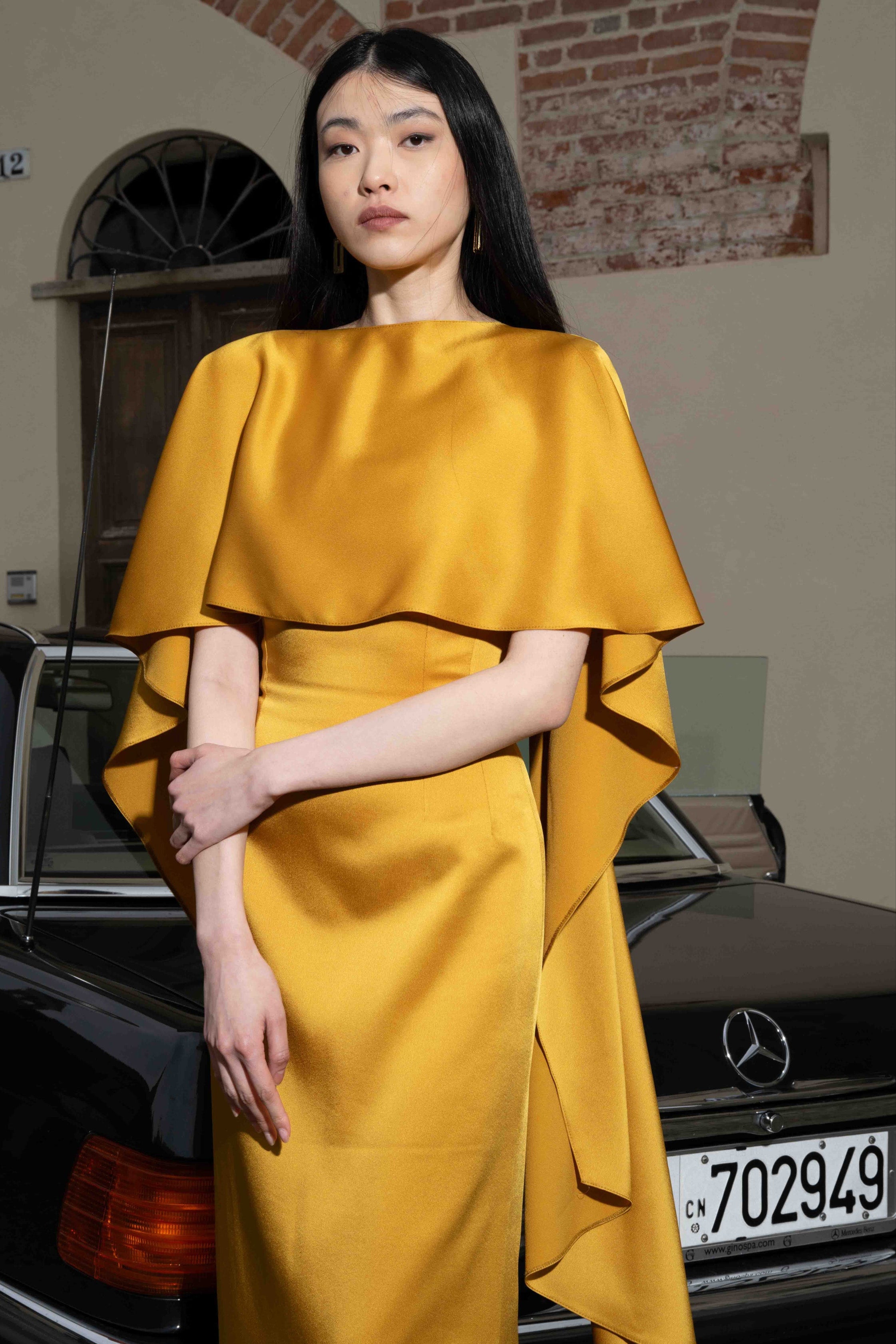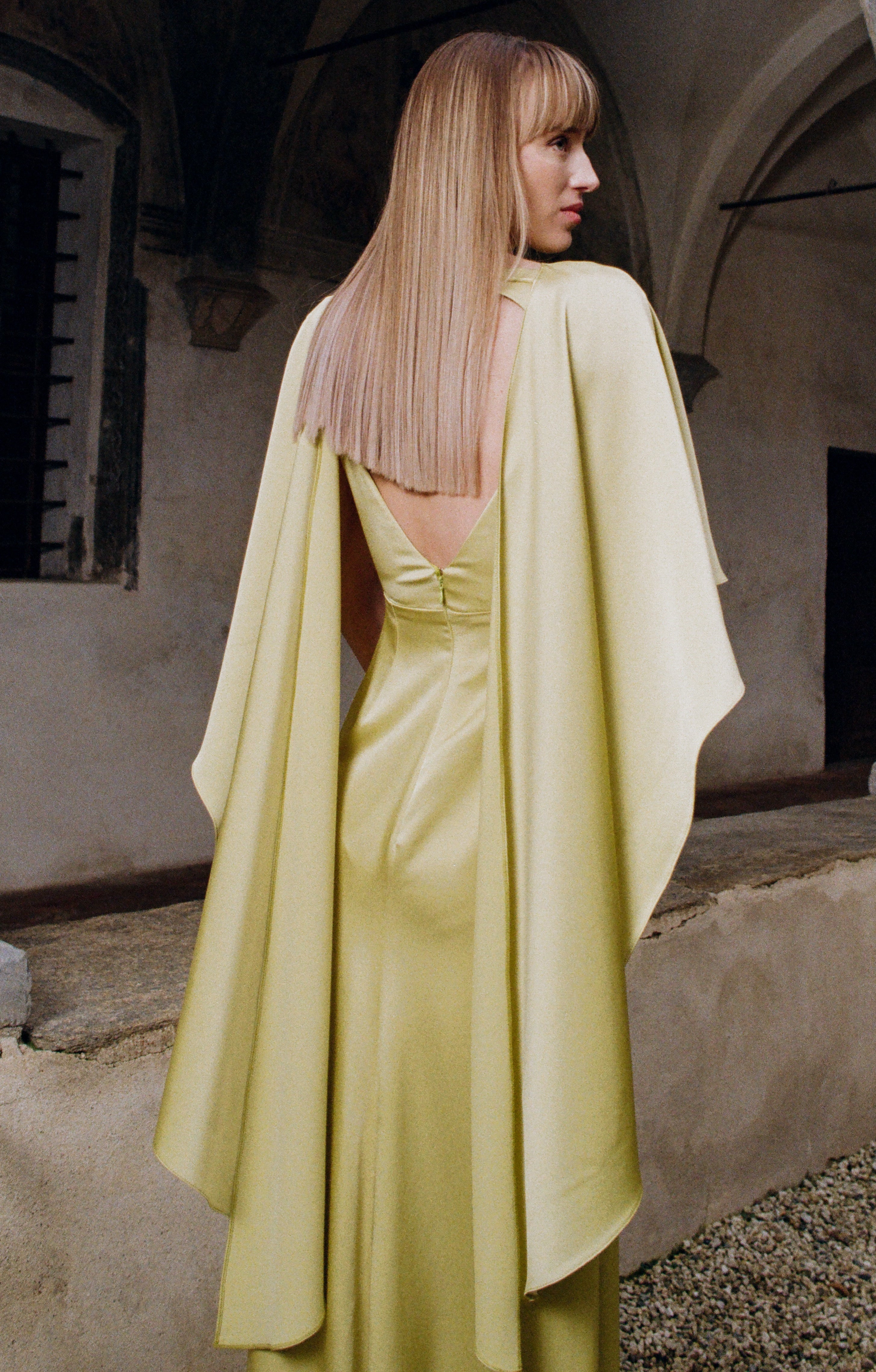 The cape is designed to add a touch of elegance and sophistication to the dress. Featuring an essential and fluid design, it is distinguished by the opening at the back, a sophisticated detail that gives lightness and movement to the silhouette. Perfect for completing the look with style and harmony.