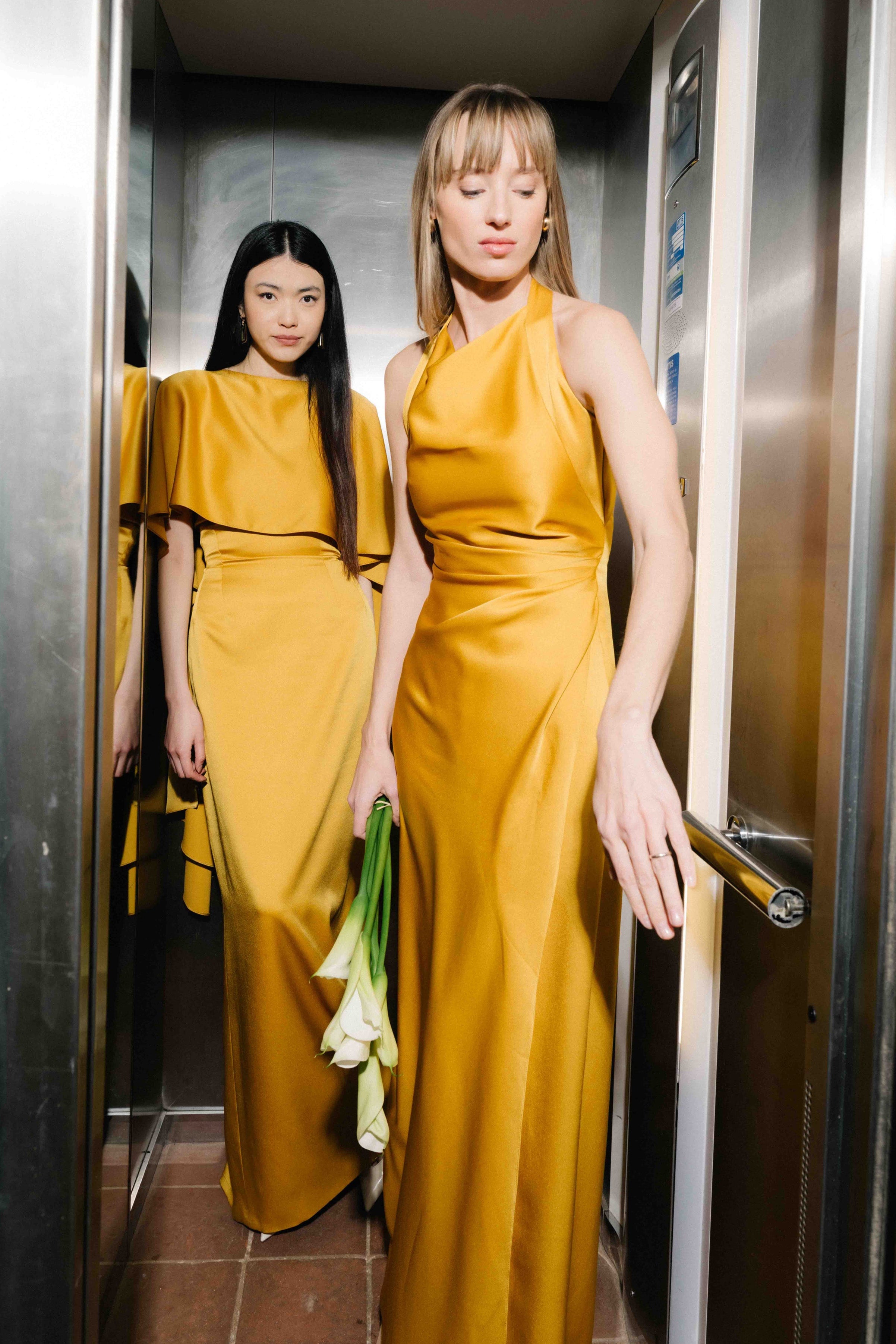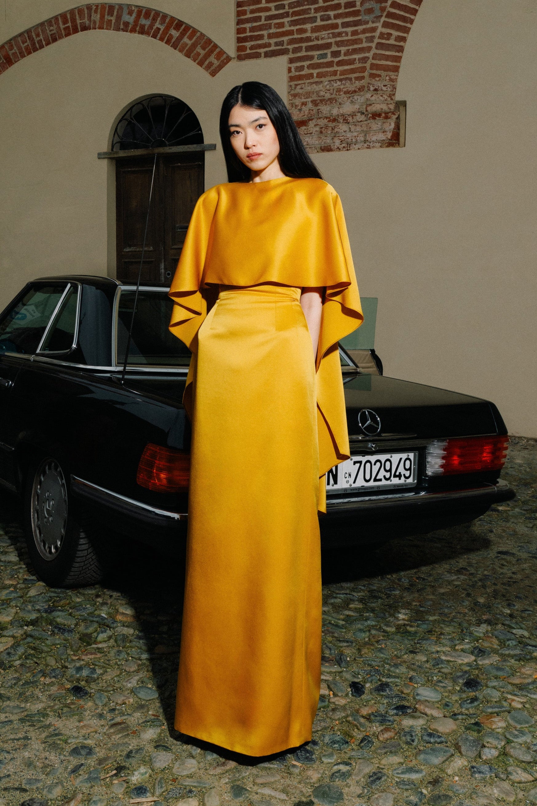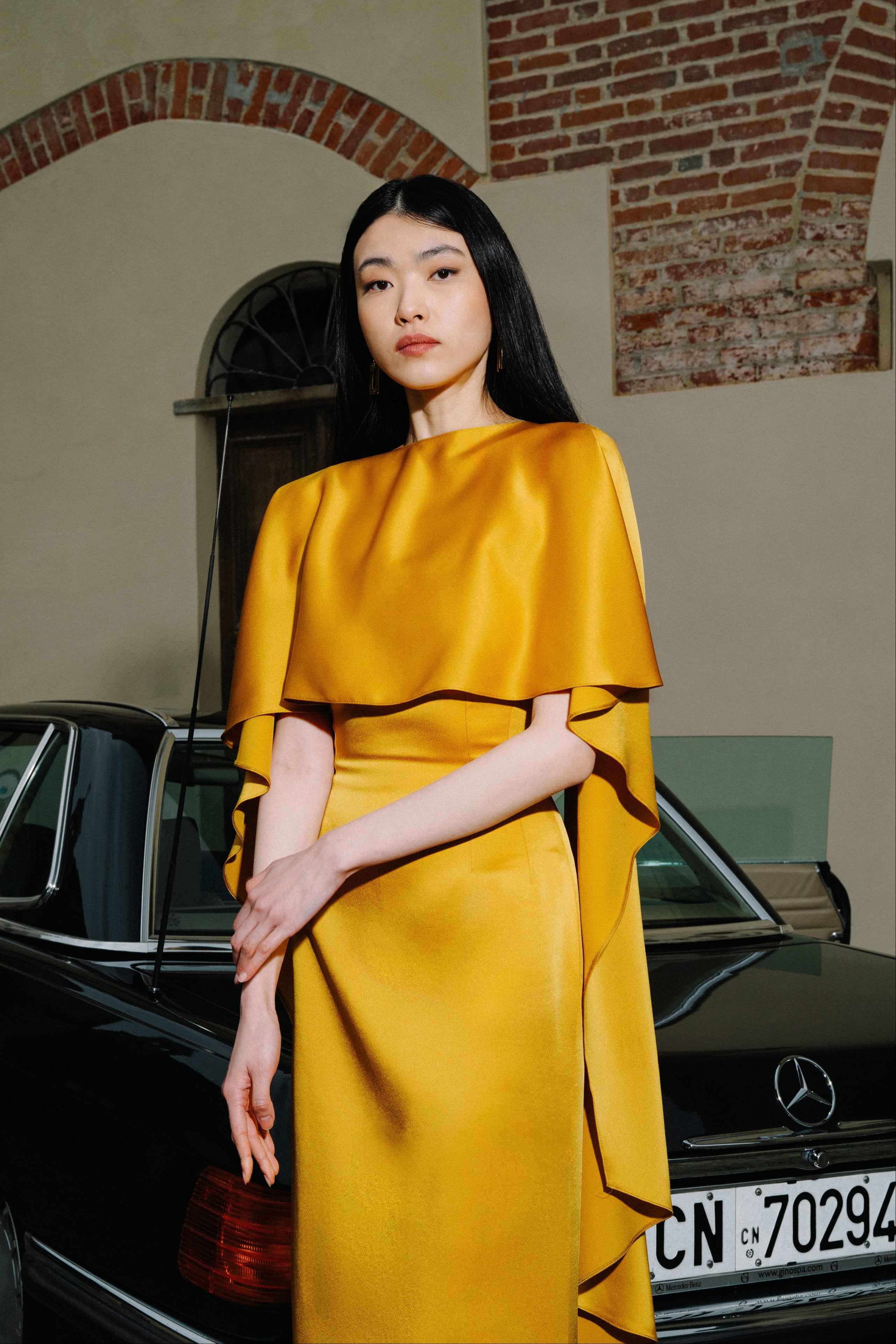 Minimal design sets Margherita apart. Its structured, tailored-cut bodice enhances the purity of the lines, creating a strikingly essential silhouette. The straight neckline elegantly enhances the figure, while the column silhouette lends harmony and grace to every step. A garment of timeless beauty, perfect for those seeking sophisticated simplicity.