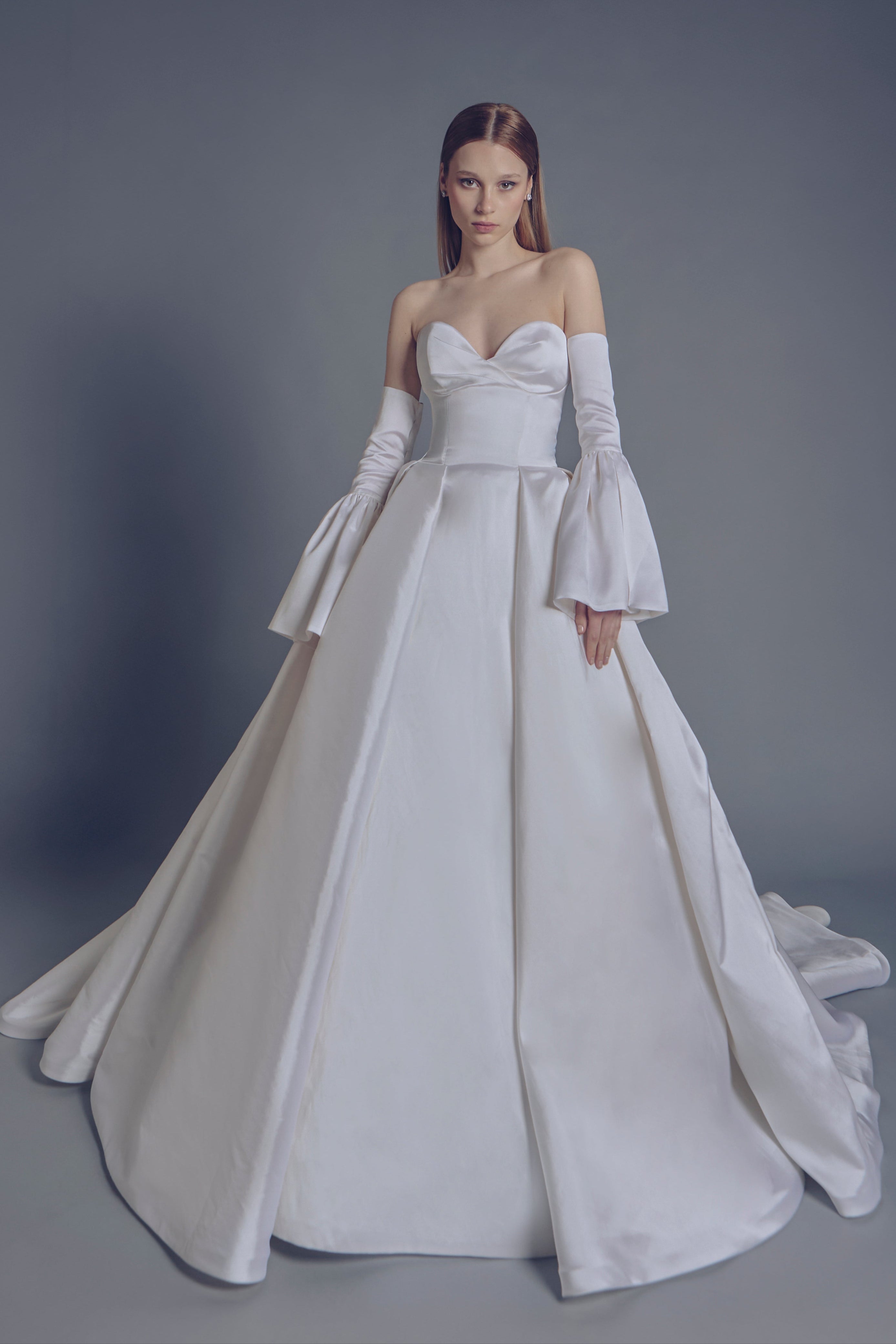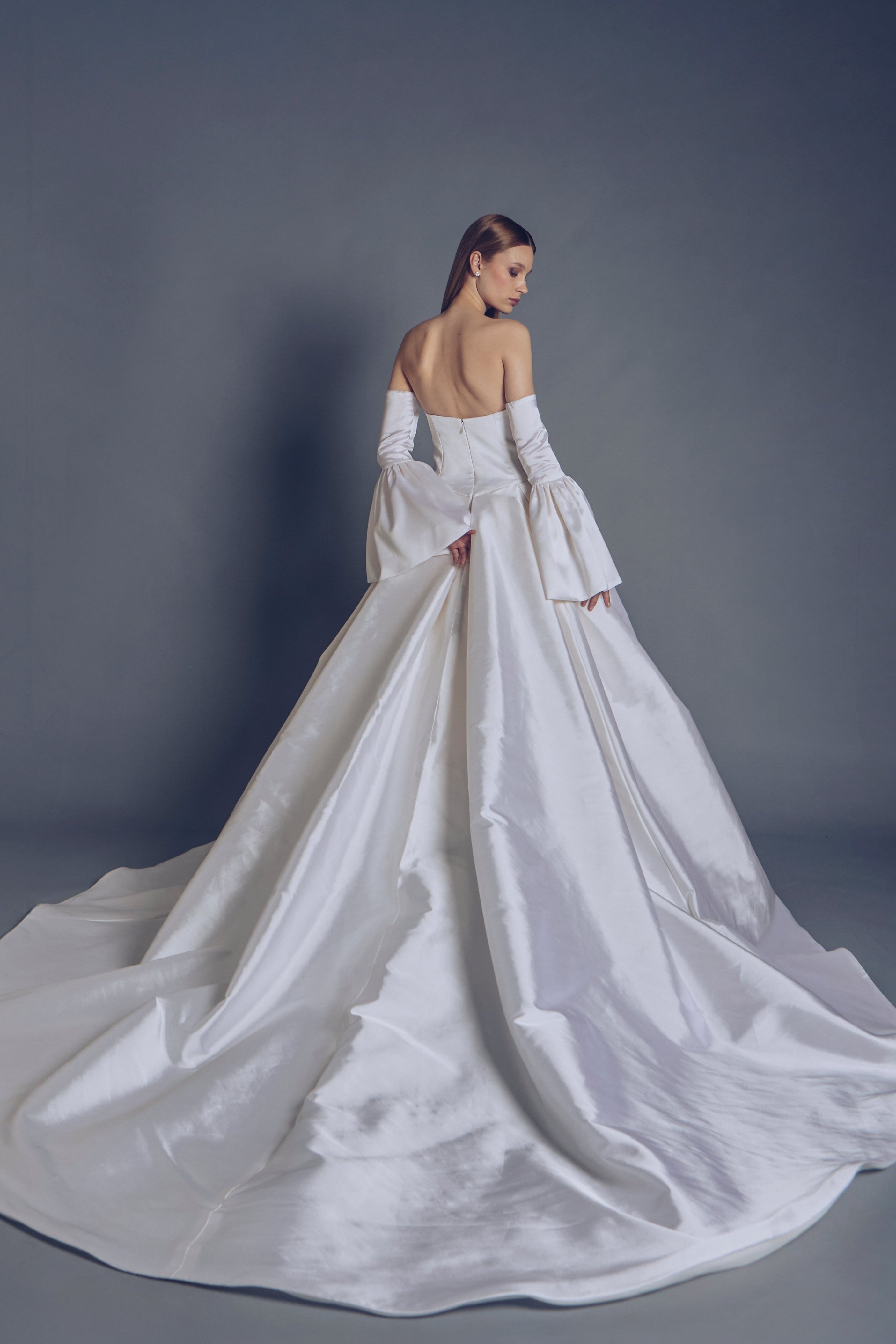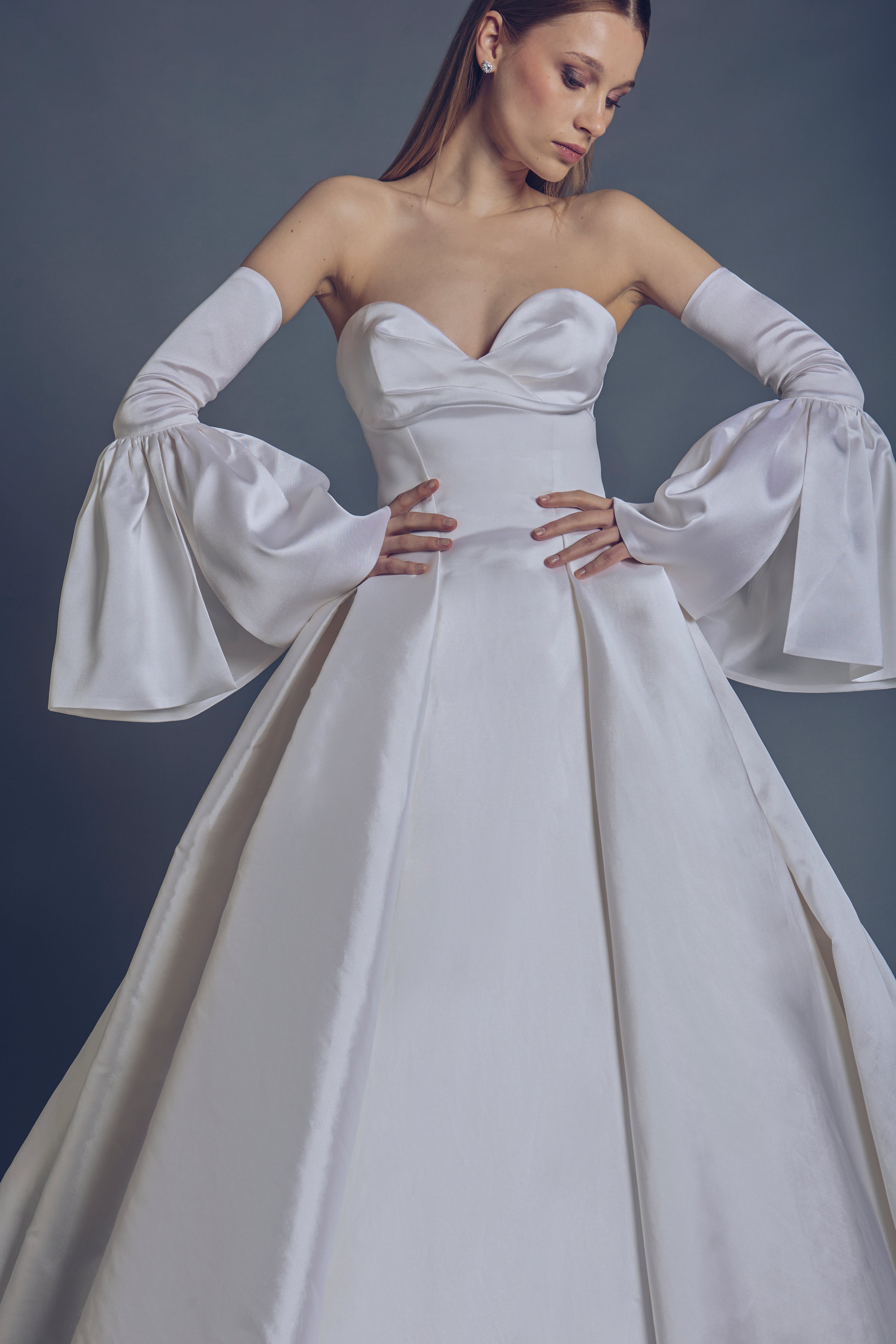 Silk blend mikado princess gown with structured bodice and detachable sleeves. Slightly dropped waist accompanies the folds of the neckline and skirt for a majestic essential look. 200 cm train length.