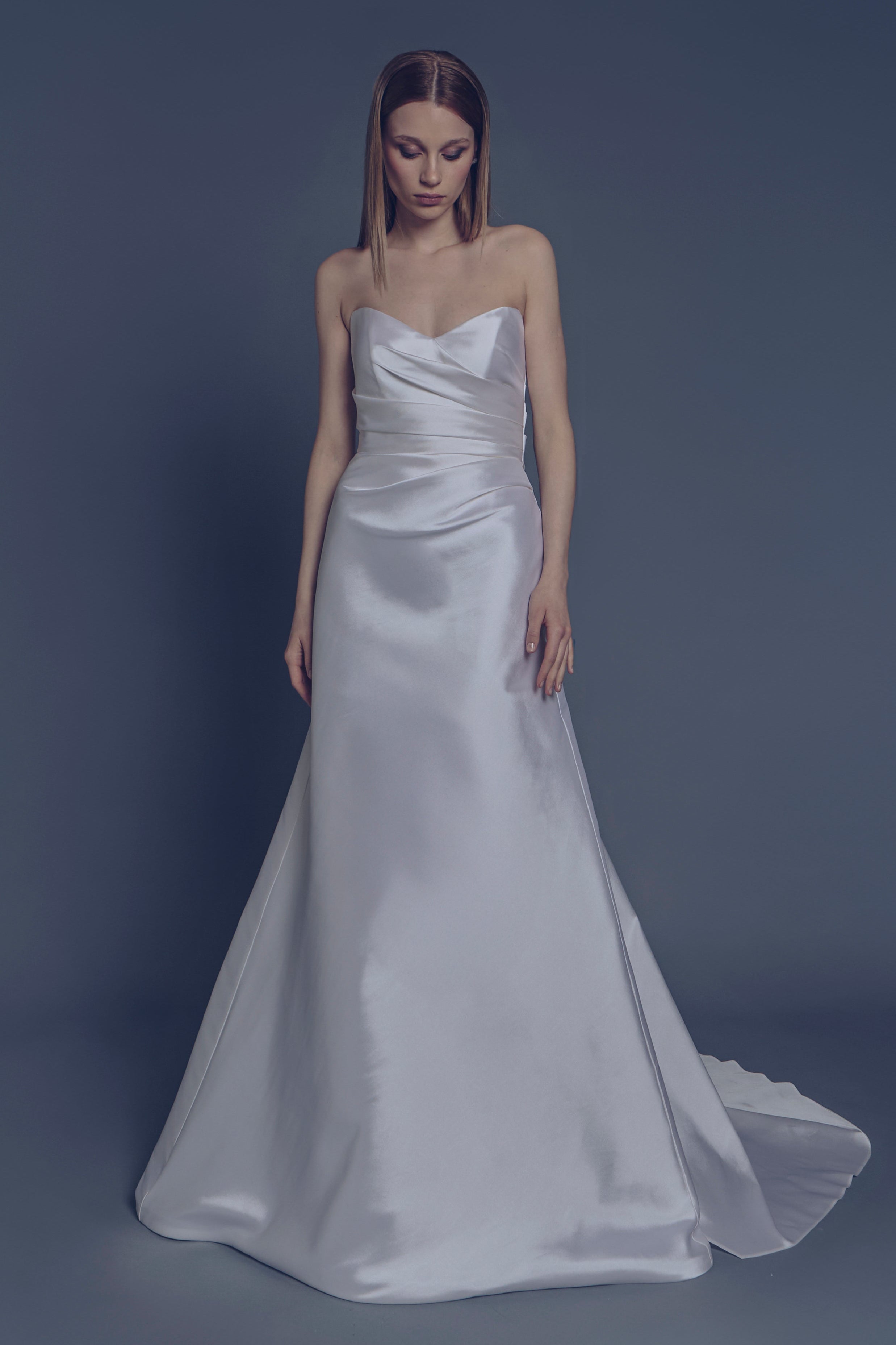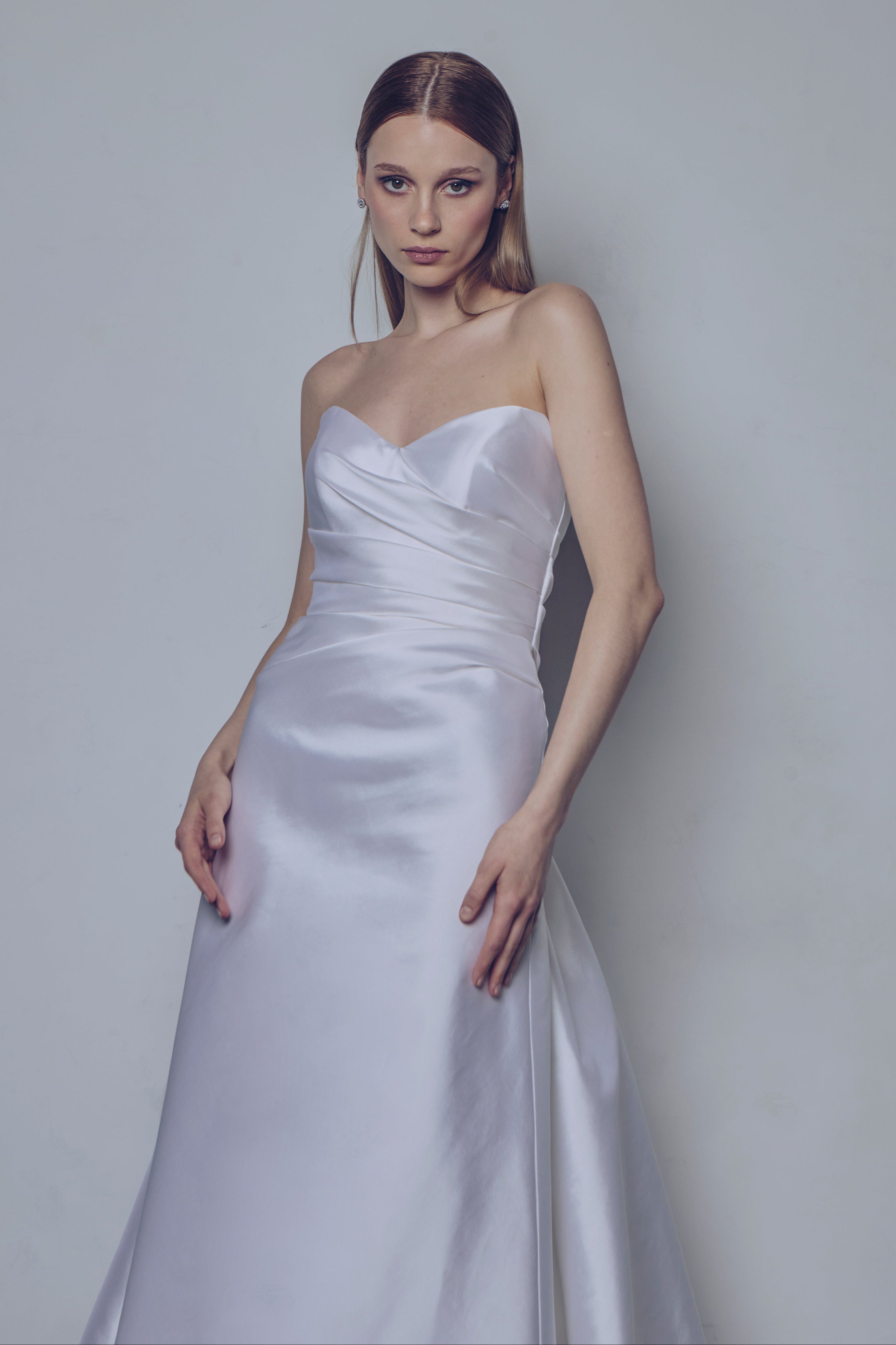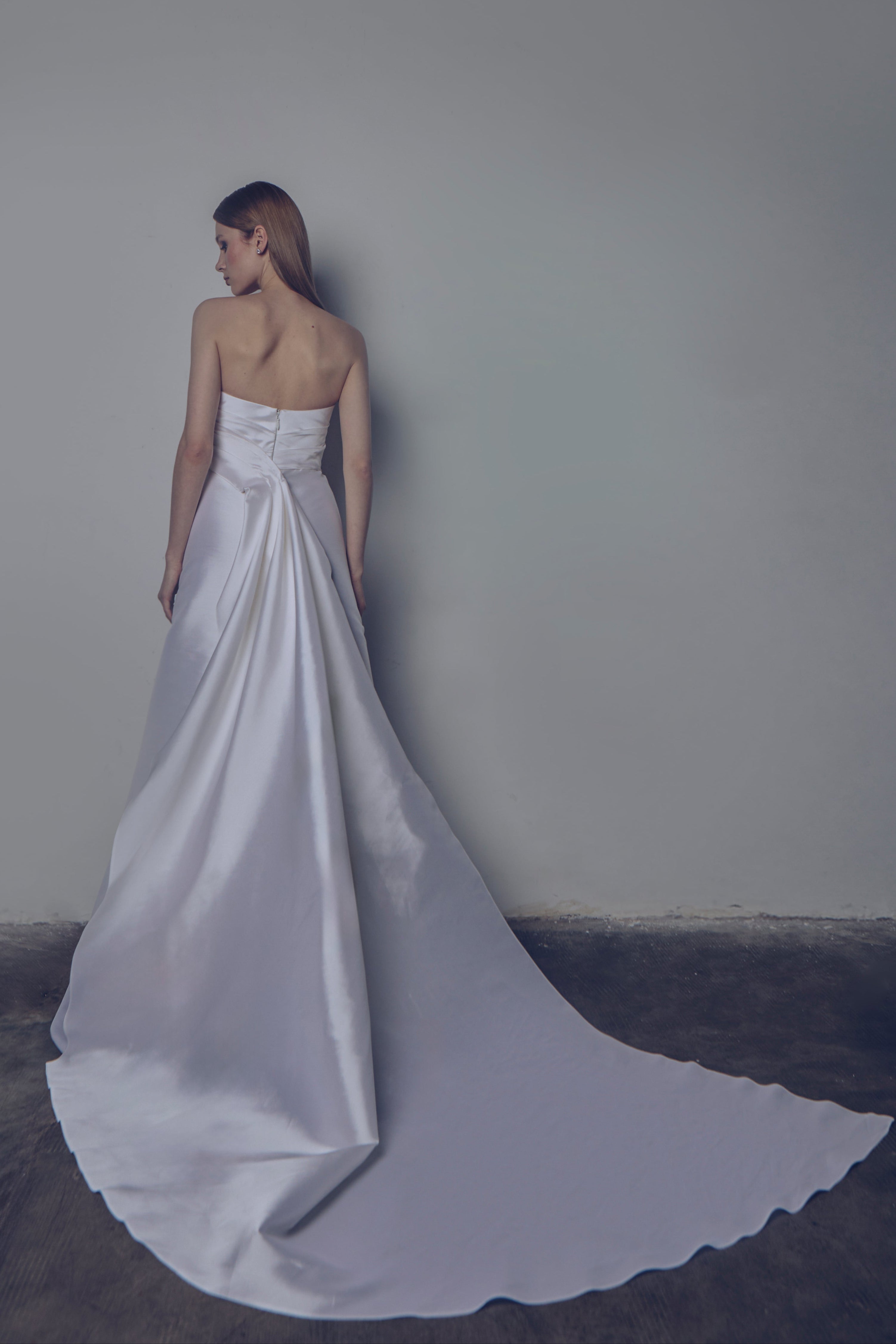 Silk blend mikado fit and flare dress with draped pleats that wrap around the left hip to the tail. Bodice with bones and cups. Hand-fixed pleats draw a contemporary, sculptural profile. 200 cm train length.