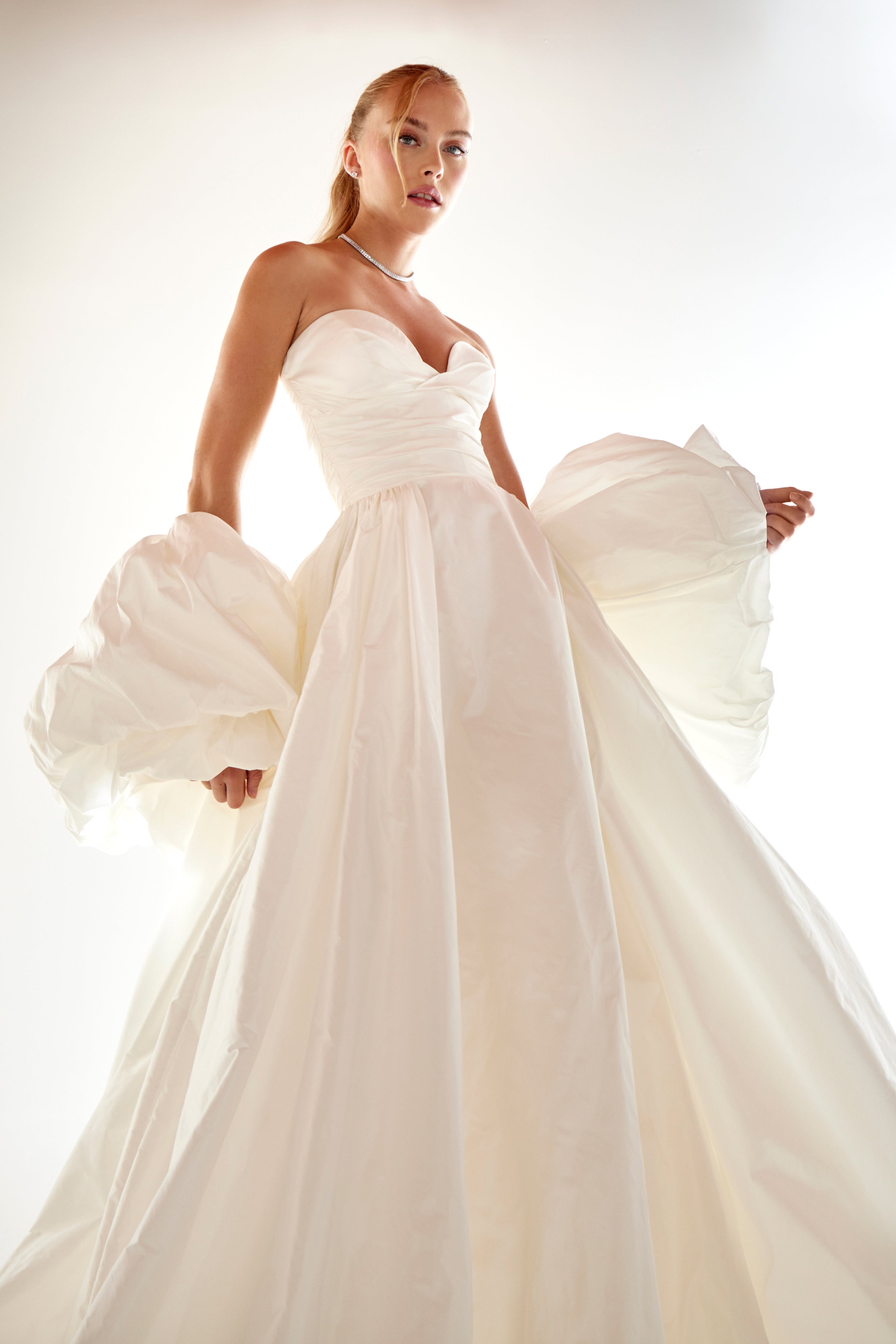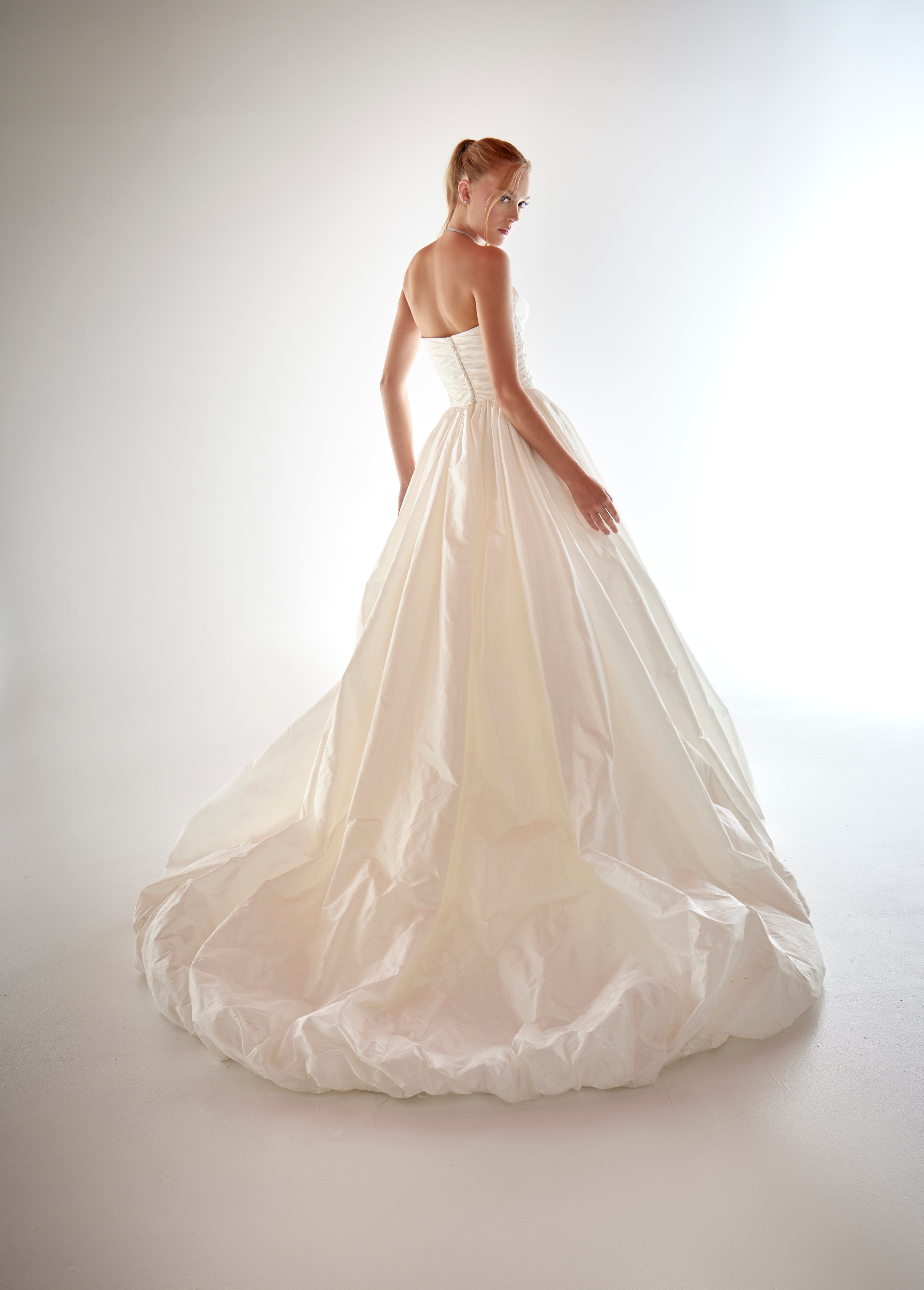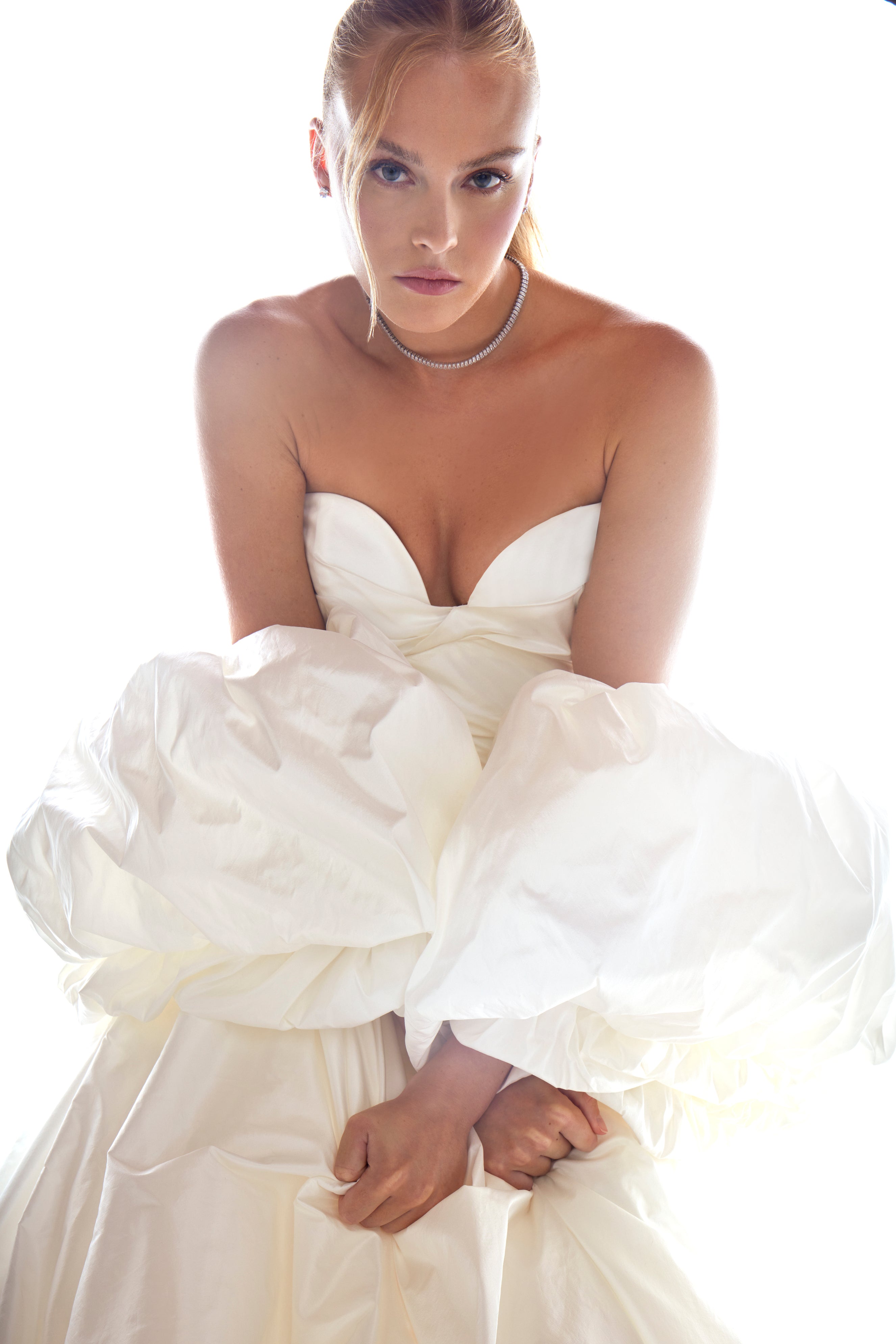 Silk taffeta princess gown with structured corset and wrinkled balloon hem. The volume is sculpted by pleats and ruffles that add lightness and modernity. The wrinkled shawl completes the look with a cloud effect.