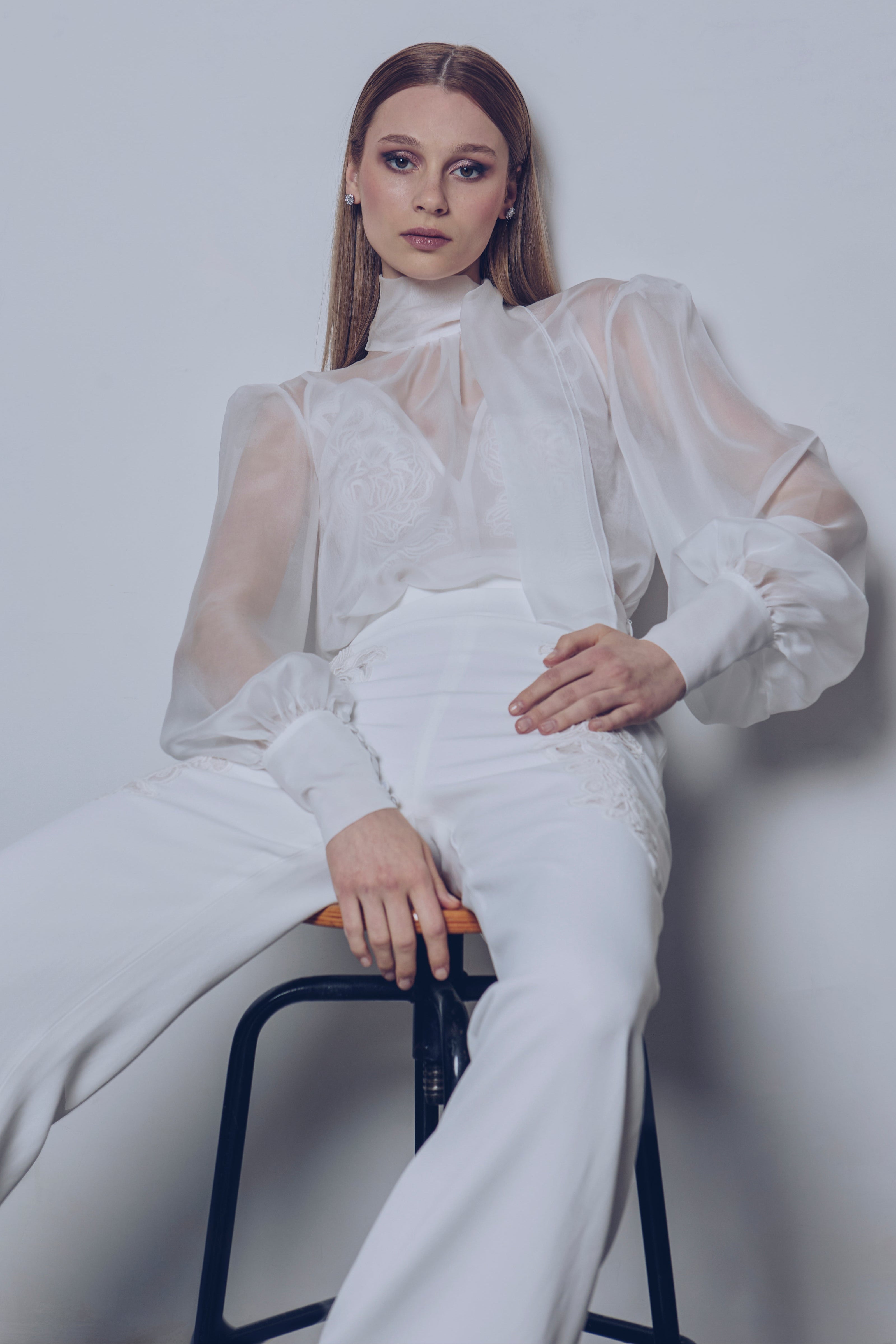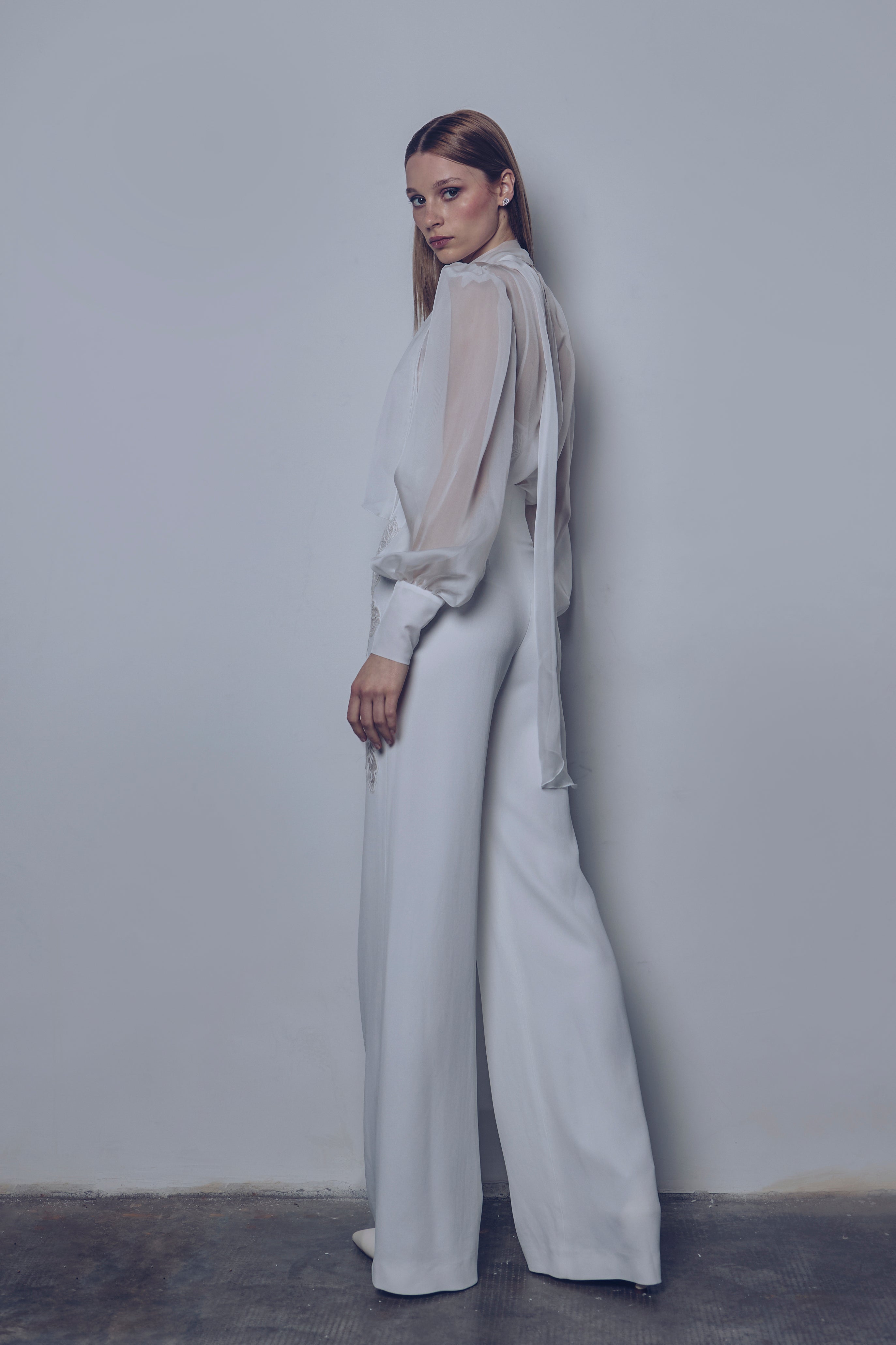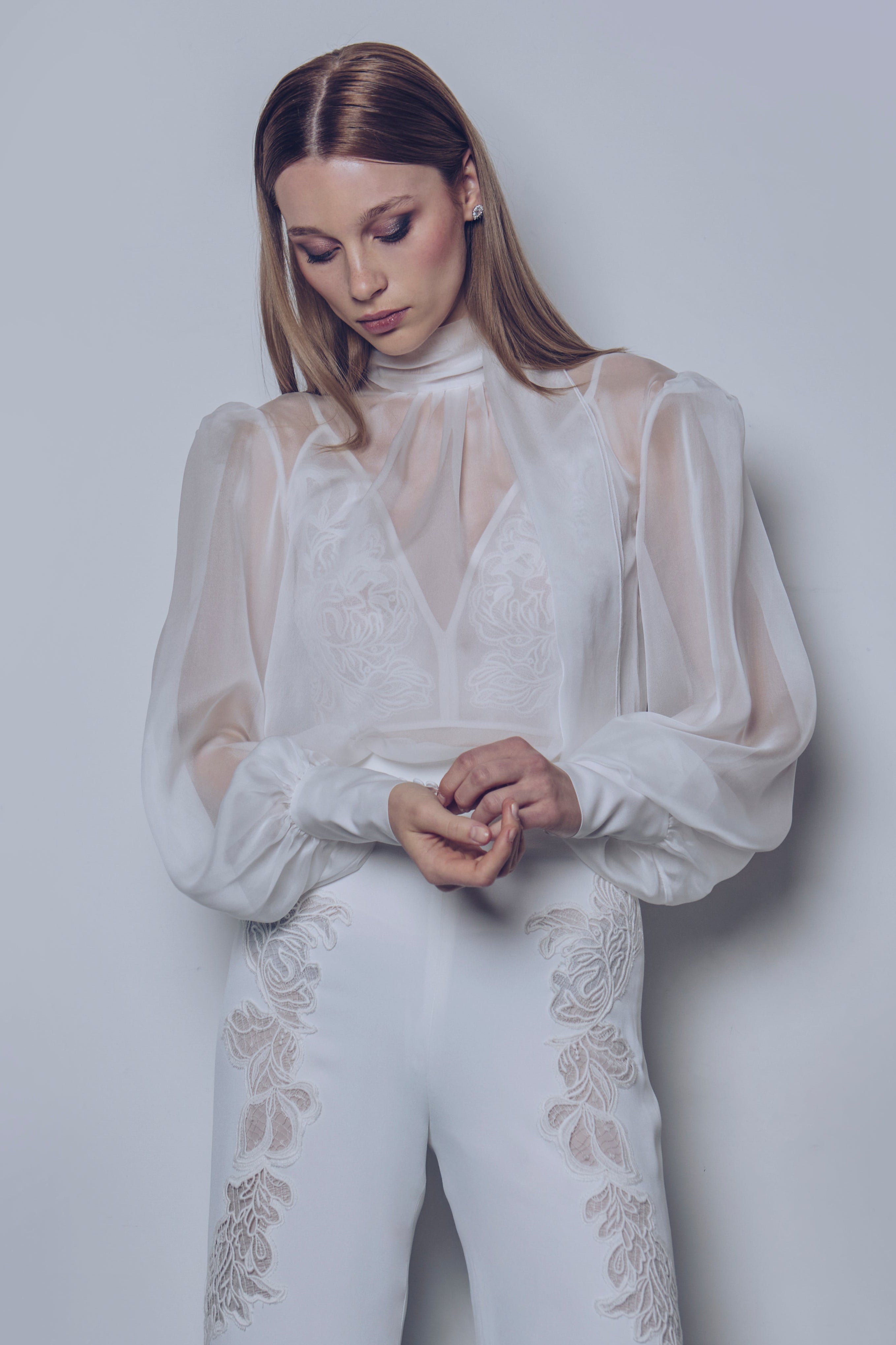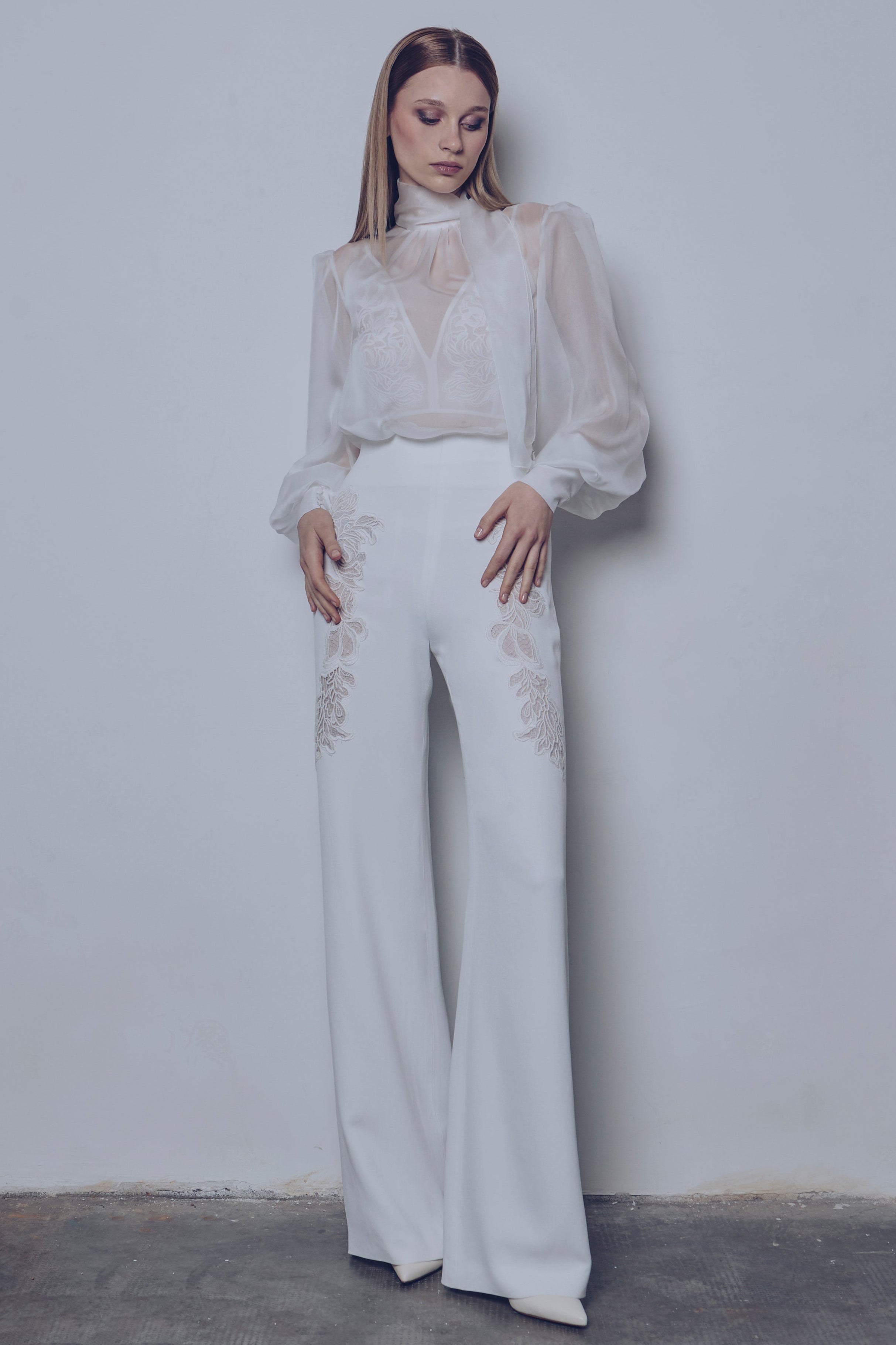 Silk muslin blouse with scarf collar, blouson sleeves and opening at center back. Palazzo pants in cady crepe with high waist and lace motifs applied with inlay technique. Sophisticated ready-to-wear look with playful layering and precious details.